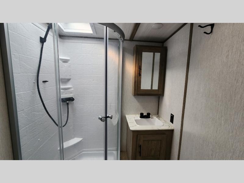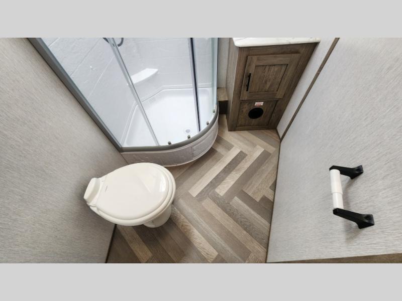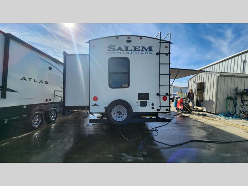 With each Forest River Salem Hemisphere fifth wheel and travel trailer, there are vacuum bonded "Aluma frame" sidewalls and floors, heated and enclosed dump valves and an underbelly, plus an Ivory performance colored exterior fiberglass with Smoked Quartz Metallic accents. A few other features you will love are the 7-way "rain defense" plug holder in the front frame, the extra large pass-through storage, the Hudson Wood agreeable grain cabinetry, and the designer's choice Herringbone Shaw flooring for style and easy clean up!