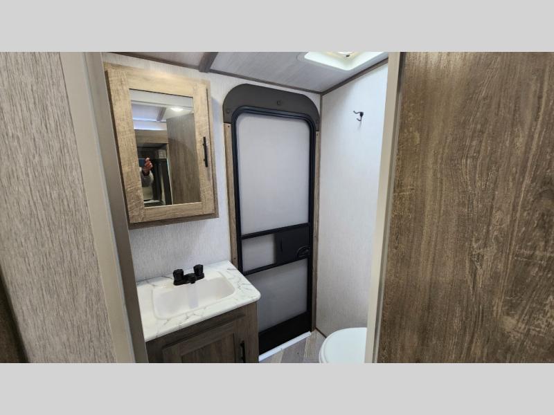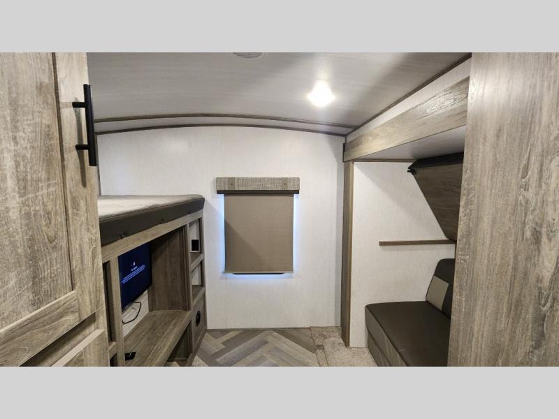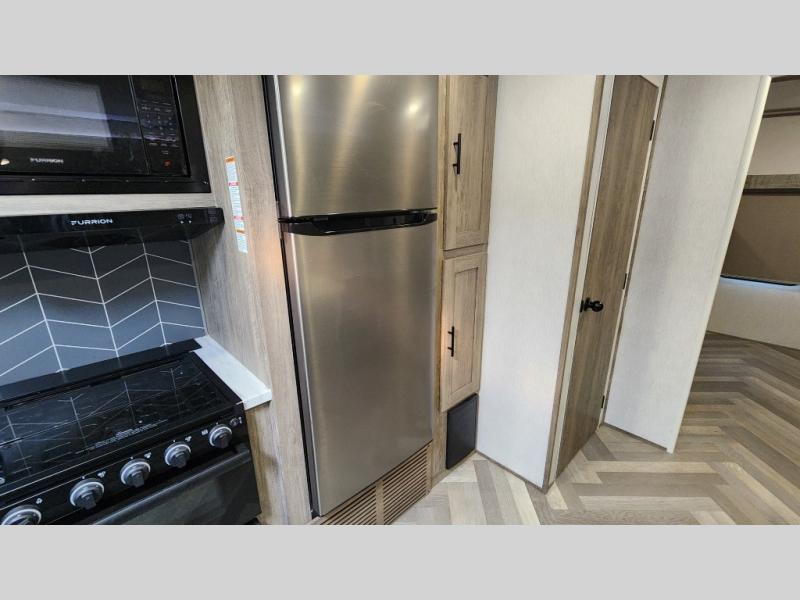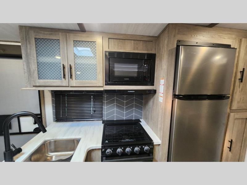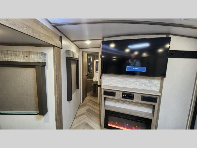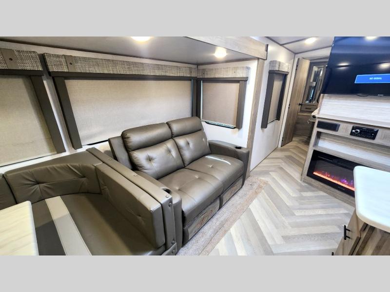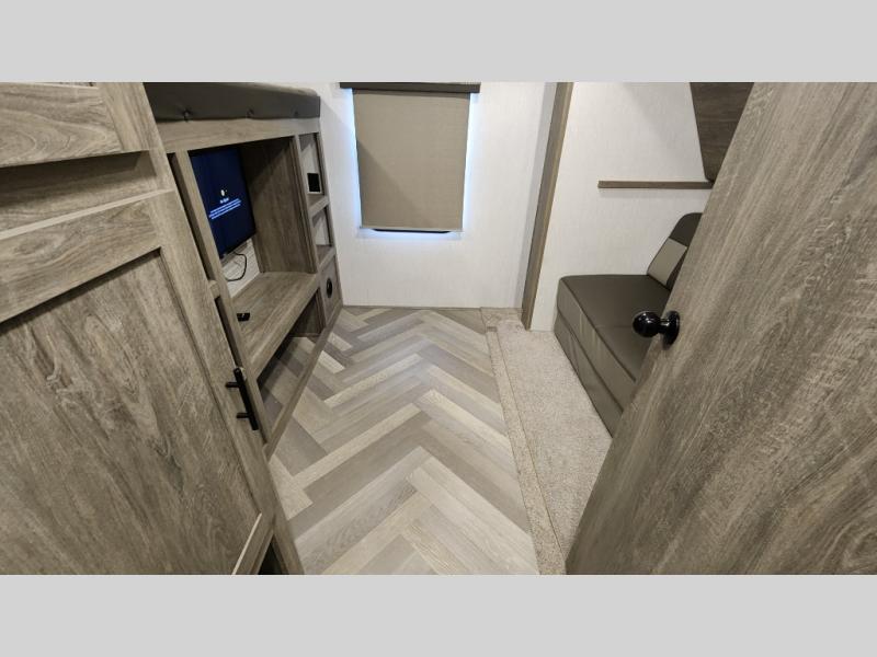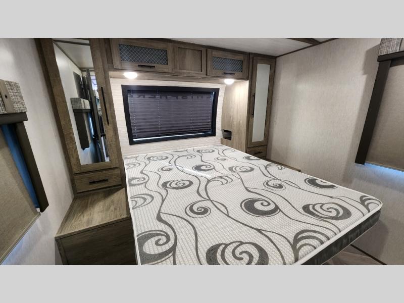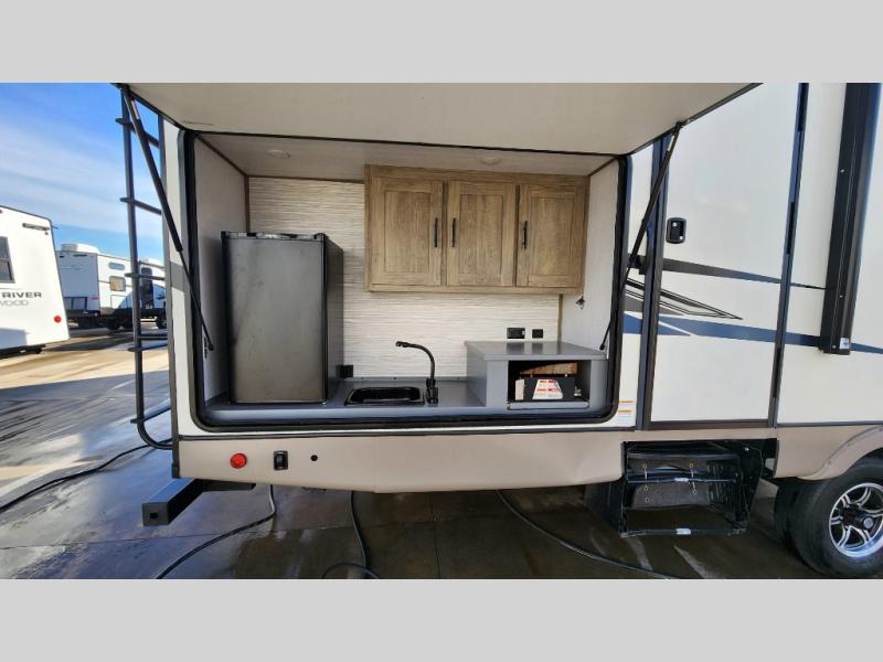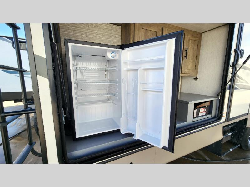 You won't believe all of the luxury features this travel trailer, including double entry doors, a U-shaped dinette, and panoramic windows in the slide out! The chef of your group will love cooking indoors with full amenities, and outdoors with the outside kitchen/bar so they can breathe in some fresh air while they sip on their favorite drink. The kids or your friends will love having their own private bunkhouse with a bunk above an entertainment center with storage below, and another bunk above a Versa queen convertible bed/sofa, and you will love resting on the queen bed in the front private bedroom. There is also a Texas-sized pass-through storage area big enough for your camping gear too!