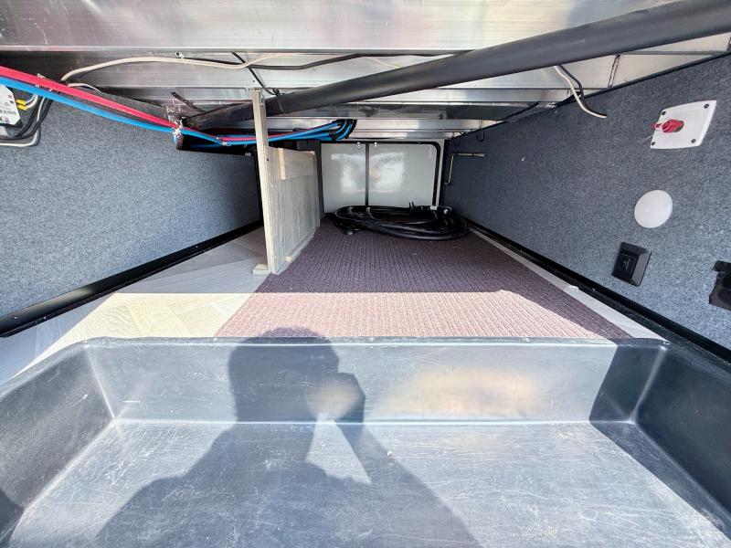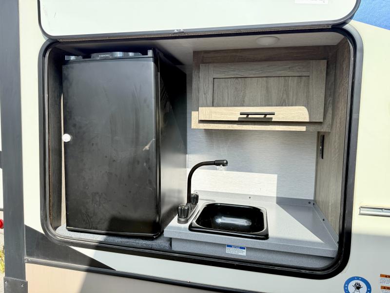 It's time you start camping the right way with this fifth wheel! You're going to love everything from the kitchen island to the outside kitchen/bar, spray port, and the Texas-sized pass-through storage area for all your camping gear. The front private bedroom has a custom king bed for you to enjoy a good night's rest each night and a full wall wardrobe that even has an area prepped for the optional washer and dryer to be added. You can start the day refreshed and ready to go after taking a hot, relaxing shower in the residential walk-in shower with a skylight above. The middle bunkhouse comes standard with a bunk above a Versa queen convertible bed/sofa, a dresser and a wardrobe, and a loft above!