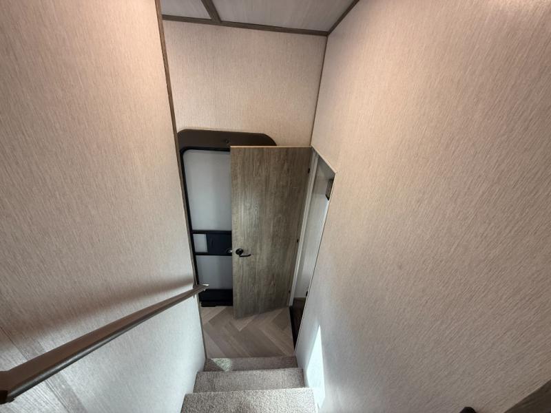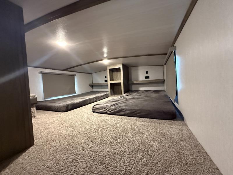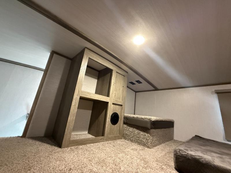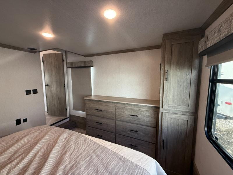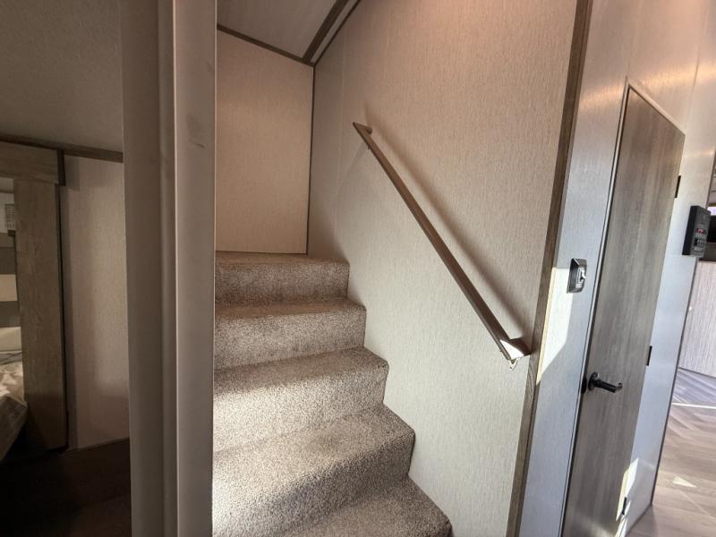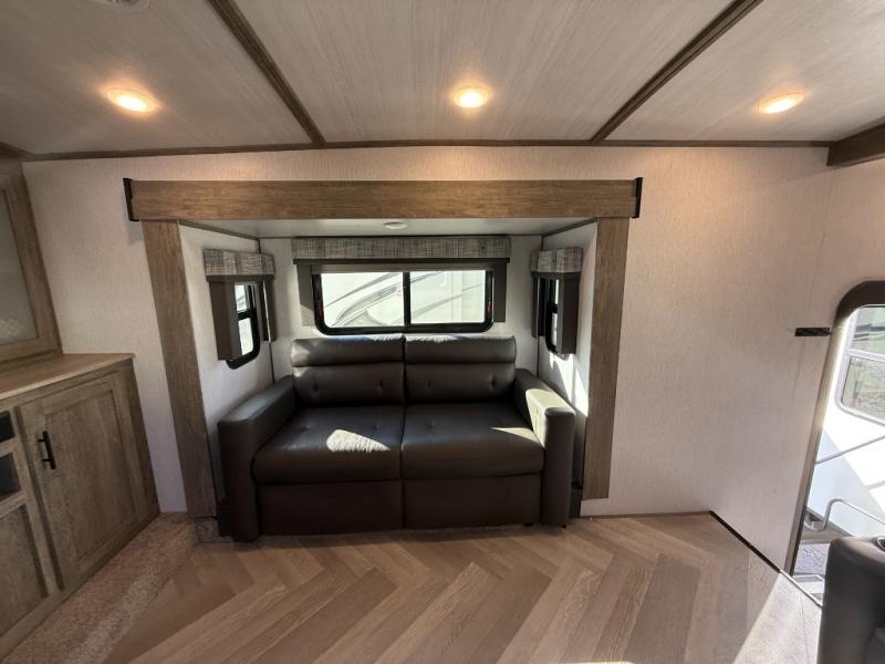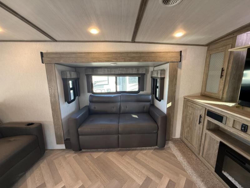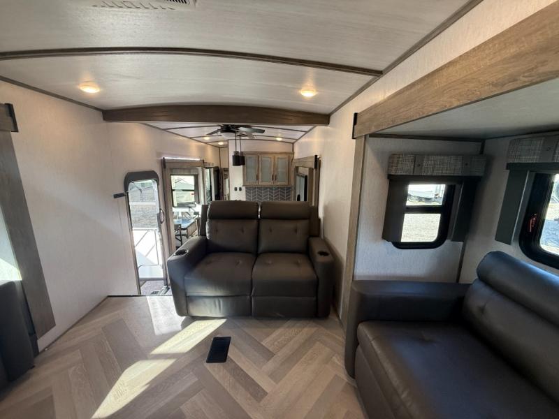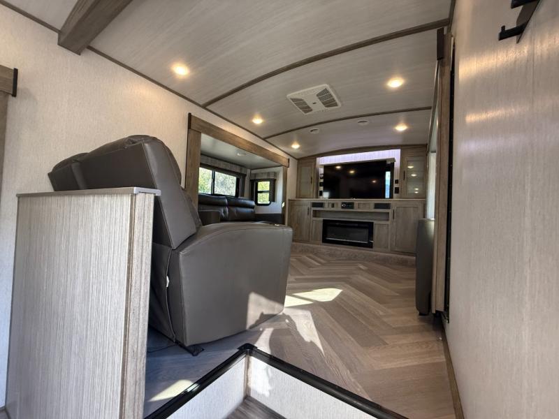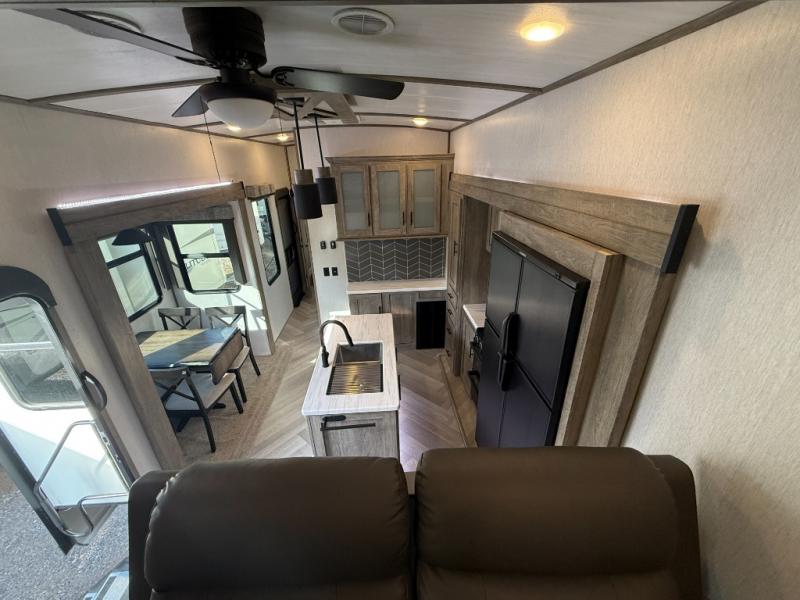 This fifth wheel is decked out in features you're going to love from the front separate living area to the Texas-sized exterior pass-through storage area! The two tri-fold sofas can convert into sleeping space and the reclining sofa is the perfect place to relax while you watch your favorite movie on the 50" LED TV. The kitchen island not only makes meal prepping easy, but cleaning up just as easy with the large sink. Everyone will enjoy getting ready each morning in the full bathroom with the residential walk-in shower and a vanity sink next to it. The rear private bedroom has everything you will need to feel right at home with the custom king bed, the wardrobe that is prepped to add the optional washer and dryer, and the large panoramic window on the rear wall to let in some morning sunlight. Plus, there are stairs just outside the bedroom that lead up to the loft with two mats and storage areas!