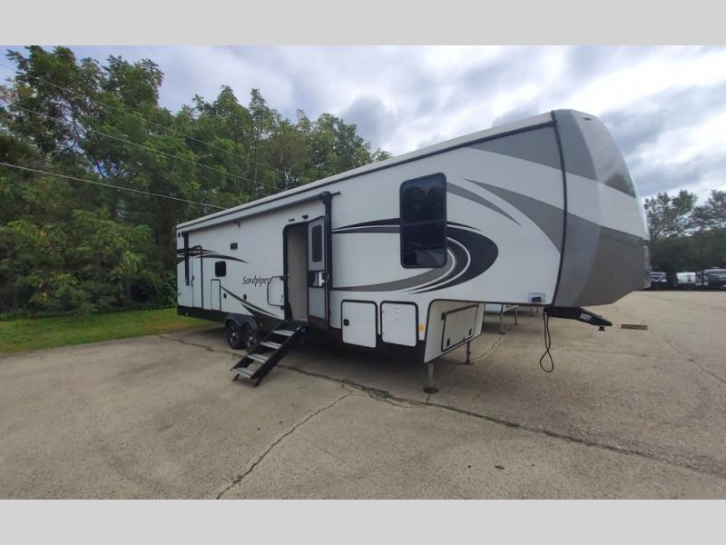 You will find the perfect balance of size, space, features, and luxury with any one of these Forest River Sandpiper fifth wheels! They are constructed with a welded aluminum framed vacuum bonded laminated superstructure, a cambered powder coated frame with rust prohibitor, and a fully enclosed underbelly to protect the units vitals during any season. The large tinted windows come with a 80/20 UV prohibitor and the unobstructed pass-through storage area is big enough to store all of your outdoor gear. You will be able to see clearly even outside at night with the porch light that has an interior switch and the One Touch Dometic electric awning with a LED light strip. The interiors are designed with modern décor, rustic wood plank linoleum, and stainless steel appliances. Don't pass up your chance to camp in true luxury, come find your model today!