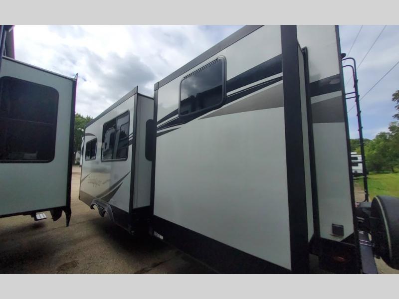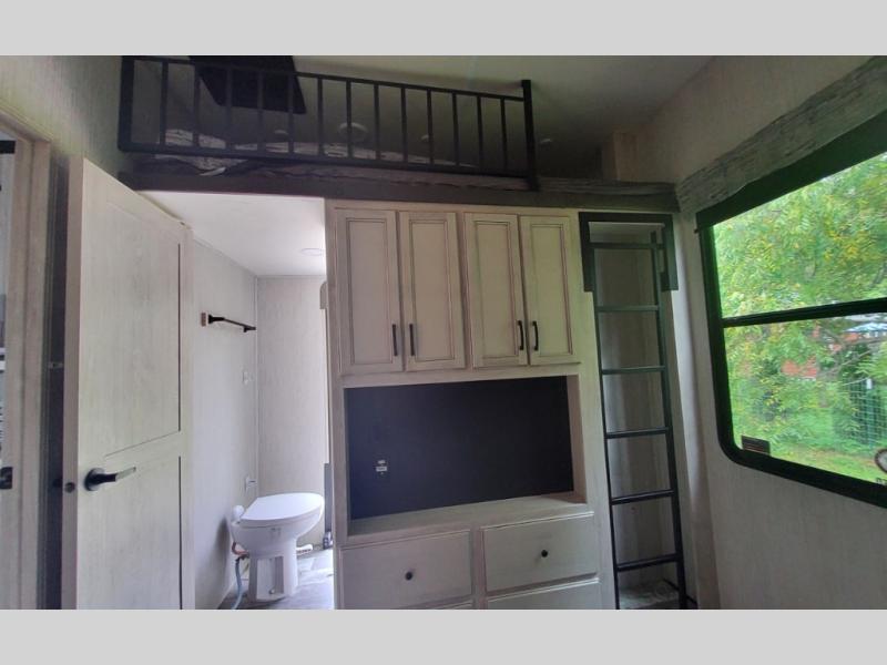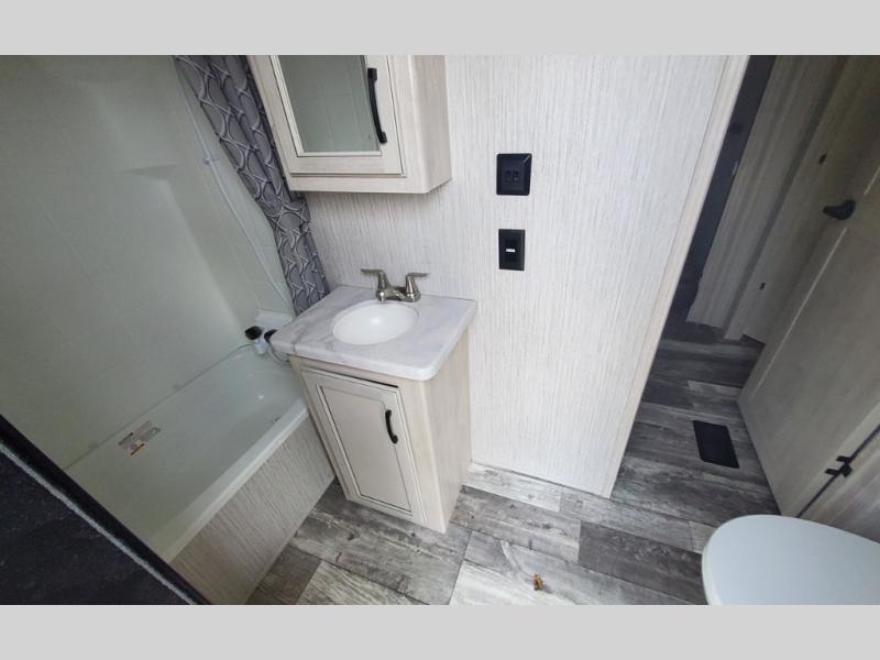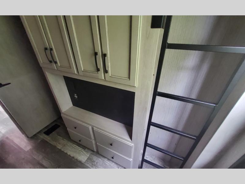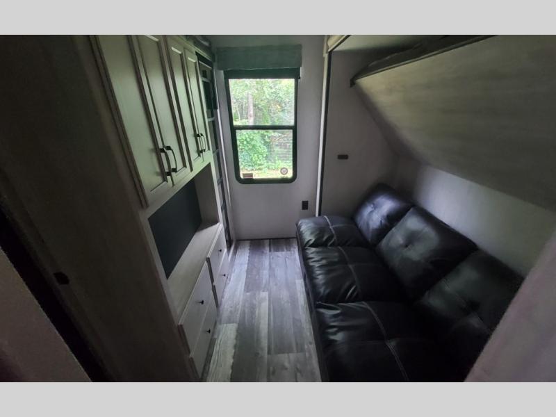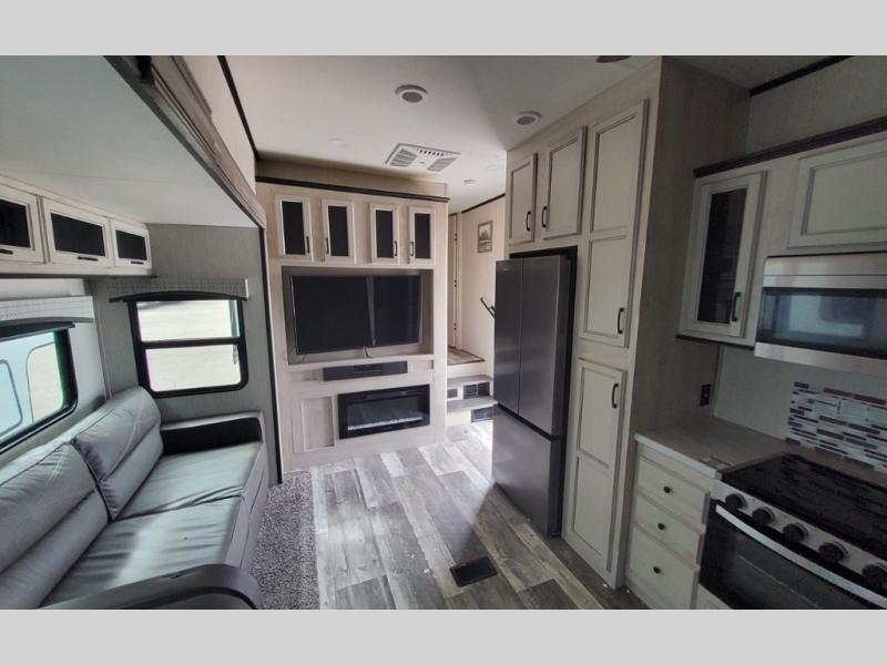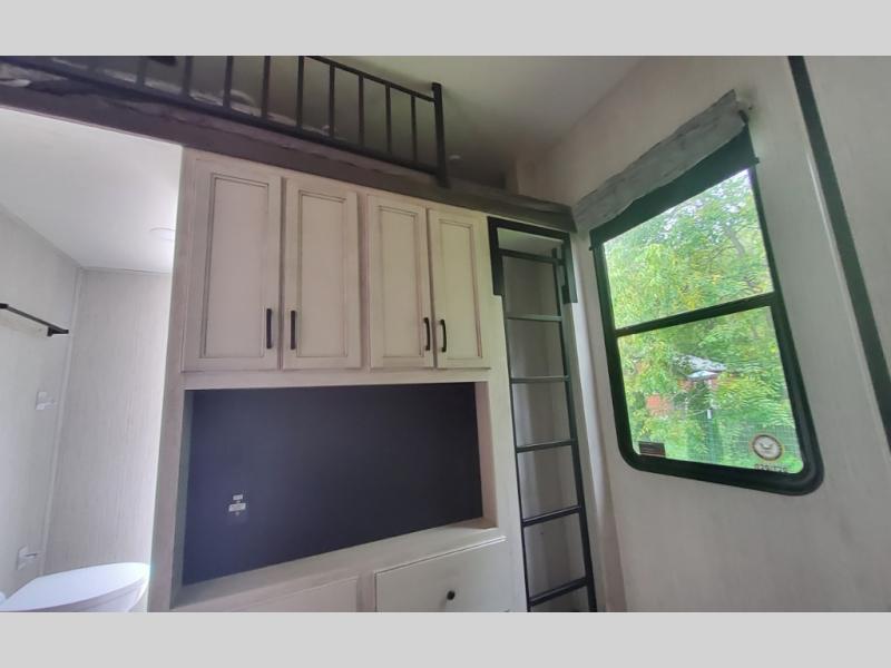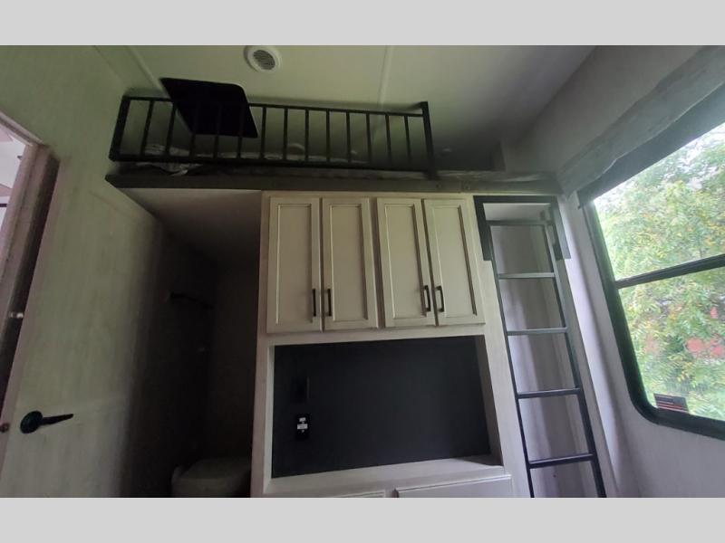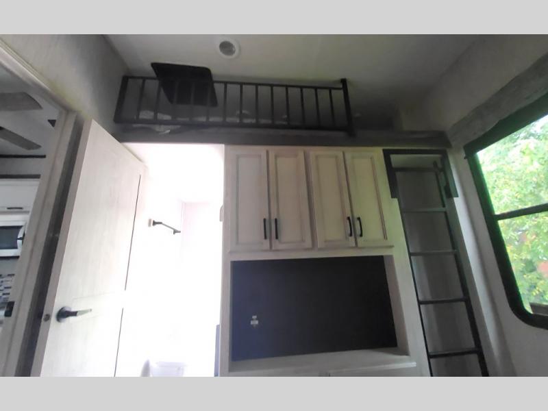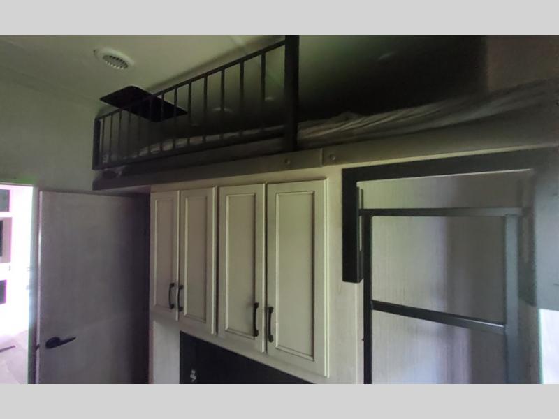There is something for the whole family with this fifth wheel! From the rear private bunkhouse with a bunk bed above a glide sofa across from a TV cabinet/wardrobe to the two full bathrooms, one of which has an entrance/exit door to the unit and to the bunkhouse. The chef can whip up a delicious meal inside with the four burner cooktop or head outdoors to use the bumper mount swivel gas grill. Grab a snack from the full size pantry and head to either the tri-fold hide-a-bed sofa or booth dinette to watch a movie at the entertainment center with a fireplace below. When you're ready to wind down your nights, head to the dual entry bathroom to take a hot shower in the radius shower then walk directly into the front private bedroom to grab your pajamas from the wardrobe/linen slide and enjoy a good night's rest on the queen bed!