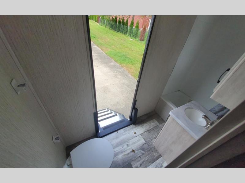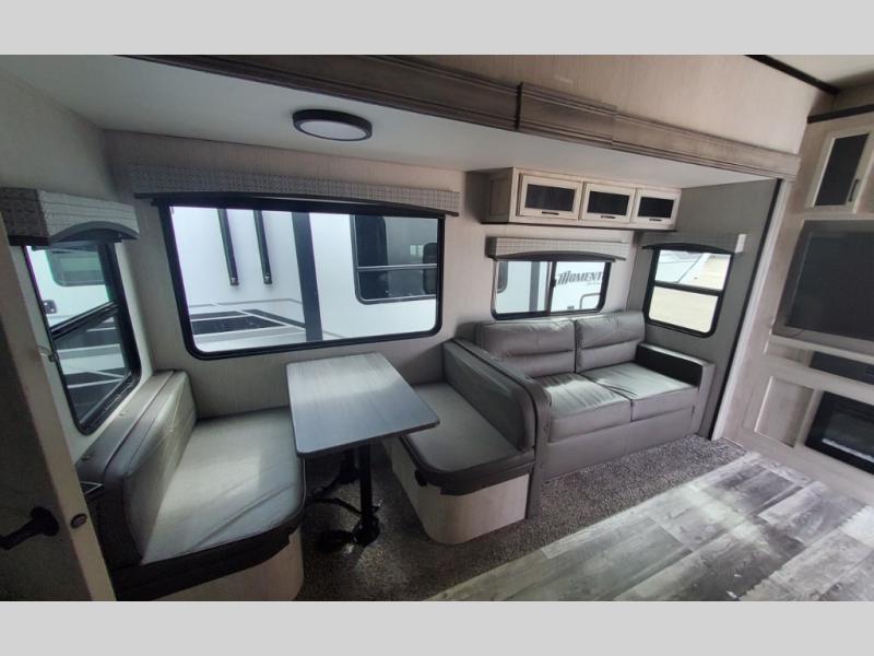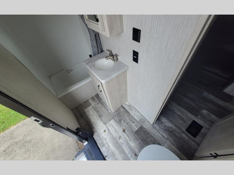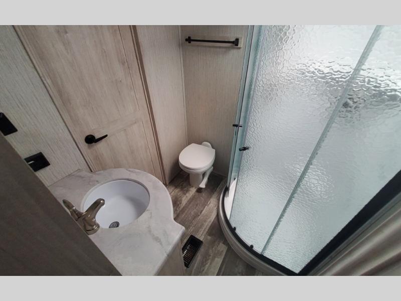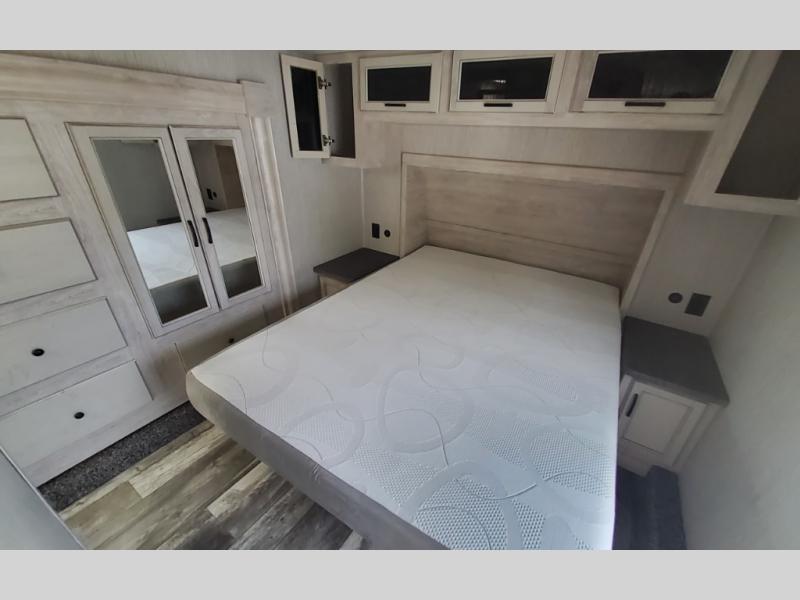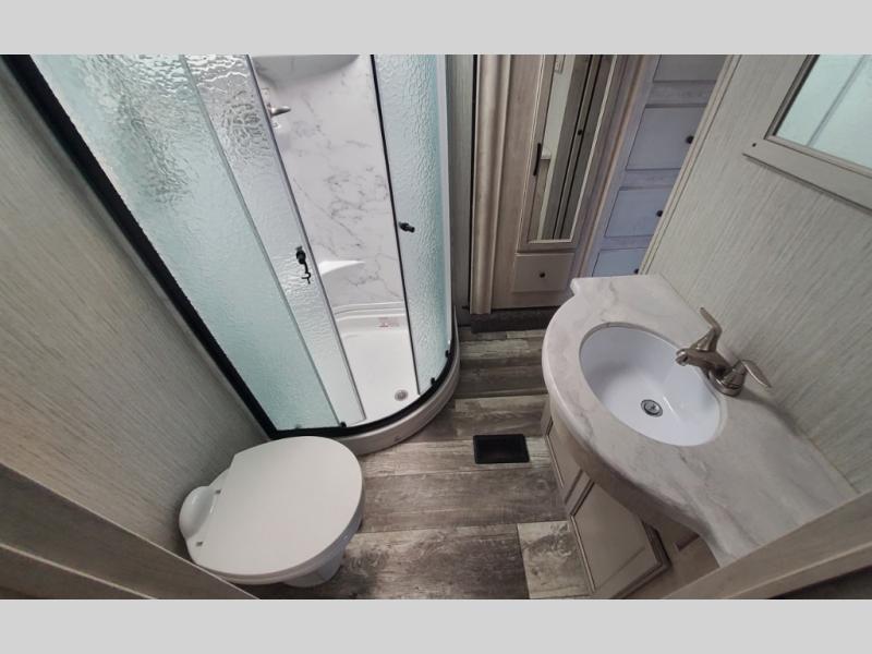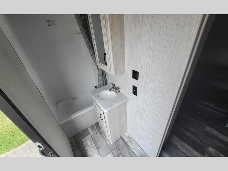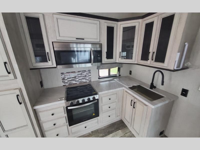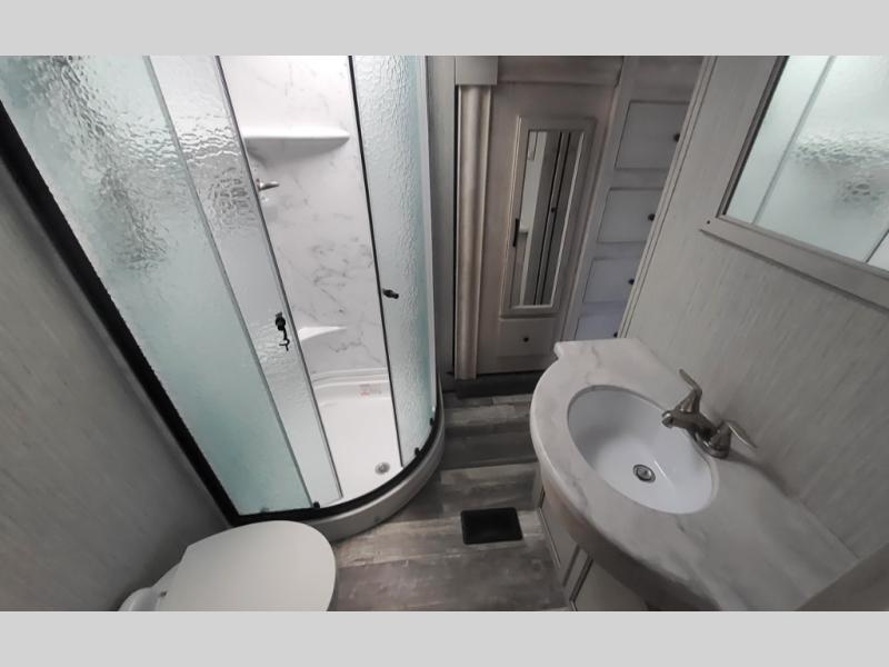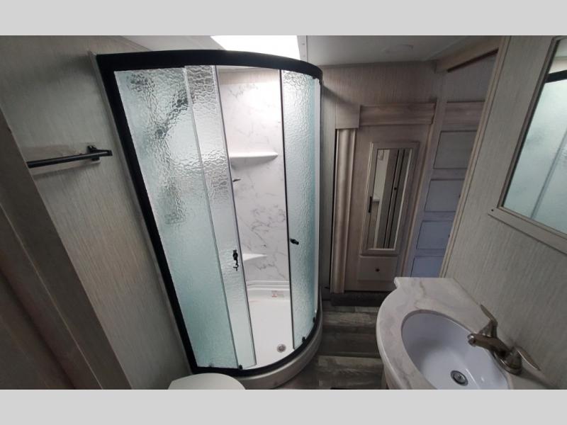 There is something for the whole family with this fifth wheel! From the rear private bunkhouse with a bunk bed above a glide sofa across from a TV cabinet/wardrobe to the two full bathrooms, one of which has an entrance/exit door to the unit and to the bunkhouse. The chef can whip up a delicious meal inside with the four burner cooktop or head outdoors to use the bumper mount swivel gas grill. Grab a snack from the full size pantry and head to either the tri-fold hide-a-bed sofa or booth dinette to watch a movie at the entertainment center with a fireplace below. When you're ready to wind down your nights, head to the dual entry bathroom to take a hot shower in the radius shower then walk directly into the front private bedroom to grab your pajamas from the wardrobe/linen slide and enjoy a good night's rest on the queen bed!