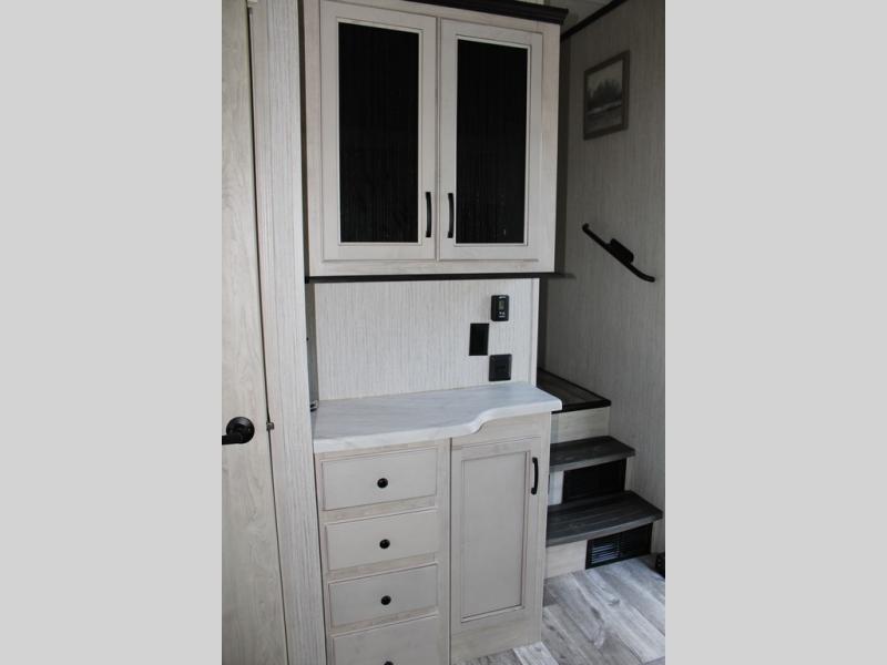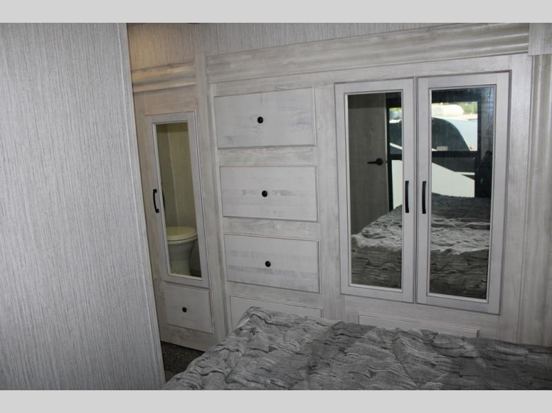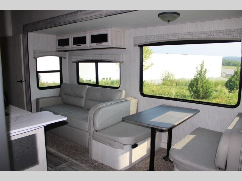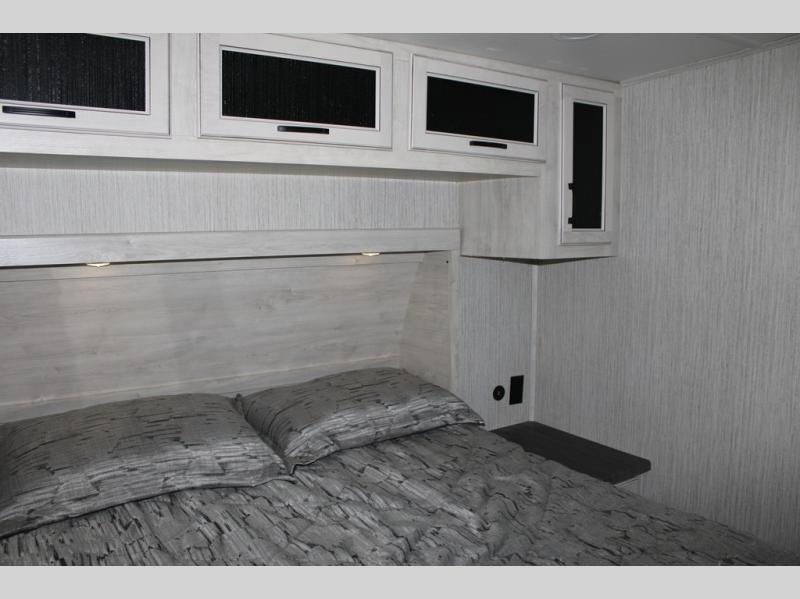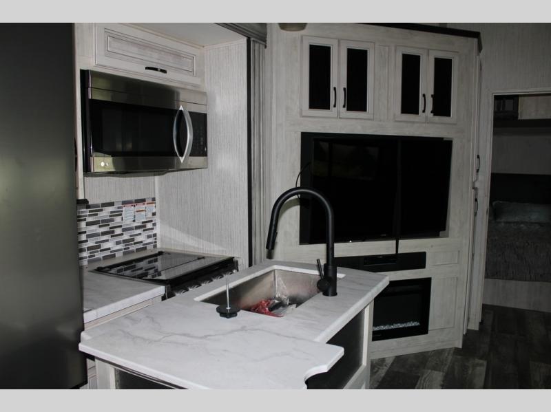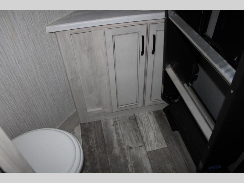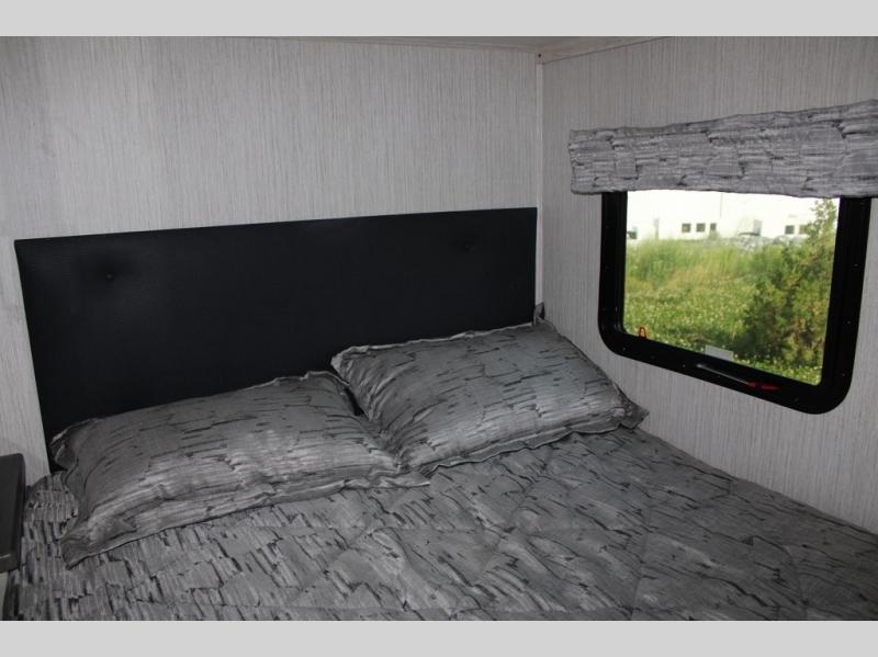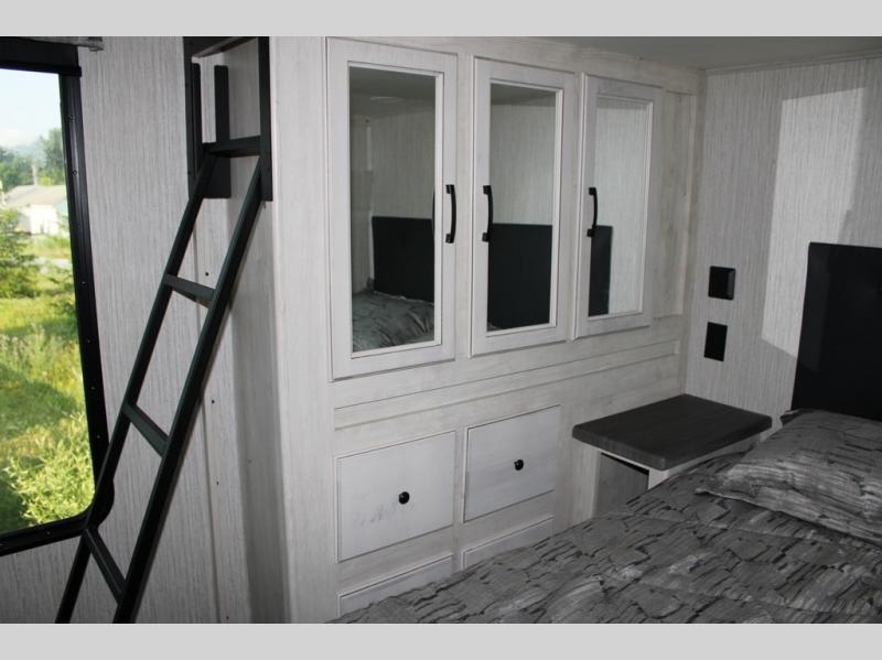 If you want the perfect blend of entertainment, usability, and sleeping space then check out this fifth wheel! One of the dual entry doors leads directly into the half bathroom located in the rear private bedroom. Inside this bedroom is a 60" x 74" bed with a 54" x 74" loft bed above it. There is also a second private bedroom up front with a queen bed, a wardrobe/linen slide, and an entrance into the dual entry bathroom. A couple more guests can tag along and sleep on the tri-fold hide-a-bed sofa and booth dinette once converted. A few exterior features you will enjoy include a bumper mount swivel gas grill next to an outside refrigerator, Morryde steps with strut assist, and an unobstructed pass-through storage area for your gear!