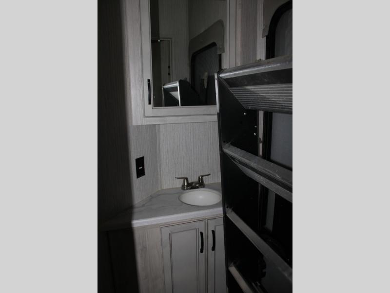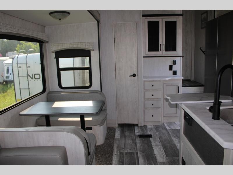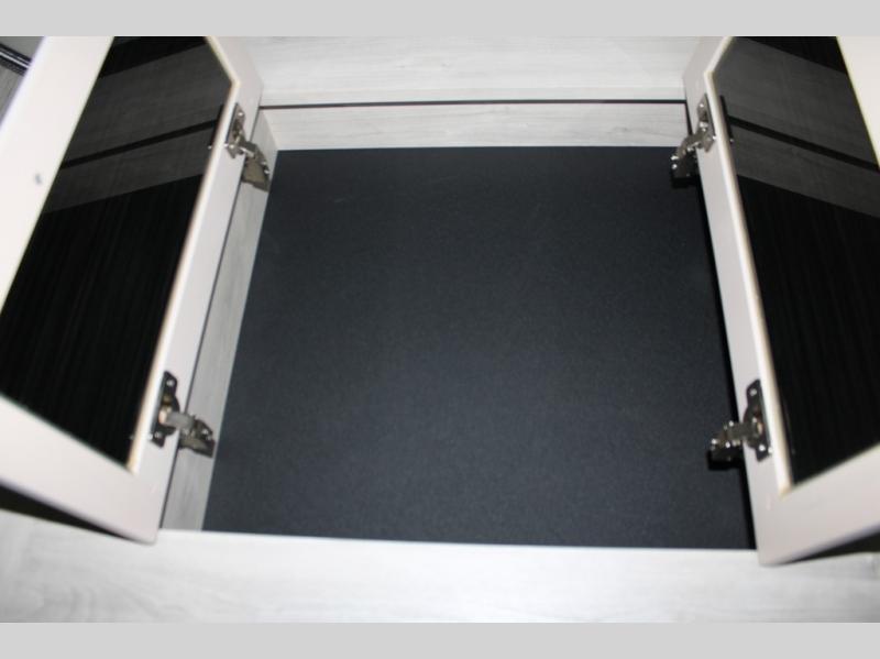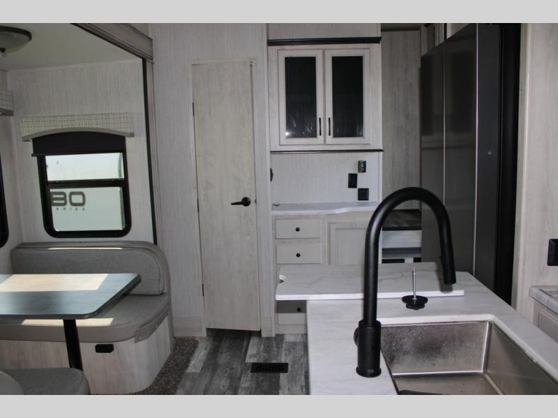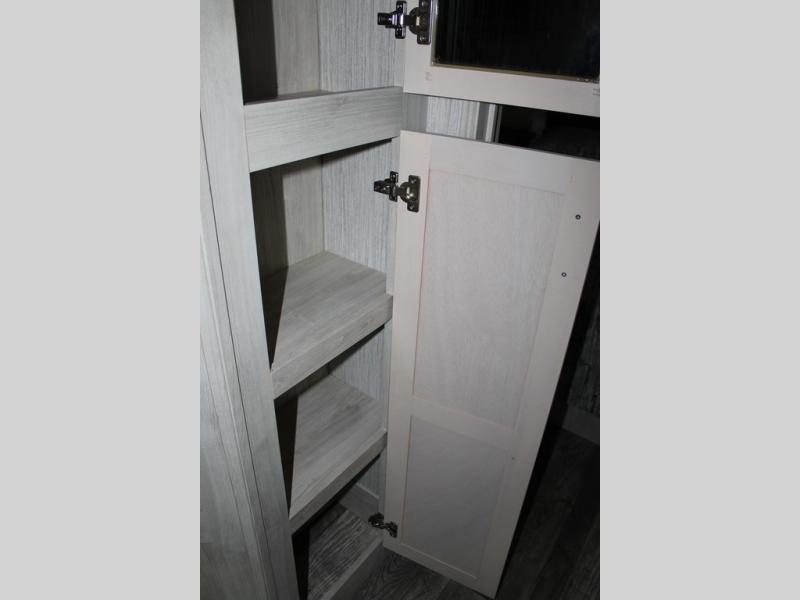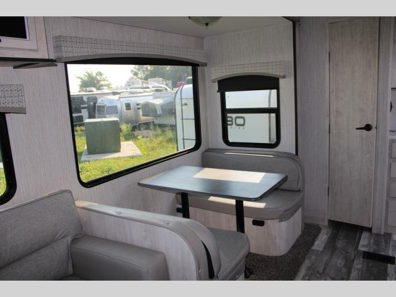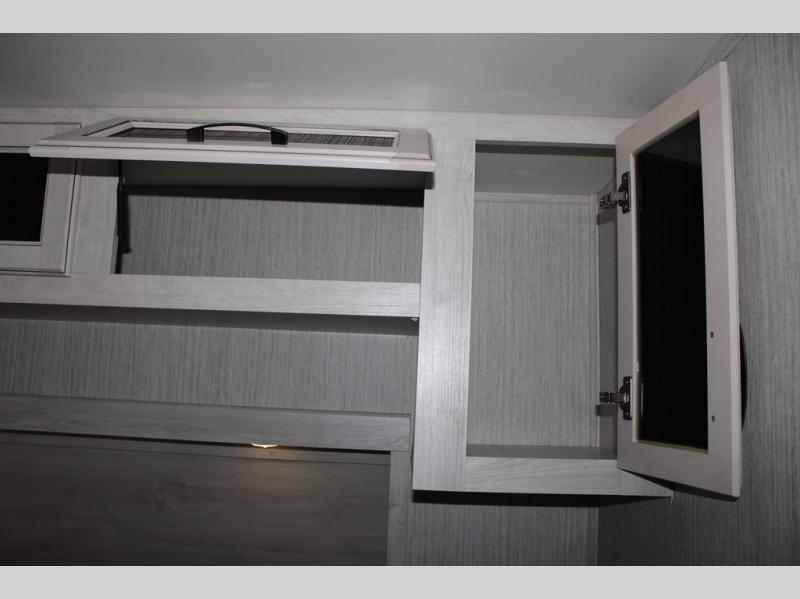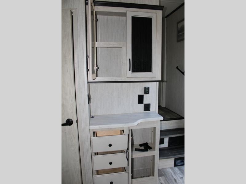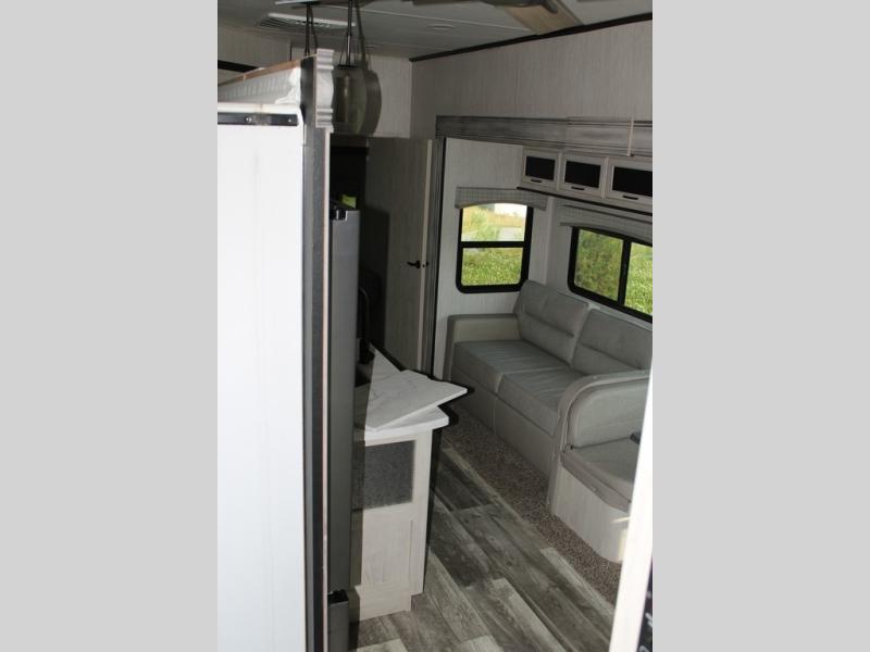 If you want the perfect blend of entertainment, usability, and sleeping space then check out this fifth wheel! One of the dual entry doors leads directly into the half bathroom located in the rear private bedroom. Inside this bedroom is a 60" x 74" bed with a 54" x 74" loft bed above it. There is also a second private bedroom up front with a queen bed, a wardrobe/linen slide, and an entrance into the dual entry bathroom. A couple more guests can tag along and sleep on the tri-fold hide-a-bed sofa and booth dinette once converted. A few exterior features you will enjoy include a bumper mount swivel gas grill next to an outside refrigerator, Morryde steps with strut assist, and an unobstructed pass-through storage area for your gear!