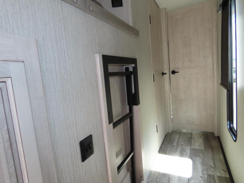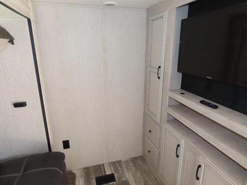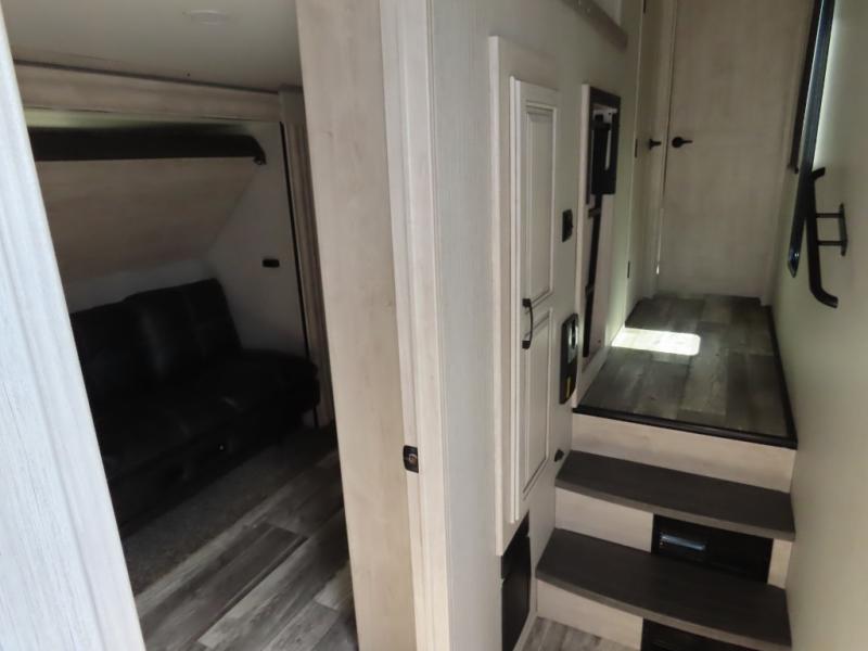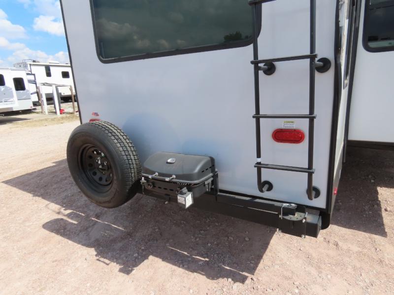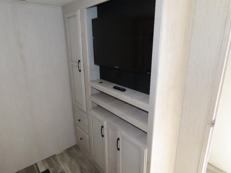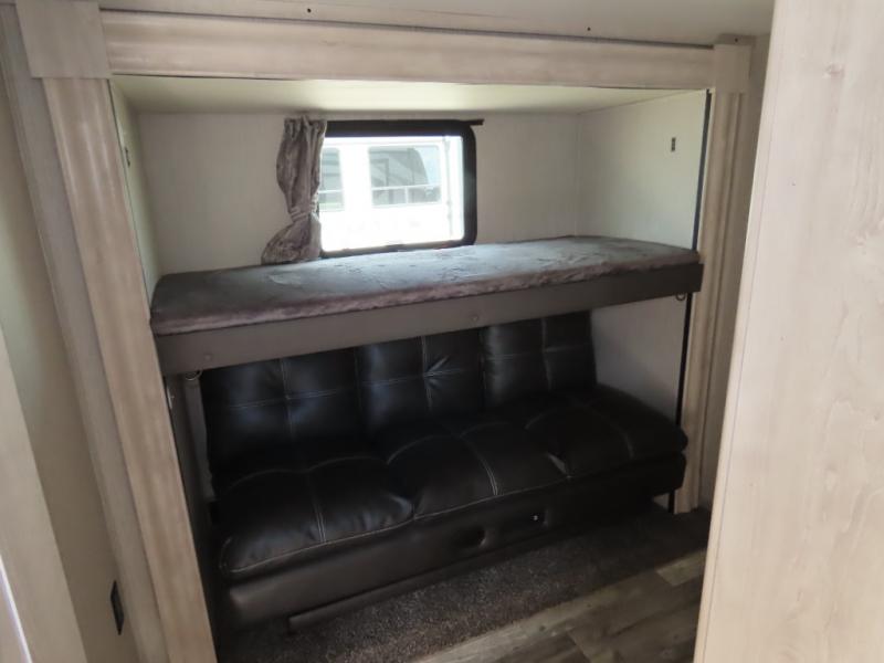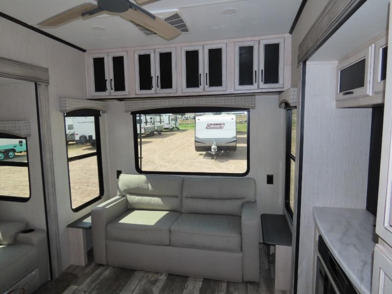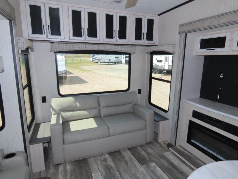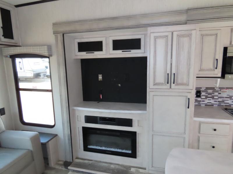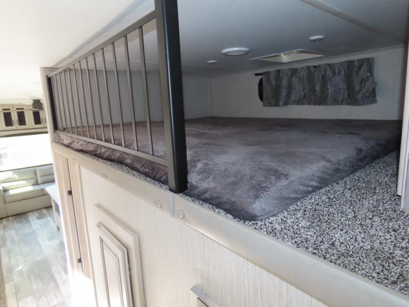 The whole family will love camping in this fifth wheel! It features a front private bedroom with a queen bed to lay your head at night and a second bedroom with a bunk above a glide sofa, a TV cabinet, a wardrobe, and a loft above it all for extra sleeping or storage space. The chef will enjoy cooking with the kitchen island, the four burner cooktop, and two pantries to store canned goods and snacks, plus there is an outside bumper mount swivel gas grill to fry burgers. The rear living area offers a comfortable place to relax at night on one of the two tri-fold hide-a-bed sofas while watching a movie on the 50" flat screen TV with a fireplace below it and cabinets on either side to store your movies.
