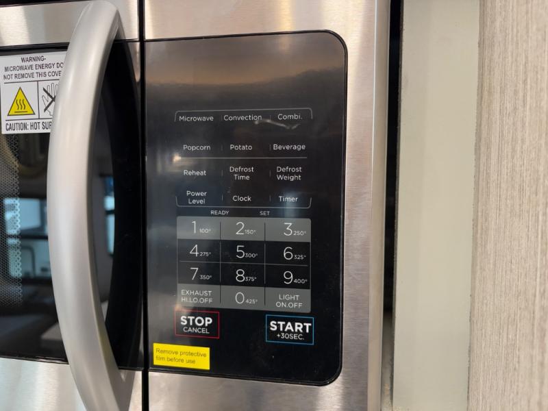 Residential-style appliances including 2-door refrigerator, convection microwave, oven, and 4 burner cooktop
