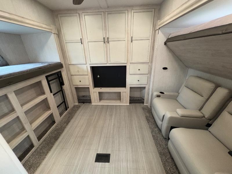 Rear bunkhouse suite with opposing slides, entertainment center, two bunks, and theater seating