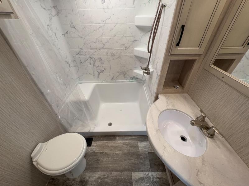 Full bath includes a residential shower, vanity, and toilet