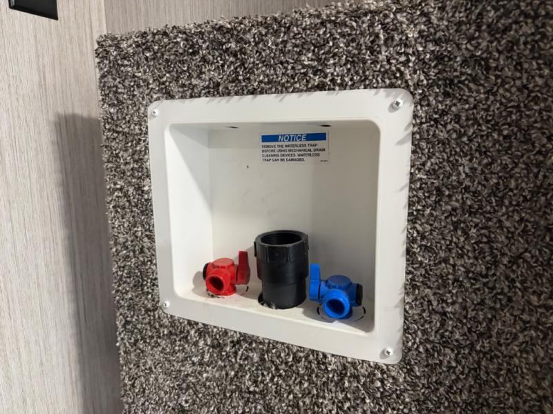 Front private bedroom with queen bed, wardrobe storage, and washer/dryer prep