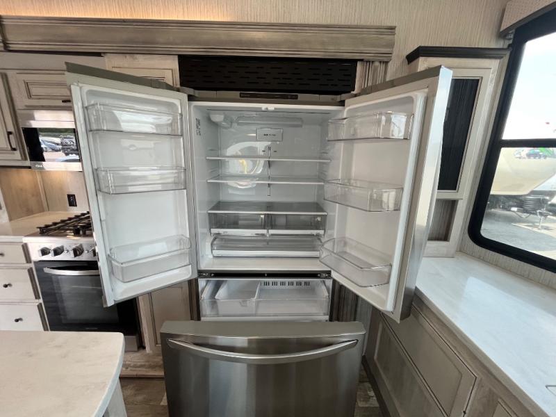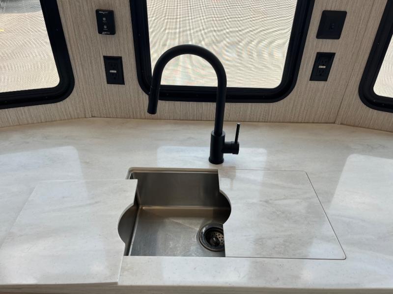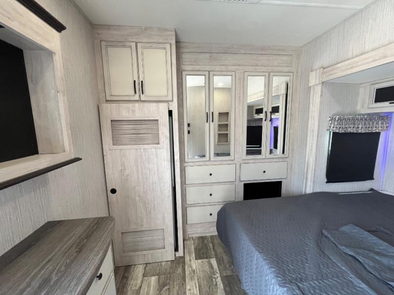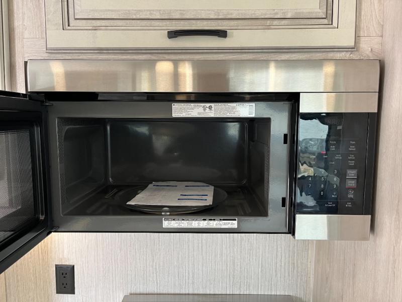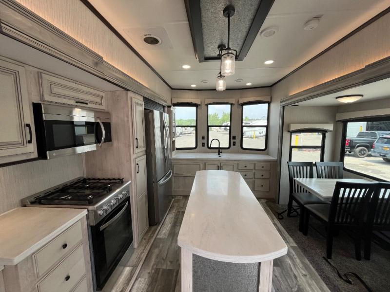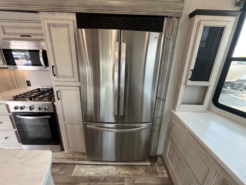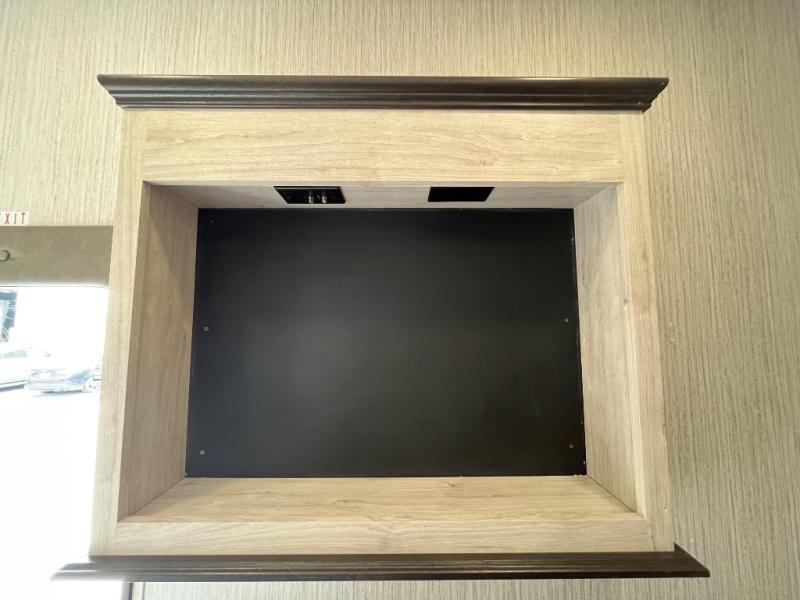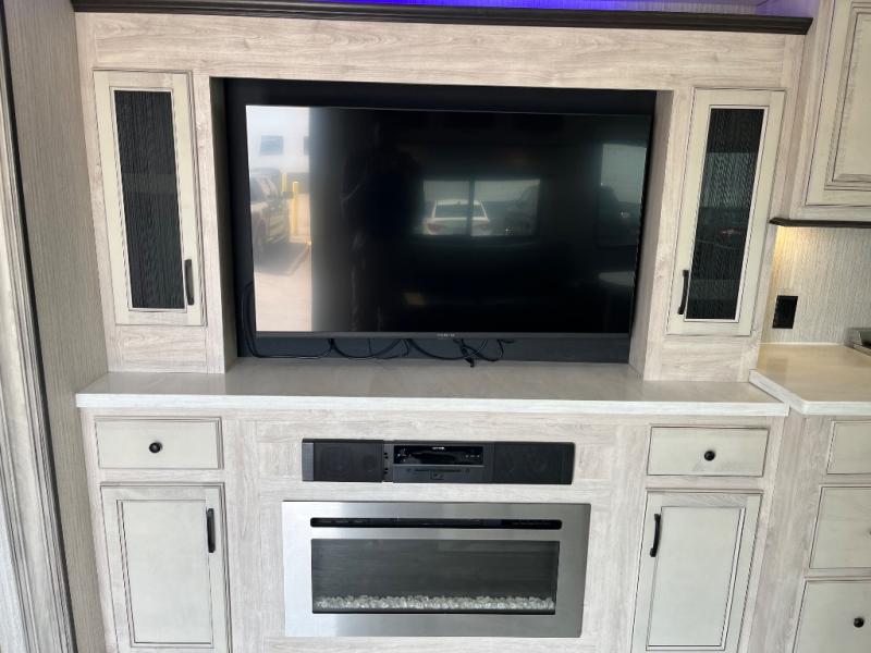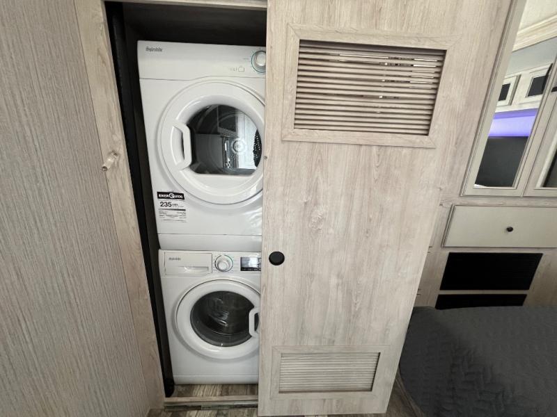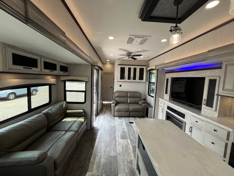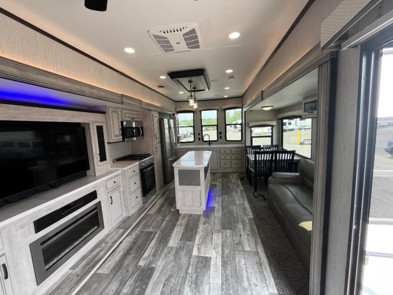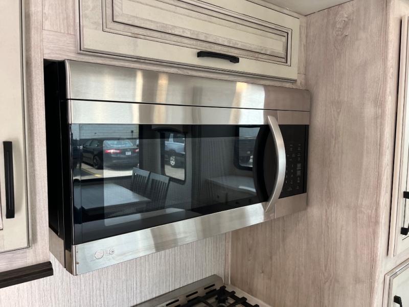 Everyone will fall in love with this destination trailer, especially the cook since it includes a large front kitchen. There is ample counter space for them to create their best meals on, a 22 cu. ft. stainless steel refrigerator and a pantry for food storage, plus a kitchen island that will bring the whole room together. Your crew can play a game of cards at the table and chairs or watch a movie on the 50" flatscreen TV within the entertainment center. There is even extra storage cabinets here, a fireplace, and theater seating close by. When it's time to call it a night, the rear bedroom is sure to feel just like home. Here, you'll find a slide out king bed, a wardrobe and a dresser, plus a closet that has a space to add an optional washer and dryer if you choose!