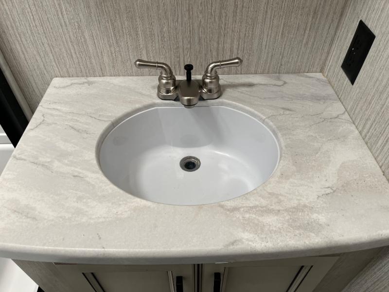 The Sandpiper Destination Trailers by Forest River are constructed to last through years of use and memories. There is a cambered powder coated frame with rust prohibitor, R-10 sidewall construction, and Underbelly Armor that will allow you to camp year around. There is also an electric awning with LED lights, two exterior speakers, and a 60" dual pane patio door. The interior is packed with comforts, such as residential carpet, recessed LED lighting, handmade cabinetry, and crown molding over the kitchen cabinets to name a few. You will love the look of the stainless steel kitchen package, the designer window treatments, and the rustic plank pattern linoleum. These destination trailers also feature extra large picture windows throughout for open views, a full coach water filtration system, a ducted 15K A/C system, plus many more conveniences to make each destination memorable.