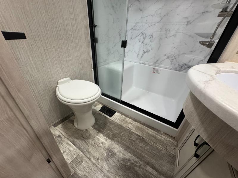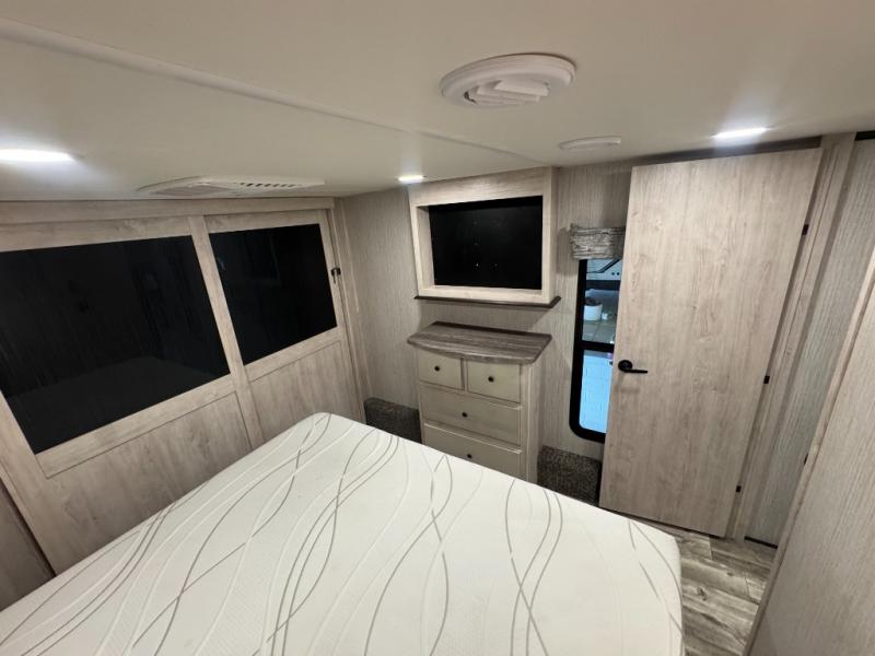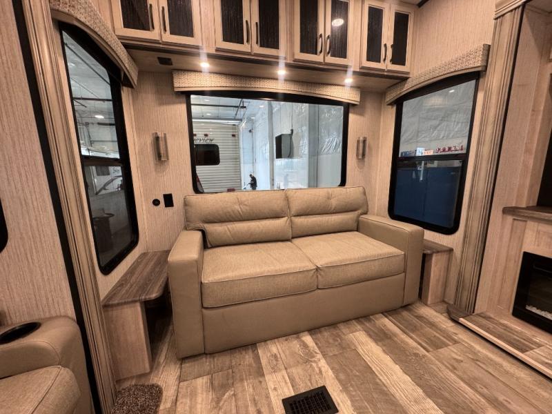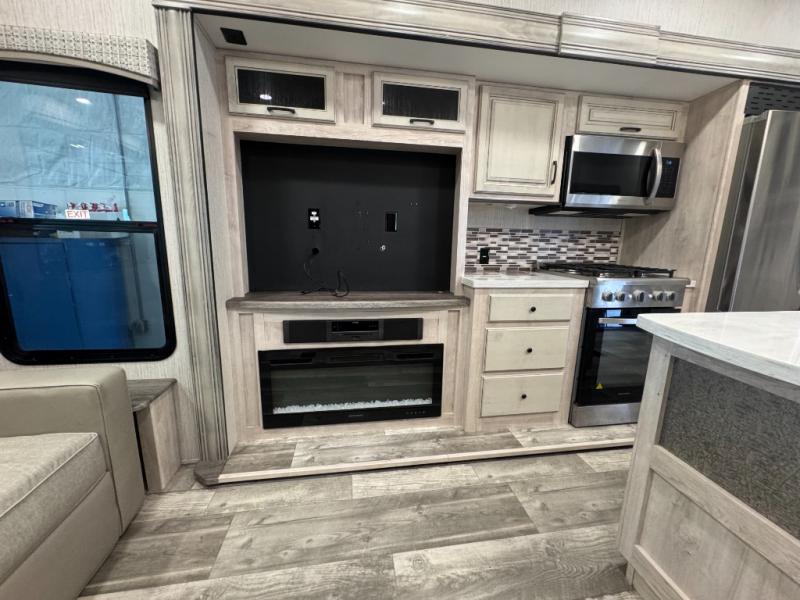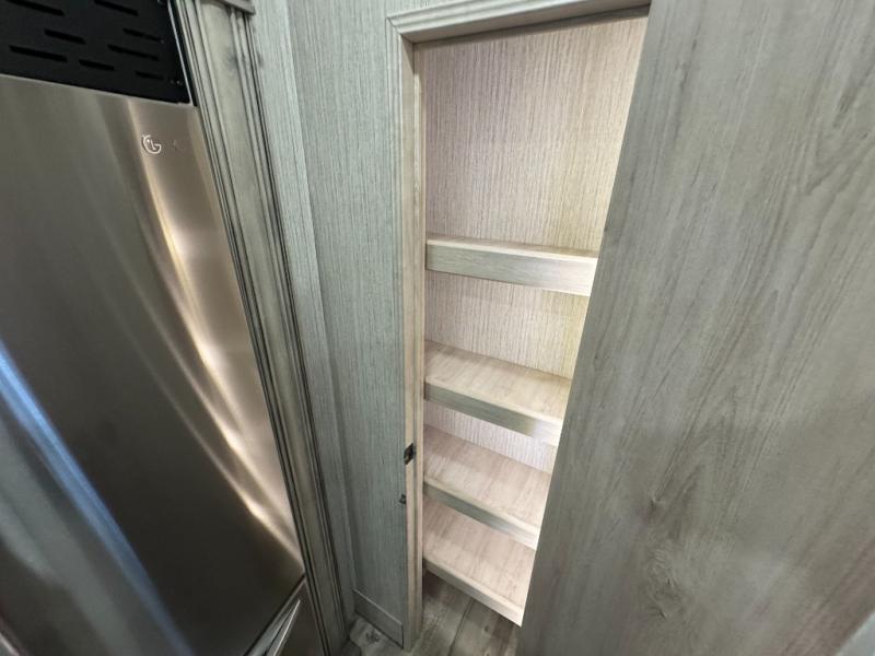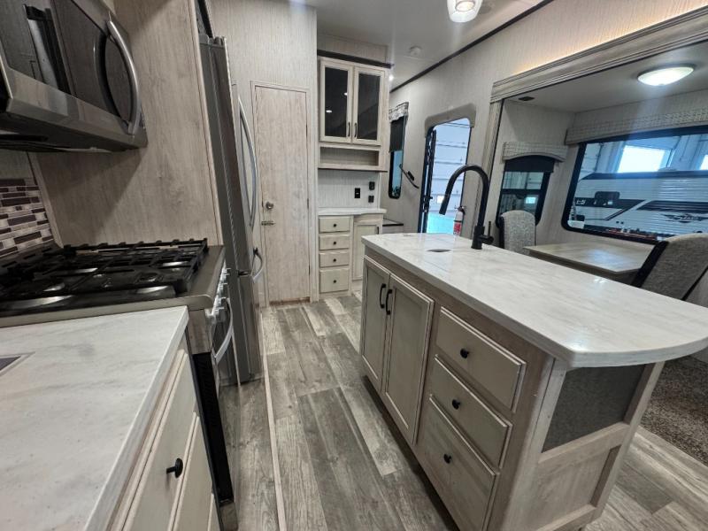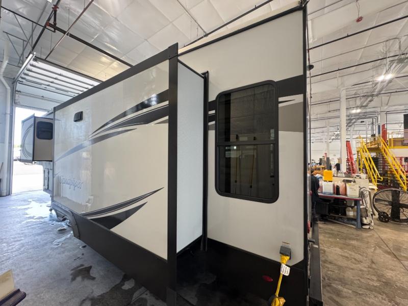 When a brand claims to be luxurious, you expect true luxury, and the Forest River Sandpiper Luxury fifth wheel delivers! The list of included features is outstanding, and the construction itself is top notch. Everything comes together on a welded aluminum-framed, vacuum-bonded laminated superstructure and a cambered powder-coated frame with rust prohibitor. There is a fully enclosed, heated underbelly and an unobstructed drop-frame pass-through storage area with cable jacks and 110V outlet. Two LED-lit exterior speakers add some fun to the outside, and the docking station includes easy winterization, hot and cold spray port, black tank flush, and pull valves for tanks. But the true luxury is found inside with the 84" interior height, residential countertops, recessed residential lighting, extra-large picture windows, LED-lit headboard, and premium sound bar with built-in flush-mount DVD player. Each unit has also been prepped for a washer/dryer so that you can extend every trip and make your Sandpiper Luxury feel more like home.