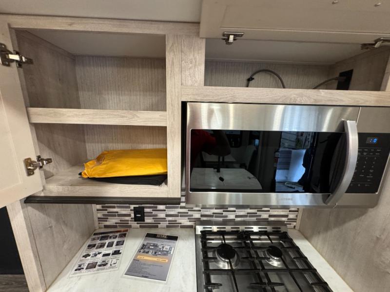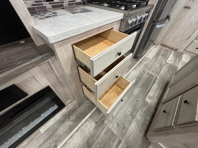 Vacationing in this Sandpiper Luxury fifth wheel will be a dream come true! You are going to have the most enjoyable time sitting back on the theater seating while watching the 50" flat screen LED HDTV, and the fireplace below the TV will provide some extra ambiance and coziness while you watch. Stay cool without overworking your air conditioner by using the ceiling fan above the kitchen island, and if you make a couple of friends at the campsite, you can invite them over for dinner and games at the free-standing table with chairs. You'll be able to store practically anything in the 22-cubic foot residential refrigerator, and the four-burner range will make dinner preparations effortless. You can even store some dishes in the hutch.