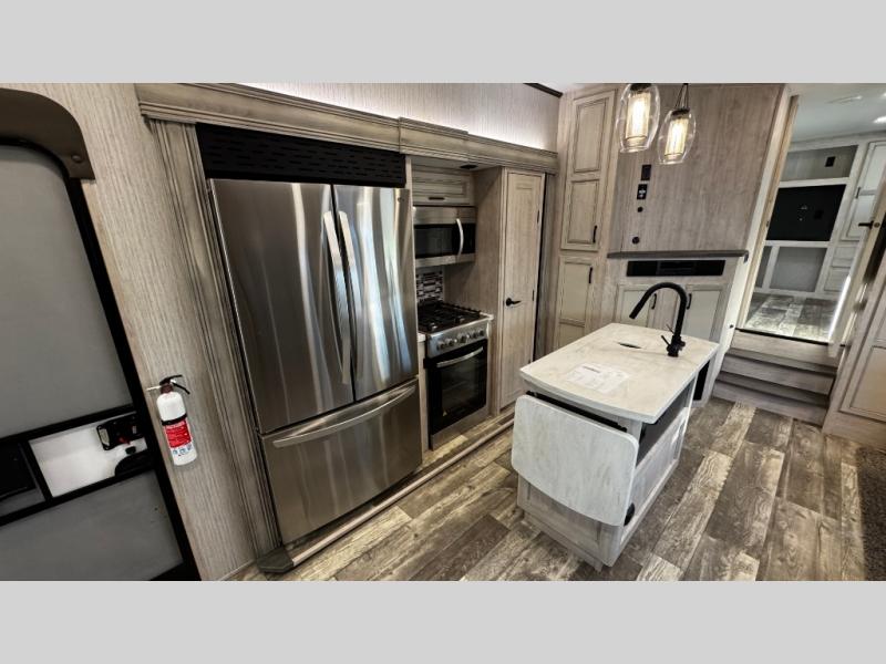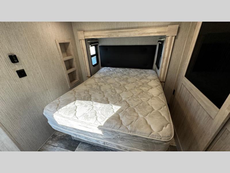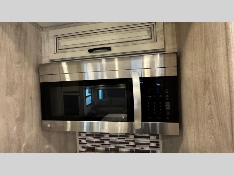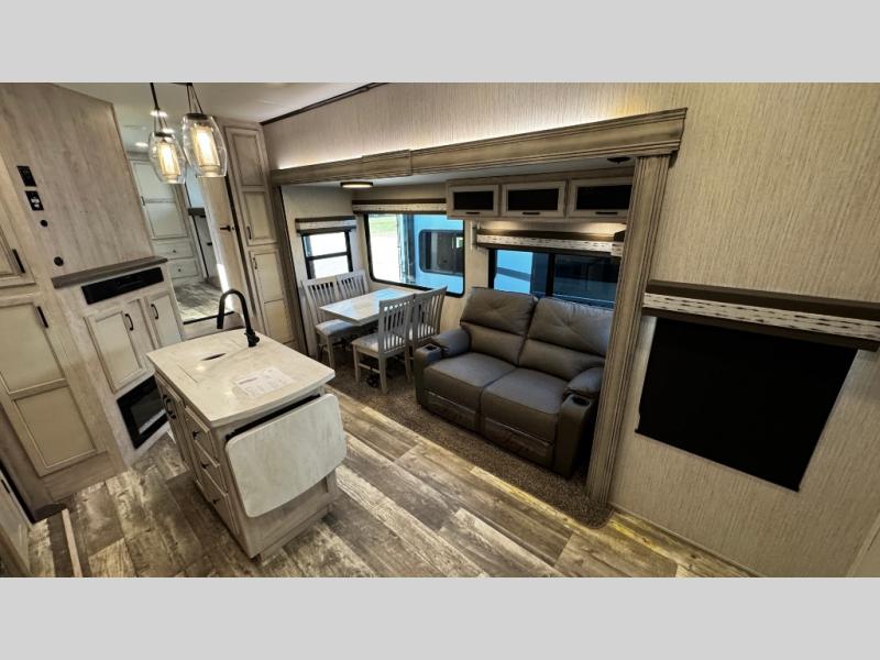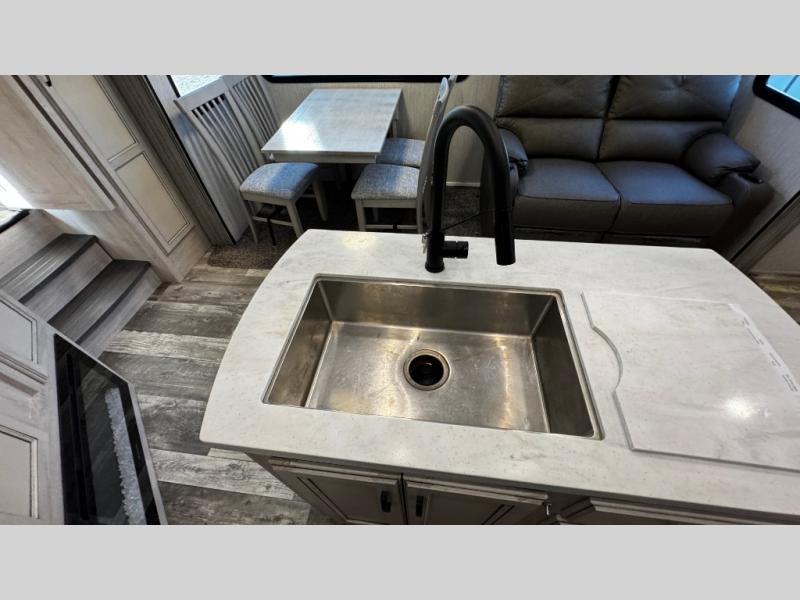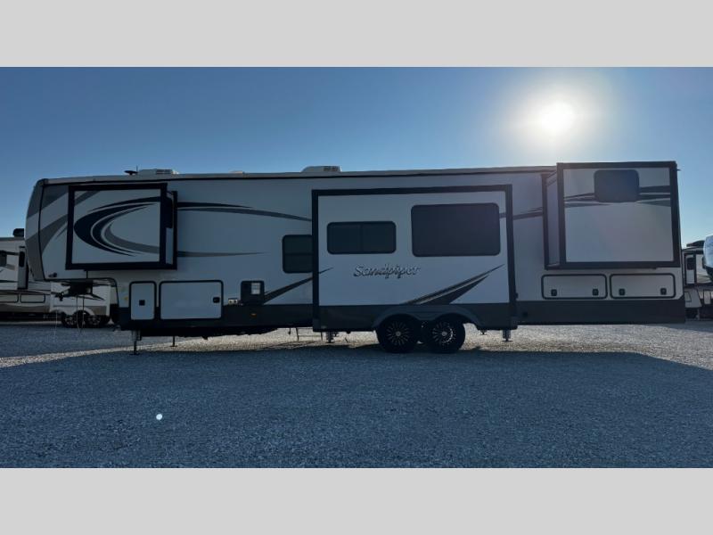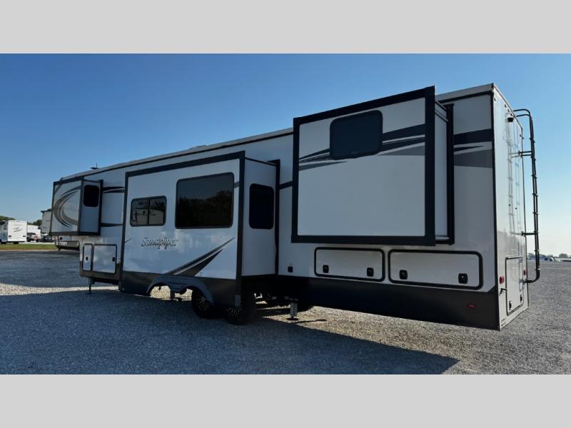 When a brand claims to be luxurious, you expect true luxury, and the Forest River Sandpiper Luxury fifth wheel delivers! The list of included features is outstanding, and the construction itself is top notch. Everything comes together on a welded aluminum-framed, vacuum-bonded laminated superstructure and a cambered powder-coated frame with rust prohibitor. There is a fully enclosed, heated underbelly and an unobstructed drop-frame pass-through storage area with cable jacks and 110V outlet. Two LED-lit exterior speakers add some fun to the outside, and the docking station includes easy winterization, hot and cold spray port, black tank flush, and pull valves for tanks. But the true luxury is found inside with the 84" interior height, residential countertops, recessed residential lighting, extra-large picture windows, LED-lit headboard, and premium sound bar with built-in flush-mount DVD player. Each unit has also been prepped for a washer/dryer so that you can extend every trip and make your Sandpiper Luxury feel more like home.