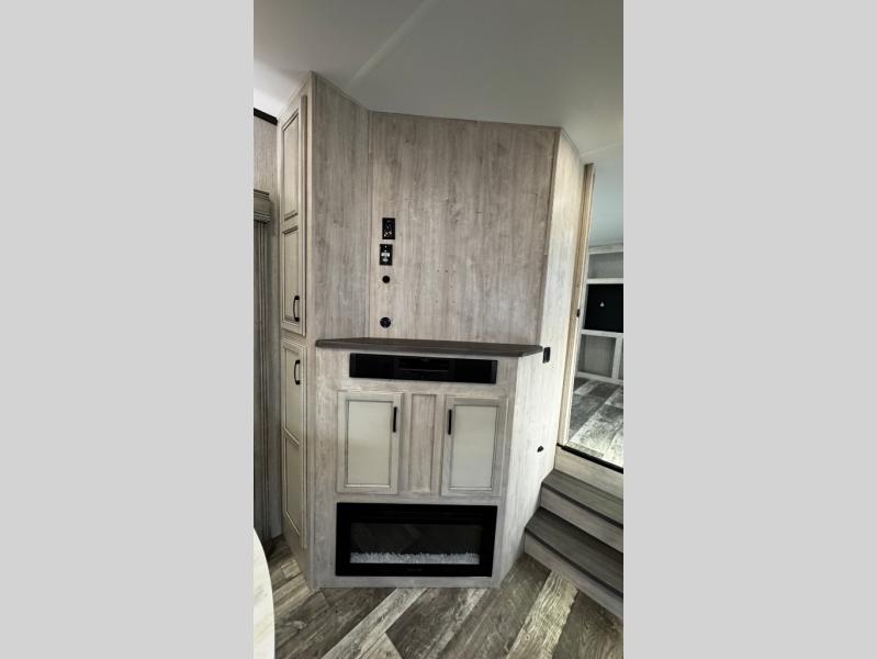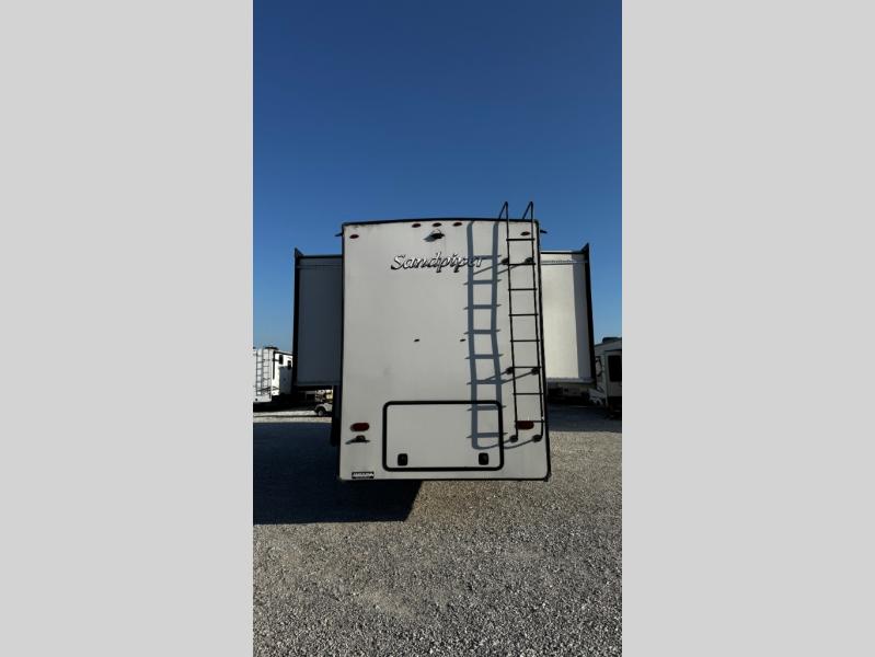 This Sandpiper Luxury fifth wheel has everything you will need for a comfortable camping trip! Your kiddos or guests will have their own privacy with the rear private bunkhouse that has a flip bunk above a glide sofa slide, a set of 32" x 74" bunk beds, an entertainment center with wardrobes on either side, and even a half bathroom. There are two pantries to store everyone's snacks, a 22 cu. ft. refrigerator to keep your perishables fresh, a four burner cooktop to fry up some eggs, and a kitchen island with a double sink for easy clean up. The tri-fold hide-a-bed sofa and theater seating offer comfortable places to sit while you enjoy the fireplace and 50" flat screen LED HDTV at the entertainment center. The front private bedroom has a queen bed slide for you to lay your head at night, a shoe box to keep your shoes out of the way, a dresser, and a front wardrobe to hang your clothes!