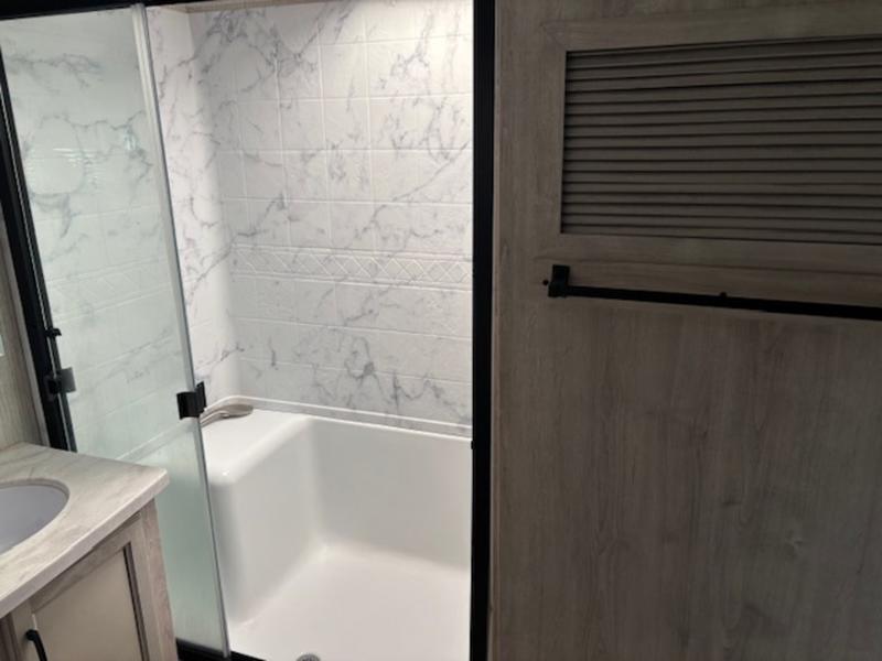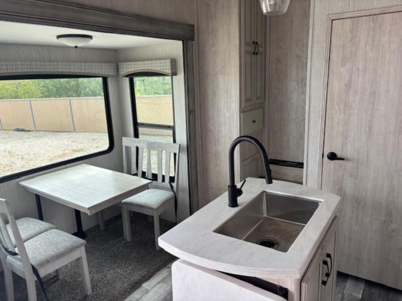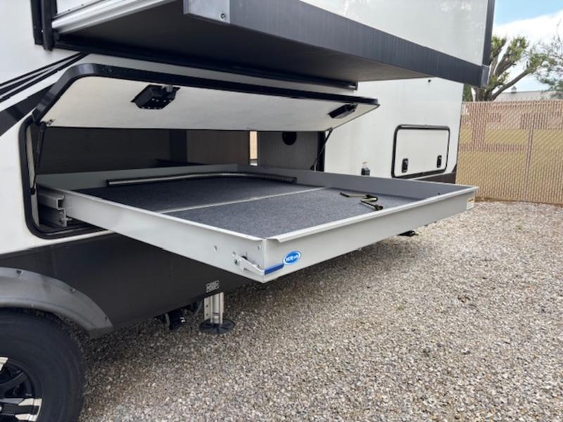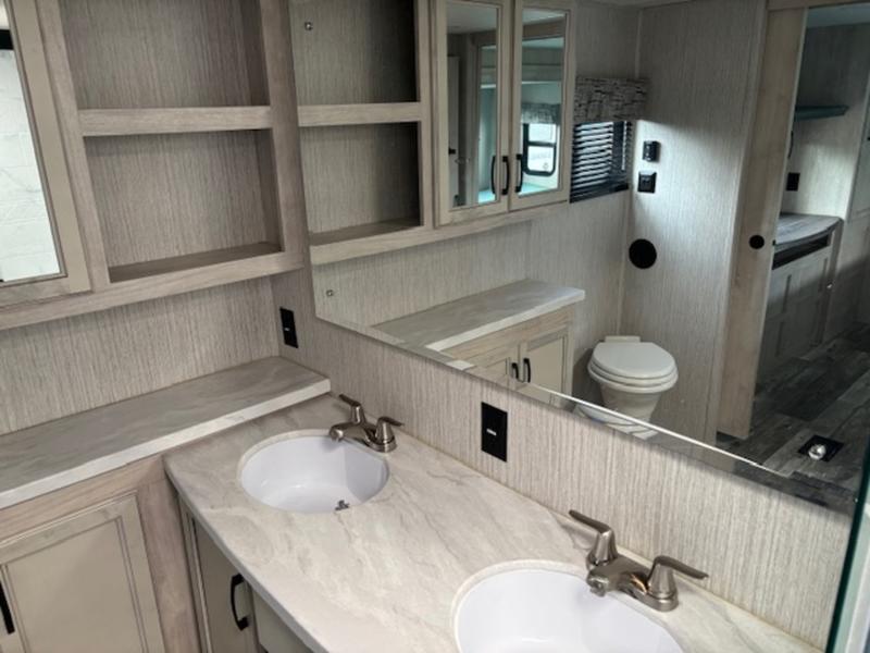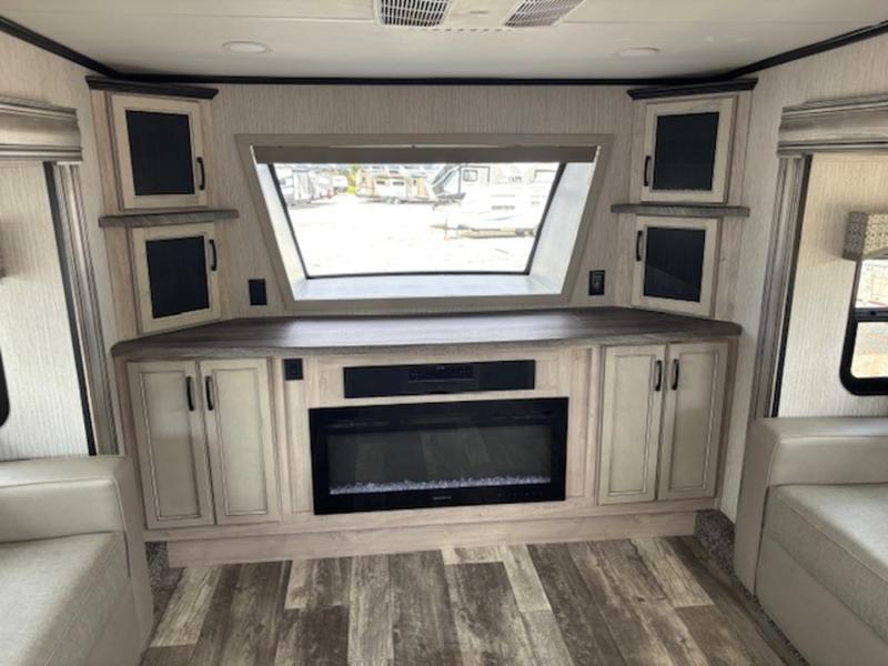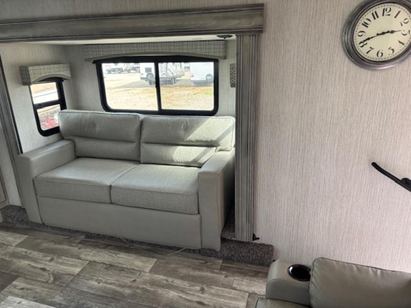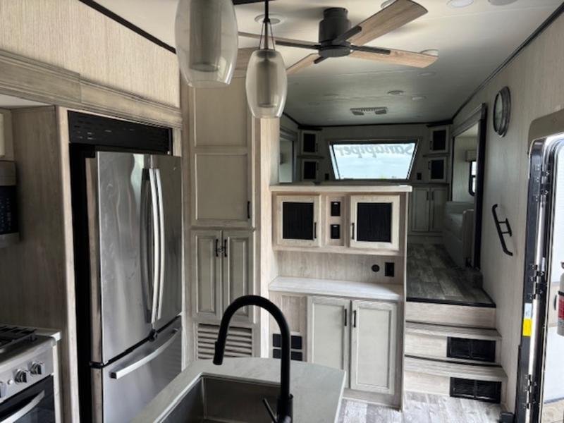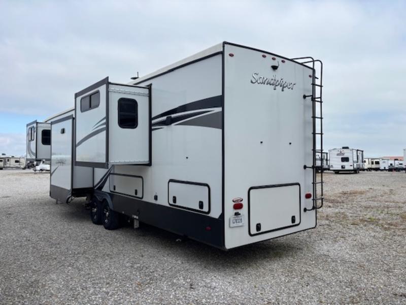 When a brand claims to be luxurious, you expect true luxury, and the Forest River Sandpiper Luxury fifth wheel delivers! The list of included features is outstanding, and the construction itself is top notch. Everything comes together on a welded aluminum-framed, vacuum-bonded laminated superstructure and a cambered powder-coated frame with rust prohibitor. There is a fully enclosed, heated underbelly and an unobstructed drop-frame pass-through storage area with cable jacks and 110V outlet. Two LED-lit exterior speakers add some fun to the outside, and the docking station includes easy winterization, hot and cold spray port, black tank flush, and pull valves for tanks. But the true luxury is found inside with the 84" interior height, residential countertops, recessed residential lighting, extra-large picture windows, LED-lit headboard, and premium sound bar with built-in flush-mount DVD player. Each unit has also been prepped for a washer/dryer so that you can extend every trip and make your Sandpiper Luxury feel more like home.