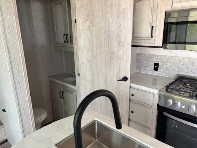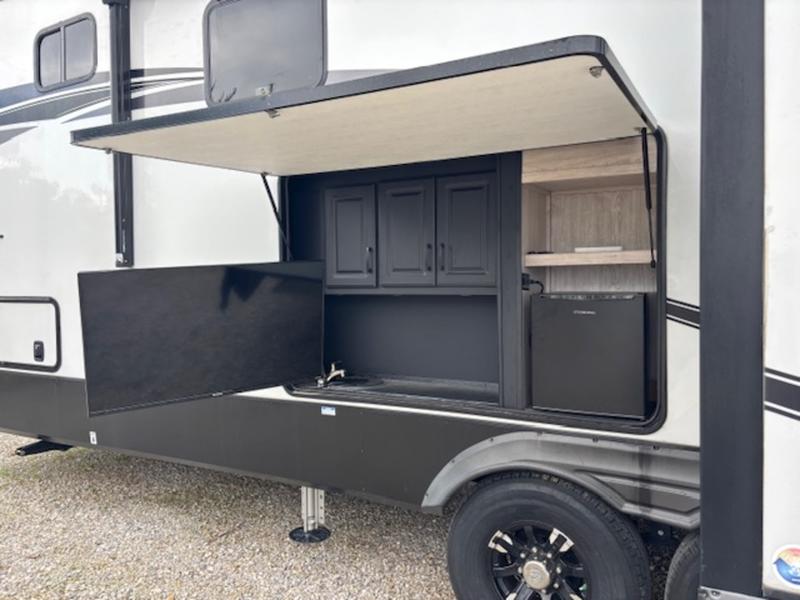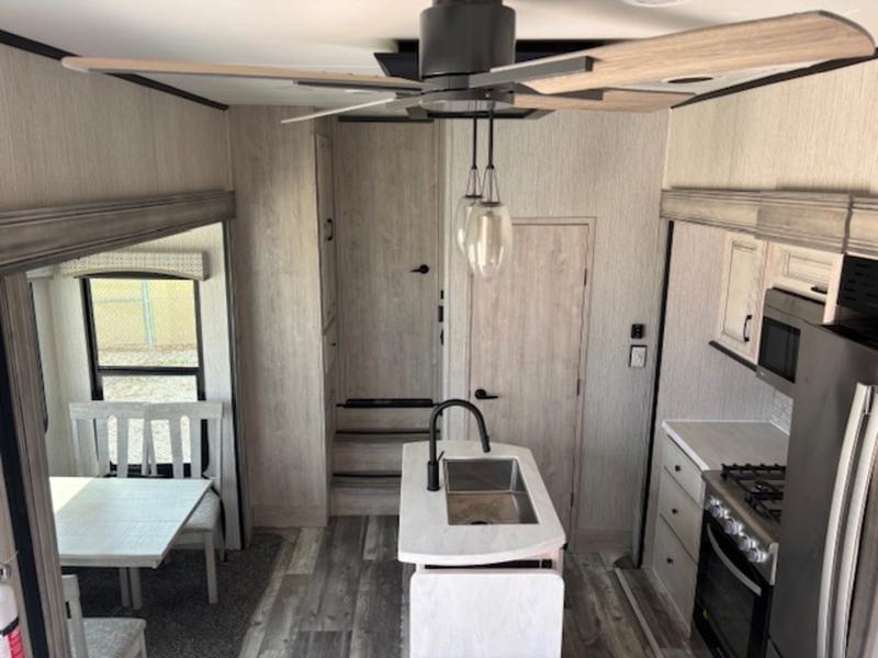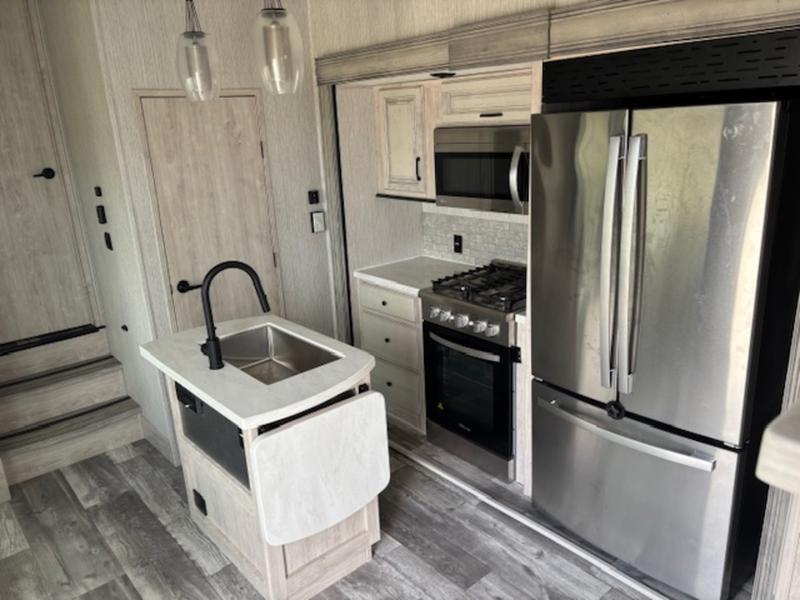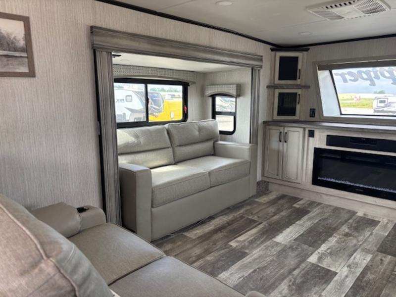 No vacation plan is complete without this Sandpiper Luxury fifth wheel! The master suite is the star of the show with its king bed slide and full bathroom with dual-sink vanity. There is another aspect of this unit that will also grab your attention, and that is the front separate living room. This room features a front entertainment center with fireplace and 50" flat screen LED HDTV, two opposing tri-fold hide-a-bed sofas, and theater seating. All of this makes the living room a perfect place to sit down with friends, and the sofas allow you to offer your friends a sleeping space if they choose to spend the night. The kitchen is centrally located, and it contains the half bathroom. As you work up a sweat cooking dinner on the four-burner range, you'll be able to switch on the ceiling fan to cool down, and you'll be able to store practically anything in the 22-cubic foot residential refrigerator.