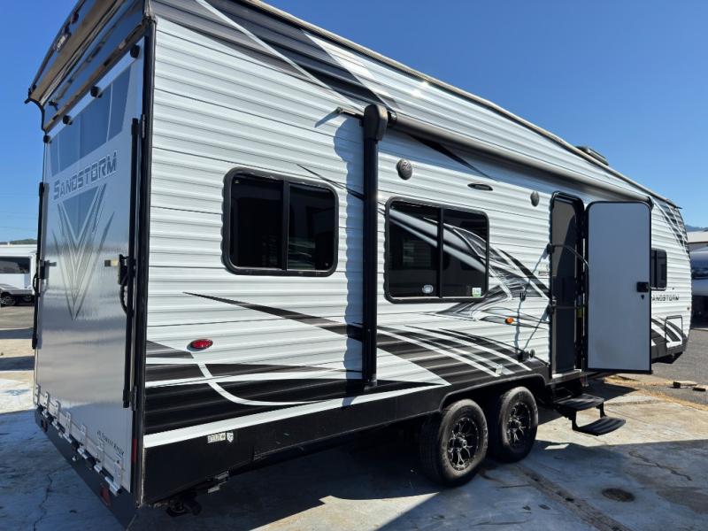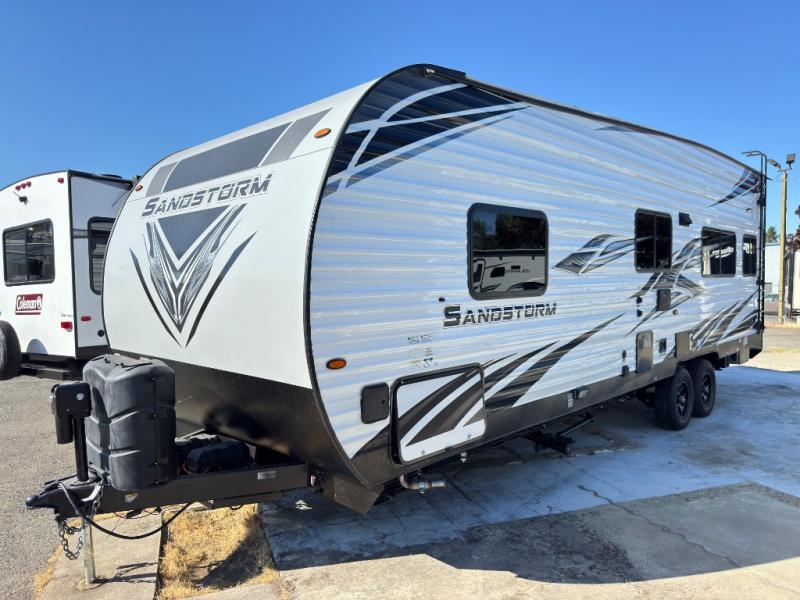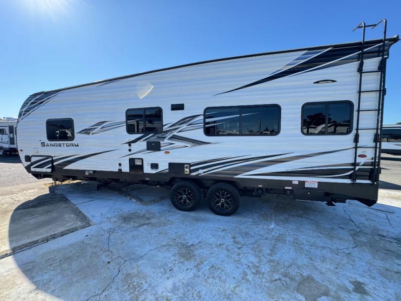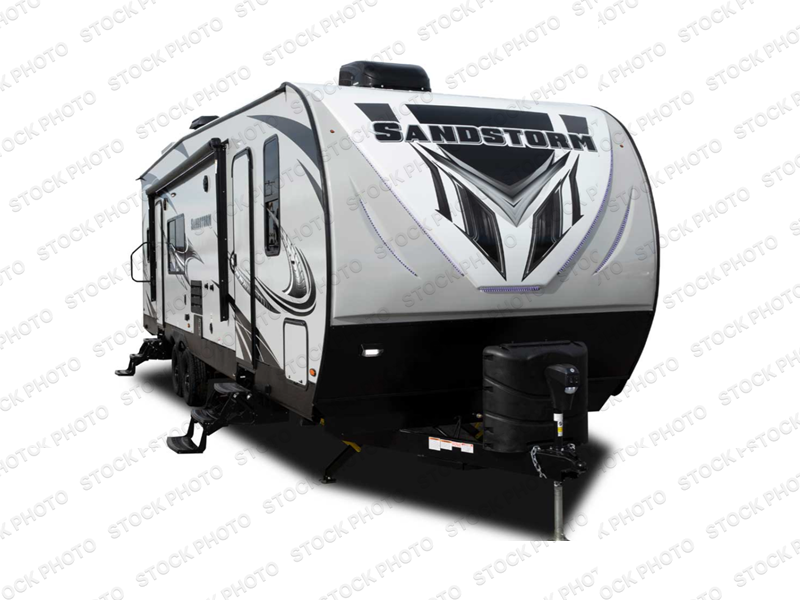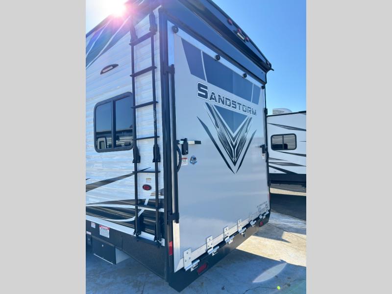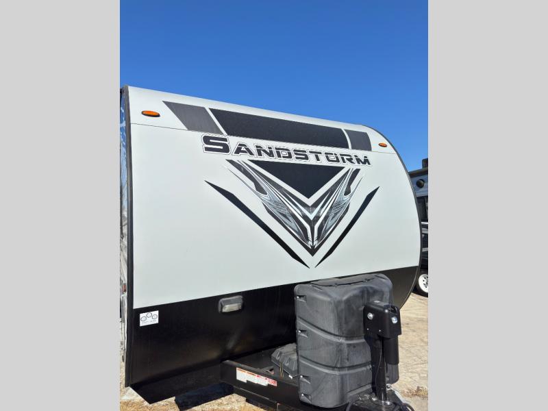 Each Sandstorm toy hauler fifth wheel and travel trailer by Forest River features a 102" wide-body construction to bring along four-wheelers, dirt bikes, or kayaks! You will find convenient amenities, such as 220 watts of solar power and a regulator with power boost, a 35 gallon fuel station, an outside shower to wash off your gear, and more. There is also a power awning with LED lights outdoors to create an outdoor living space, plus heated and enclosed tanks to camp all year long. The interior includes LED accent lighting, black night shades throughout, and a glass shower to name a few comforts. And don't overlook the available options that can added to customize your toy hauler just the way you like it!