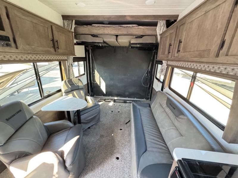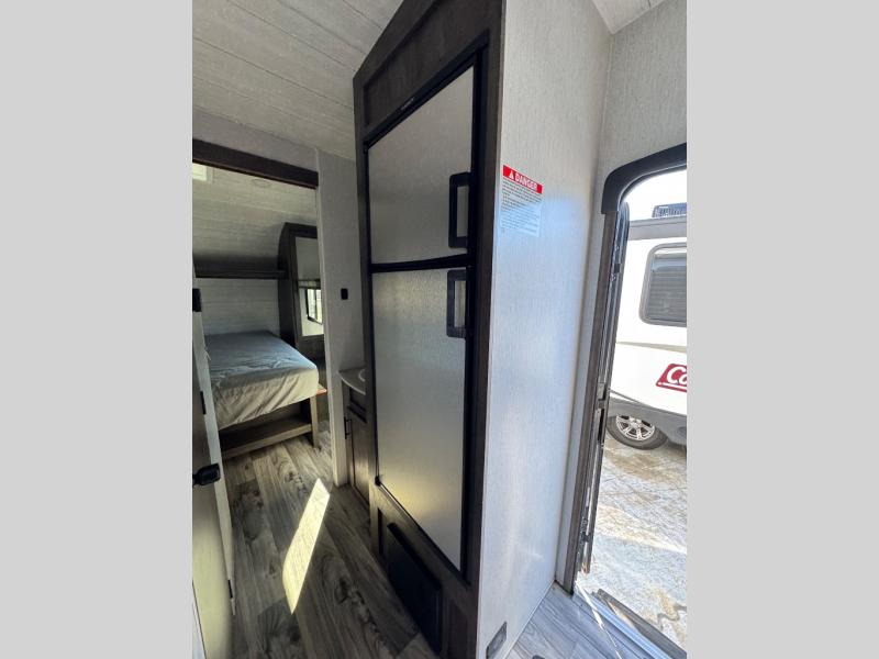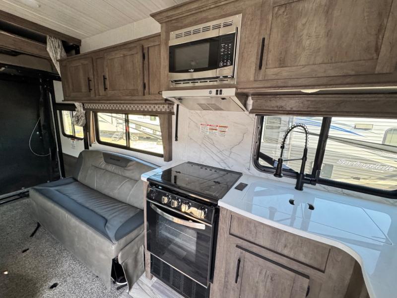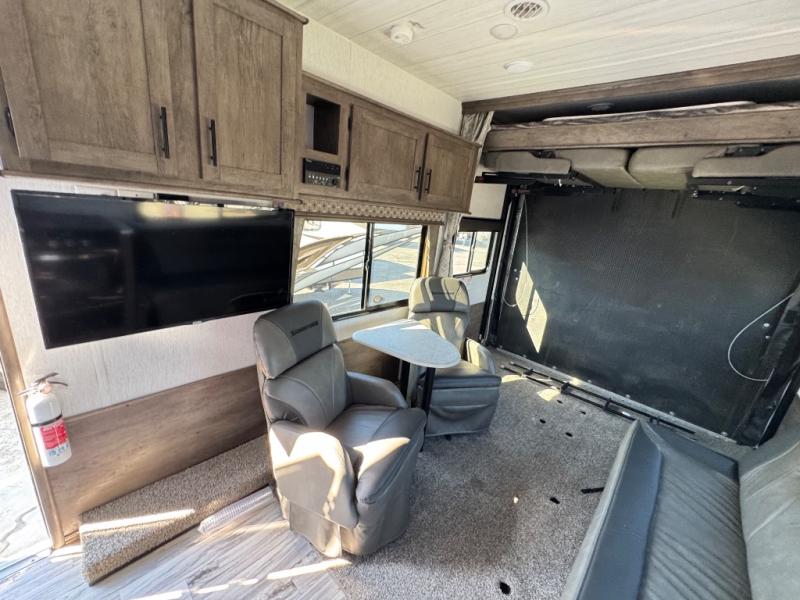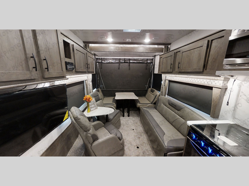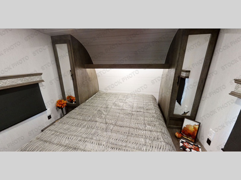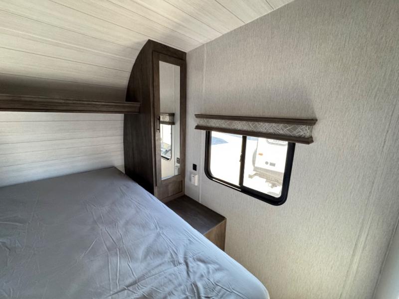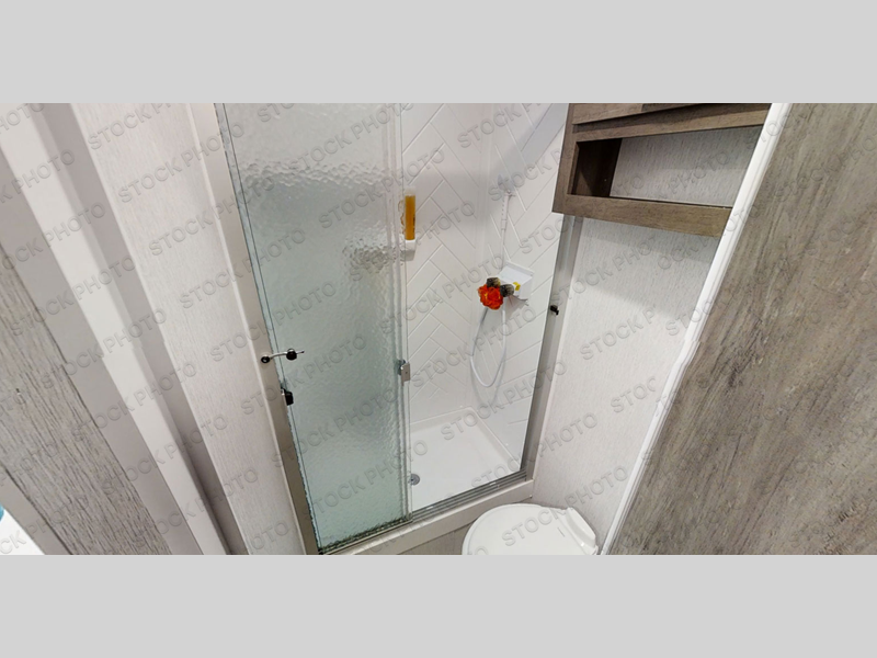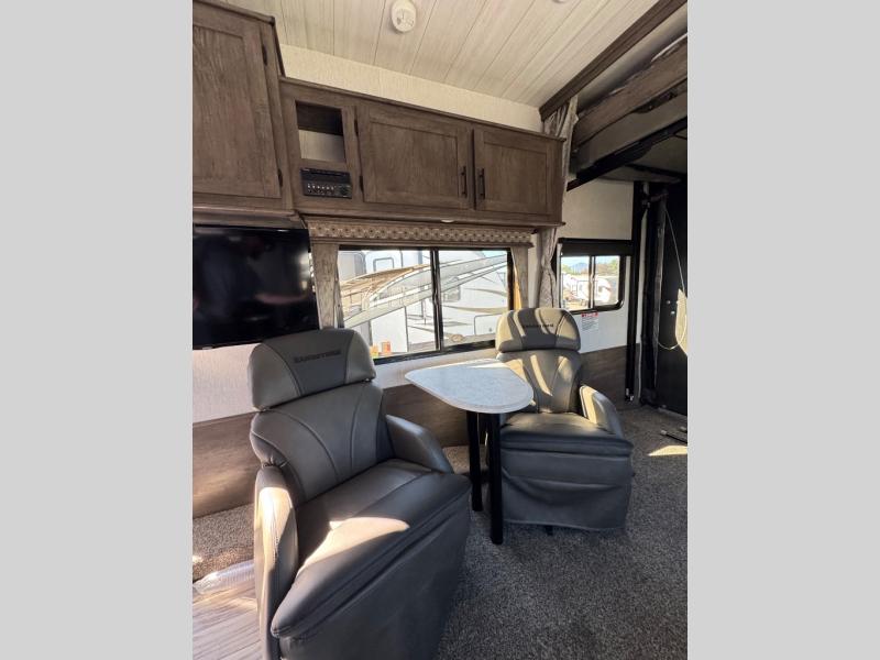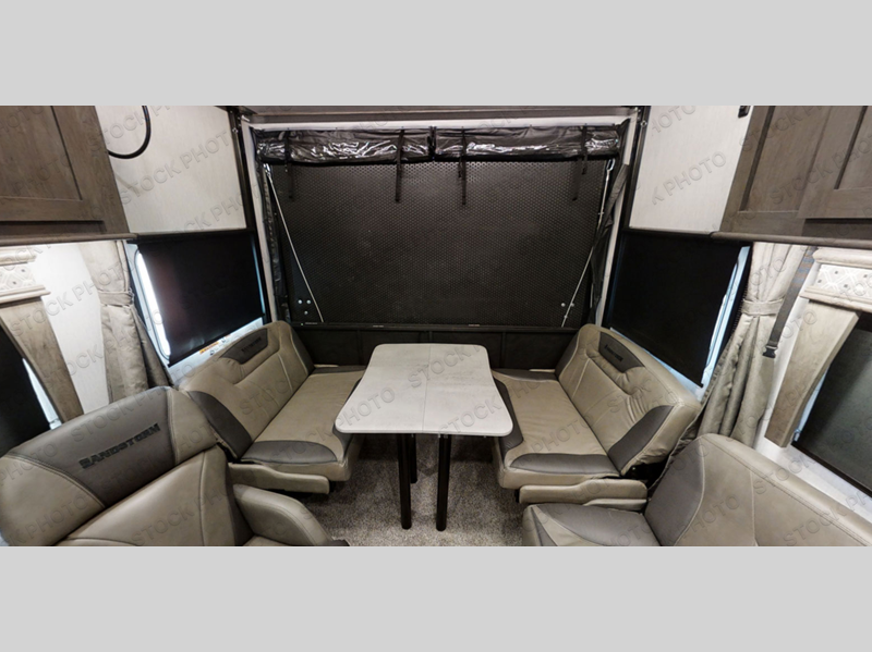 Step inside this Sandstorm toy hauler and experience a camping trip like none other! With 14' 4" of cargo space and 1,200 lb. tie-downs mounted to steel, you can be sure your off-road toys will make it to your destination safely. There is plenty of room for everyone with the rear electric bed, an electric pass-through dinette below the bunk, a flip sofa with a table beside it, and a front private bedroom with a queen-size bed. Plus, there are two lounge chairs with a table in between for you to set your coffee on while you read a good book. The separated bath makes it easy for one person to clean the mud out of their ears while another washes up for dinner!
