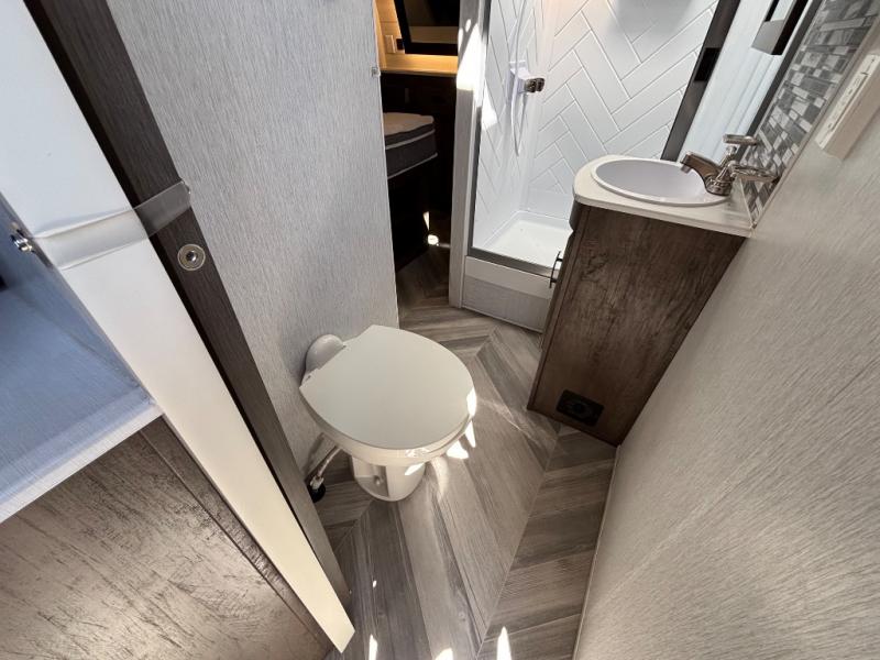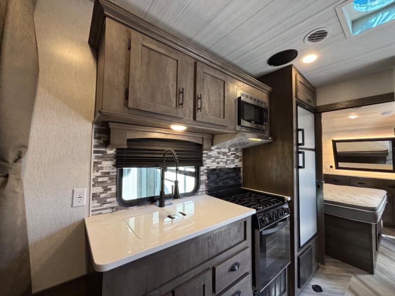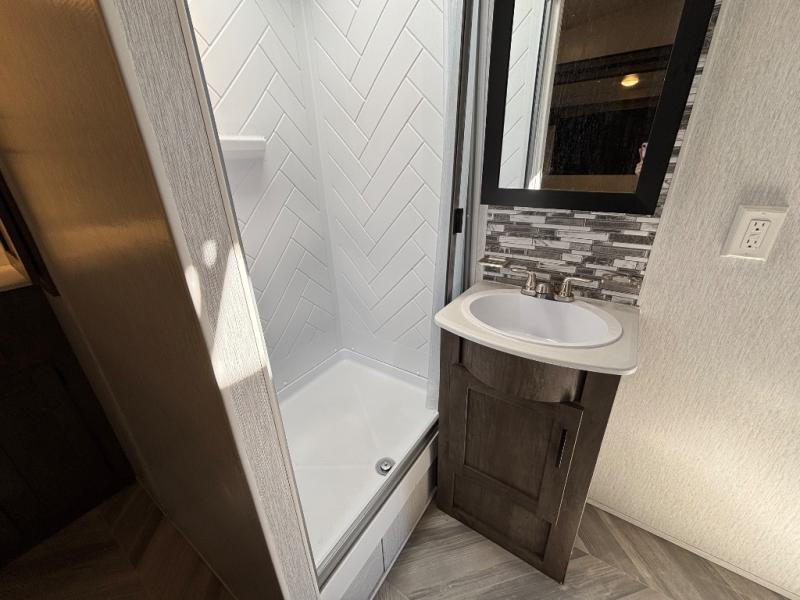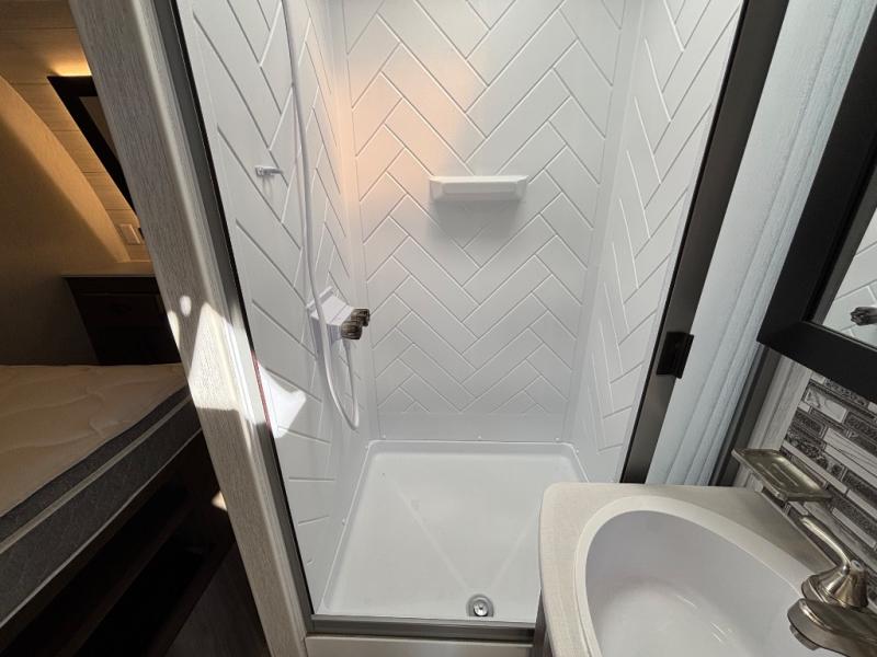 The kitchen is fully equipped with a cooktop, microwave, refrigerator, and sink, while the living area includes an entertainment center and ample seating. The bathroom features a full shower, sink, and toilet for complete convenience on the road.