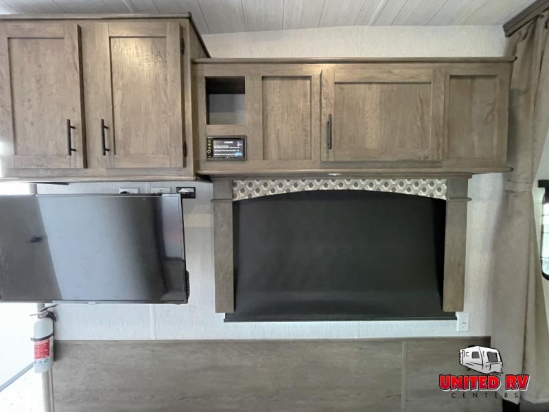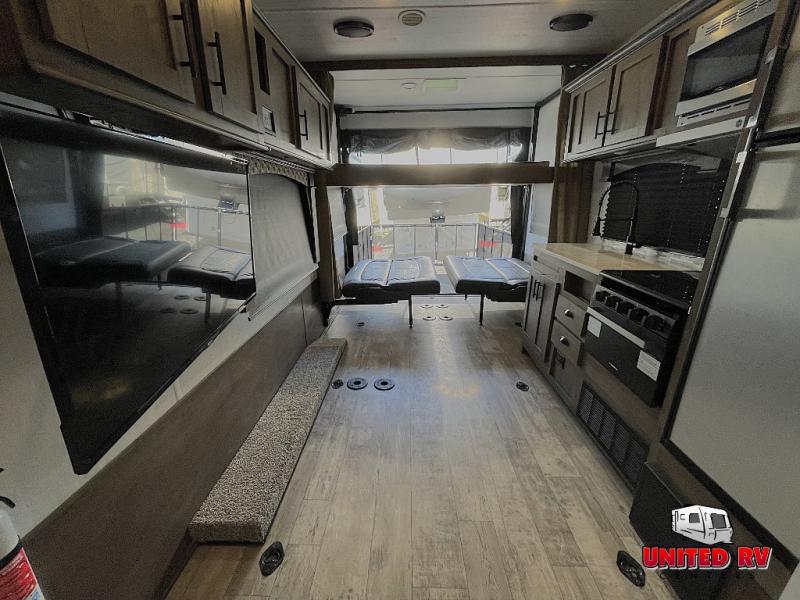 Load up your four wheeler in the 13' 9" cargo space and you're ready to go! You can enjoy a quick lunch on the electric pass-through dinette or you can take your plate outside to sit under the power awning. Get freshened up in the full bath that includes a glass shower, then you can head to the kitchen to find a snack to eat. The 8 cu. ft. double door refrigerator can store all your perishables for the week, and the overhead compartments will come in handy to store dry goods. This model also includes a front private bedroom with a queen bed just like at home, and dual wardrobes for your riding clothes.