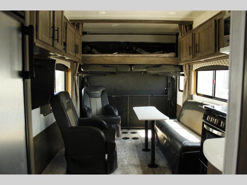 Get ready for a weekend riding the trails in this toy hauler that can sleep seven comfortably. The 14' 4" cargo space will allow you to walk about freely after you've unloaded the dirt bikes. The chef of your group can prepare dinner on the three burner cooktop or use the convenient microwave oven. The private toilet and shower allows someone to freshen up before bed, while the kids or your friends brush their teeth in the sink across the hall.