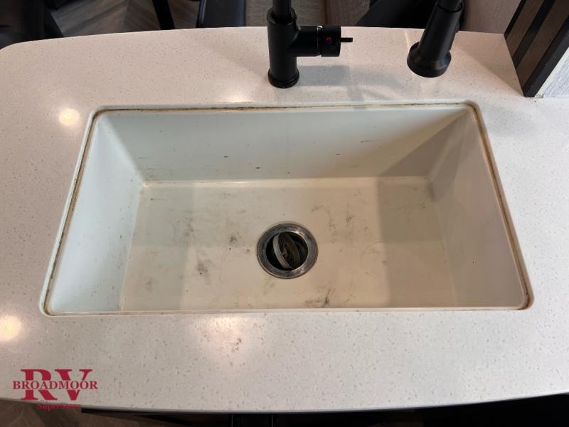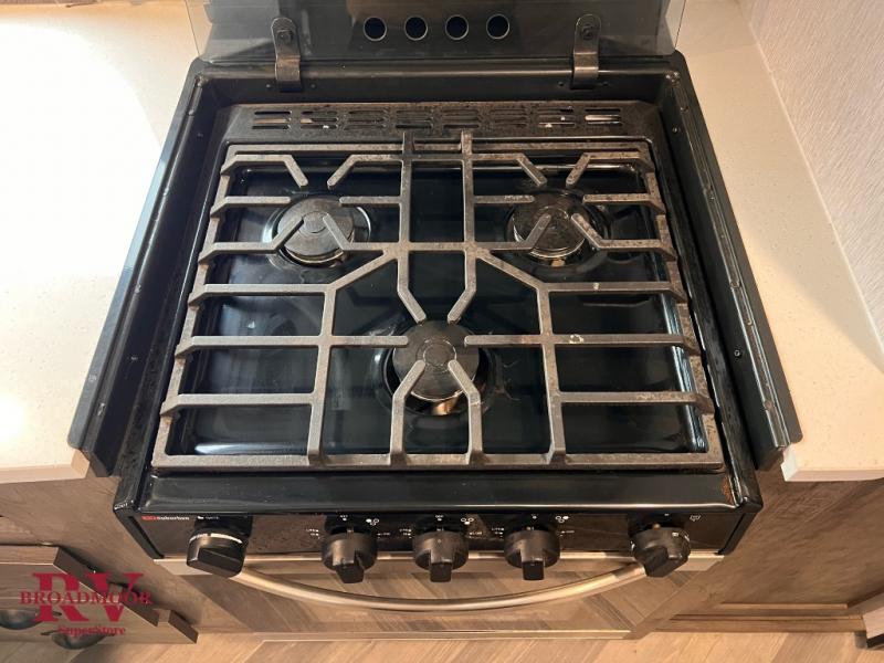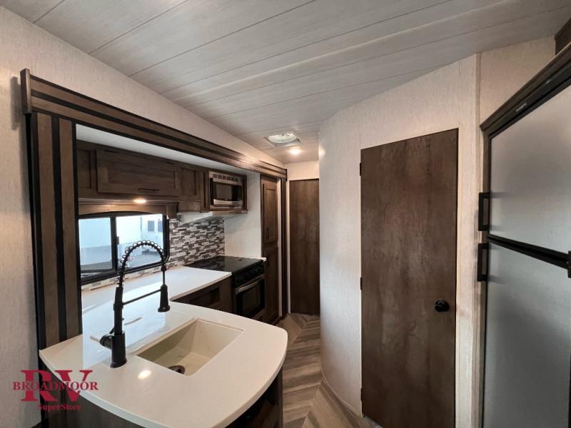 This travel trailer has it all, from the dual entry doors, front master bedroom, and the capacity to sleep seven people each night. The large slide in the kitchen will provide more room to prepare meals and there is a pantry for snacks or dry goods. Your crew will find plenty of seating arrangements on the flip sofa, the electric pass-through dinette, or on the two chairs with a table. There is a power awning with adjustable legs so you can sit outside in the shade, and the exterior storage can store your riding gear!
