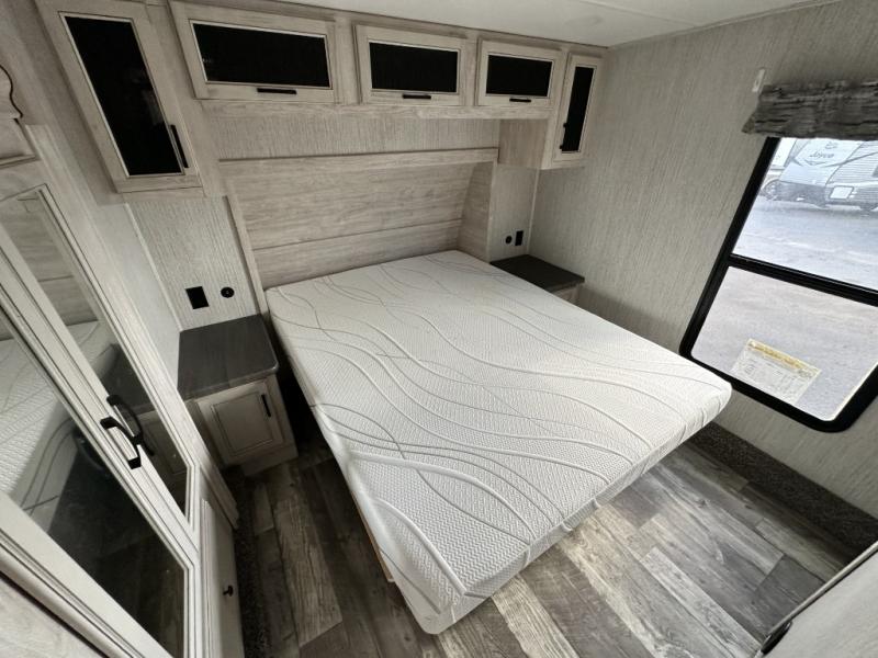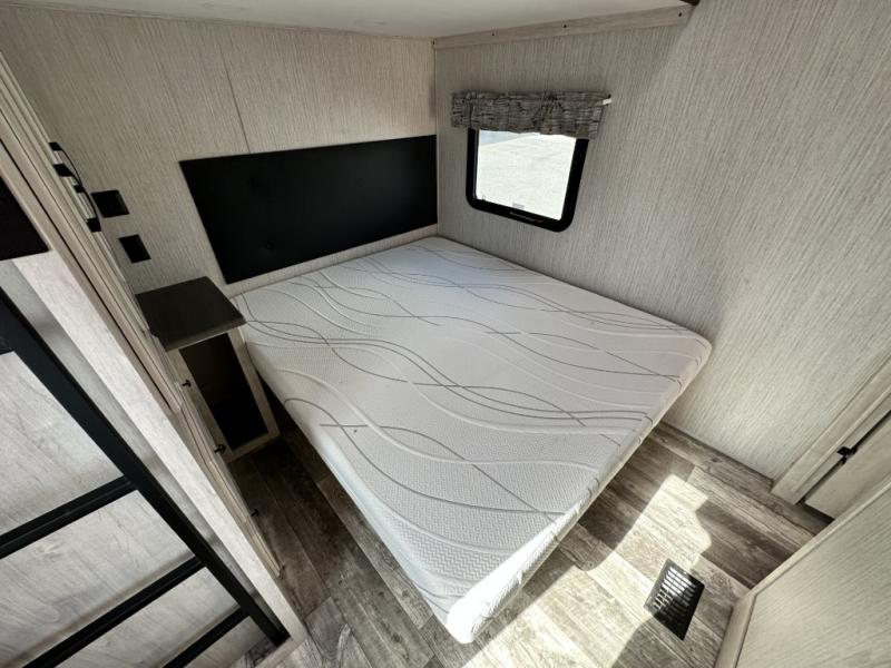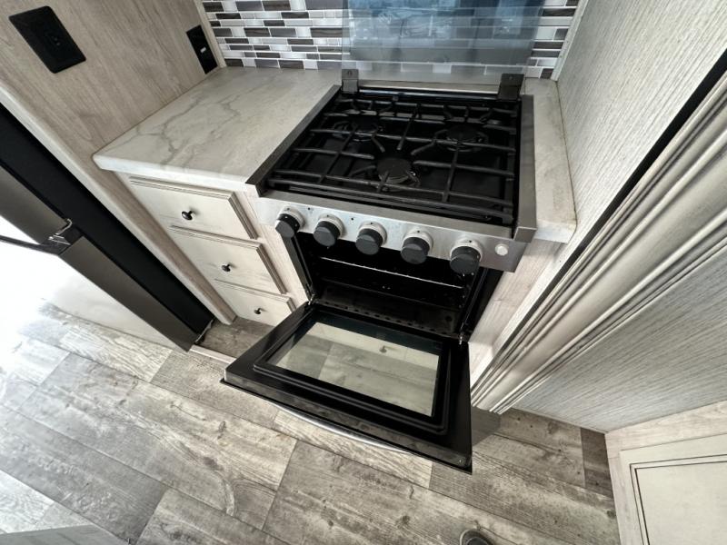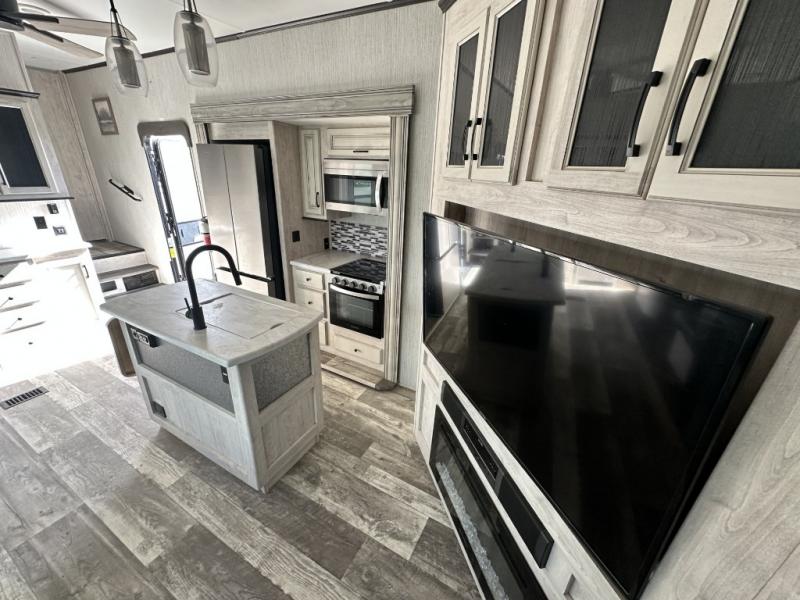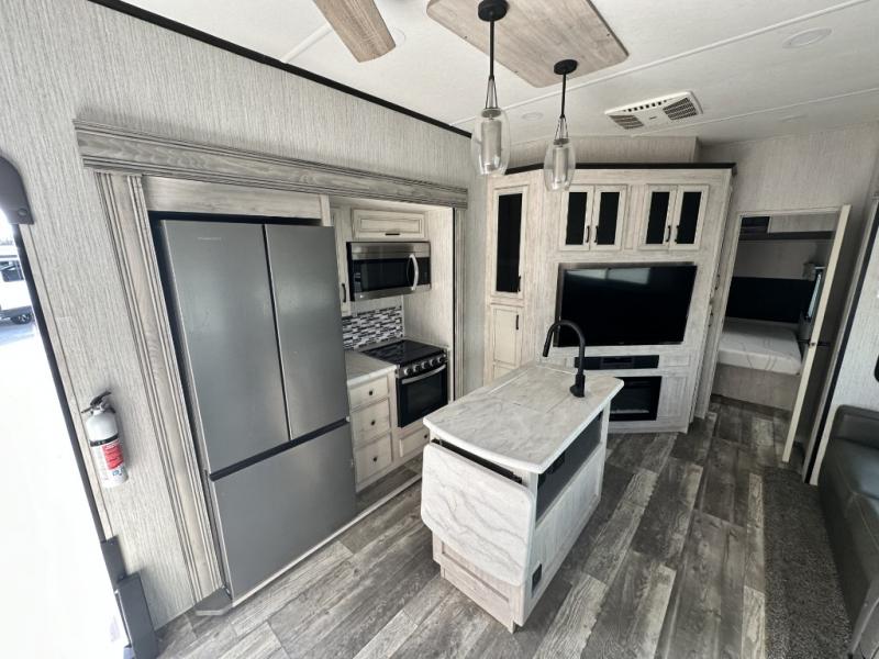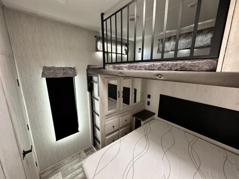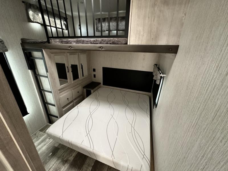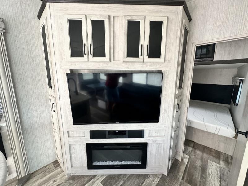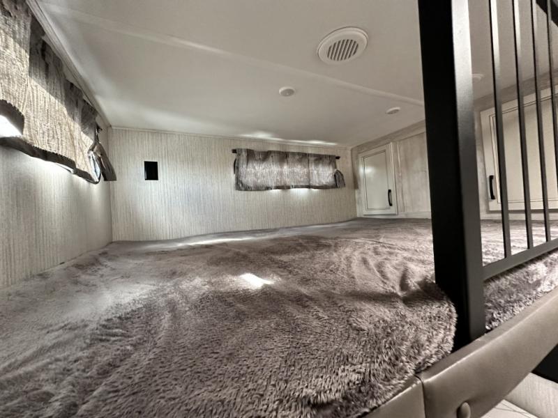 You won't believe all that this fifth wheel has to offer! If you enjoy a morning cup of coffee then you will appreciate the coffee bar area and the comfortable booth dinette or tri-fold hide-a-bed sofa to enjoy it at. The kitchen island will make your meal prepping easier and you can cook more at one time with the four burner cooktop, plus the entertainment center nearby has a fireplace for a cozy ambiance. The rear private bedroom has a unique 54" x 74" loft bed above a 60" x 74" queen bed and a half bathroom with one of the dual entry doors to the unit. There is also a front private bedroom with a queen bed that has nightstands on either side, a wardrobe/linen closet slide, and an entrance into the dual entry bathroom. You even have an outside bumper mount swivel gas grill to grill the catch of the day!