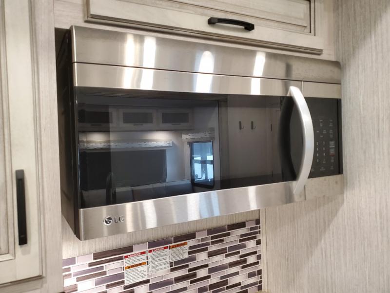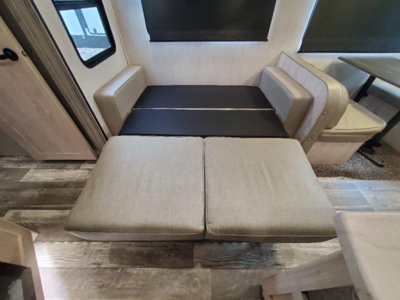 You won't believe all that this fifth wheel has to offer! If you enjoy a morning cup of coffee then you will appreciate the coffee bar area and the comfortable booth dinette or tri-fold hide-a-bed sofa to enjoy it at. The kitchen island will make your meal prepping easier and you can cook more at one time with the four burner cooktop, plus the entertainment center nearby has a fireplace for a cozy ambiance. The rear private bedroom has a unique 54" x 74" loft bed above a 60" x 74" queen bed and a half bathroom with one of the dual entry doors to the unit. There is also a front private bedroom with a queen bed that has nightstands on either side, a wardrobe/linen closet slide, and an entrance into the dual entry bathroom. You even have an outside bumper mount swivel gas grill to grill the catch of the day!