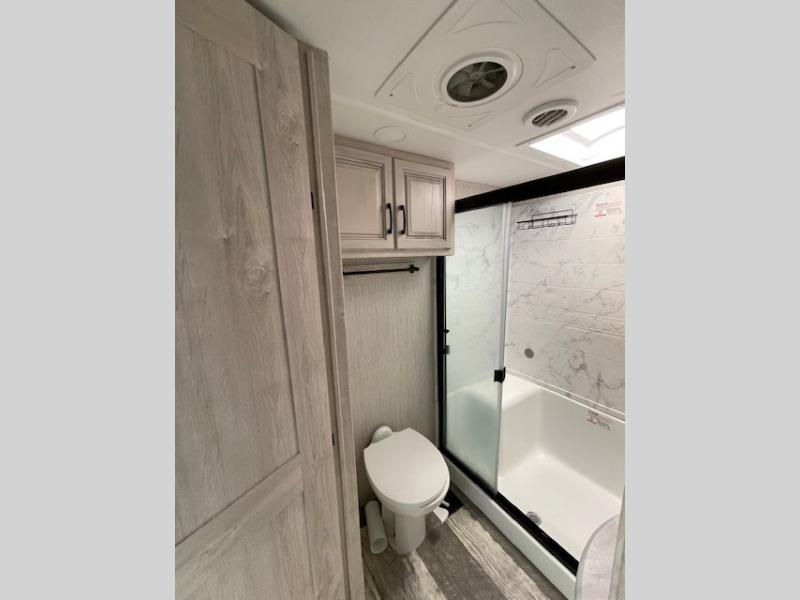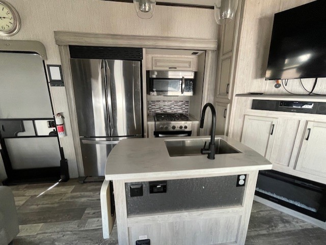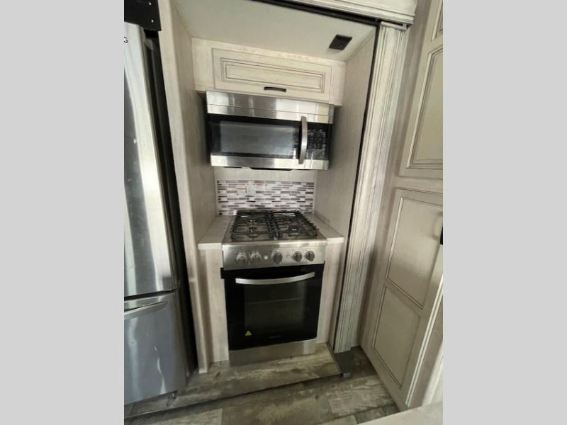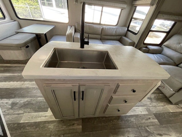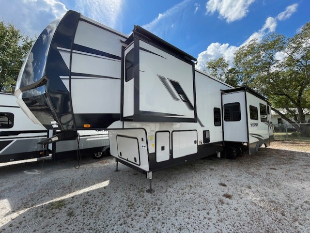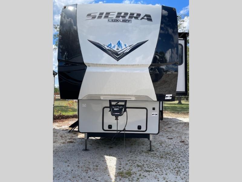 Are you looking to add a little glamour to your camping life? The Forest River Sierra Luxury fifth wheels are luxury units that bring all the fun. These models have an Underbelly Armor, a friction-hinge entry door, an exterior docking station, a high-gloss gel-coat fiberglass exterior, a six-point hydraulic leveling system, and high-efficiency radiant foil for the roof and floor. The interior is stylish and modern with its stainless steel appliances, decorative backsplash, rustic wood plank linoleum, handmade cabinetry, crown molding over the kitchen cabinets, and recessed residential lighting. There is a satellite and cable hookup as well as a King Wi-Fi extender system, and the premium sound bar with built-in flush-mounted DVD player will be great to have when you want to watch a movie.