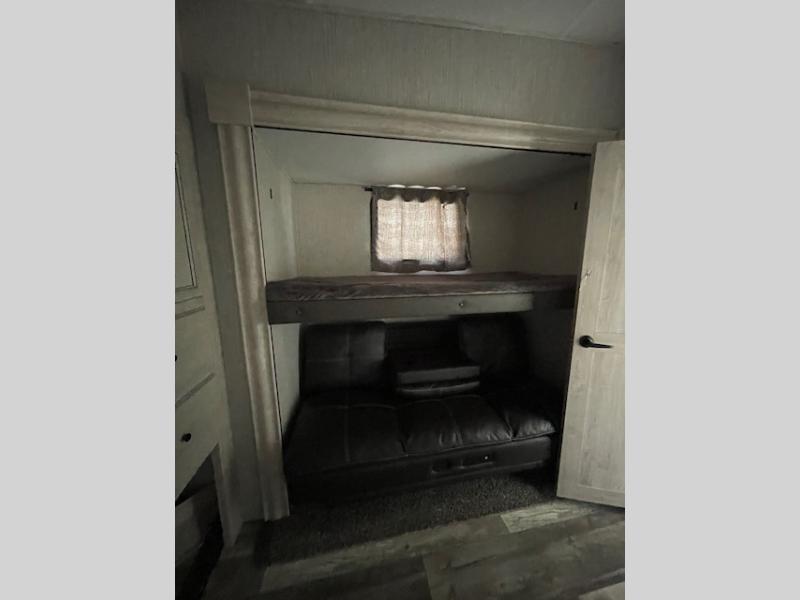 You can create the perfect summer getaway with this Sierra Luxury fifth wheel! After hitting the beach or the mountains, spend some time relaxing on the tri-fold hide-a-bed sofa, theater seating, and booth dinette. If you've worked up a big appetite, you can head straight to the kitchen to get something ready on the four-burner range or in the microwave. You'll also be able to grab quick meals from the 22-cubic foot refrigerator or pantry. The entertainment center has a fireplace and 50" flat screen LED HDTV for later when you want to watch a movie, and the front private bedroom has a queen bed slide, full-width mirrored wardrobe, and dresser. The star of this fifth wheel is the rear bunkhouse suite because it has a rear entertainment center, opposing slides with bunks and a glide sofa, a half bathroom, and the second exterior entrance.