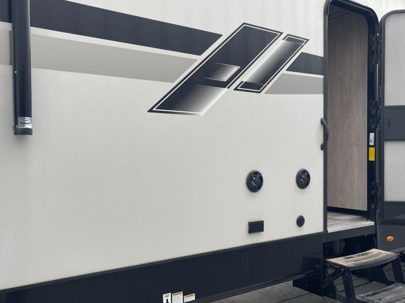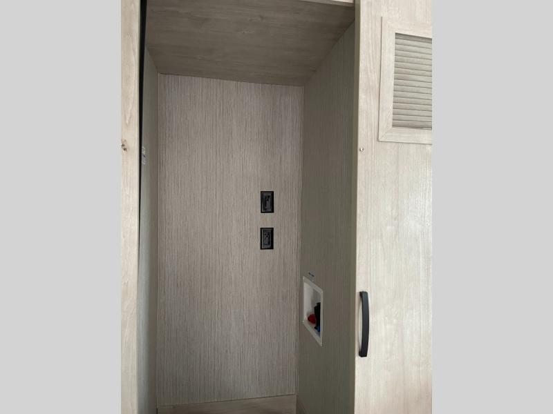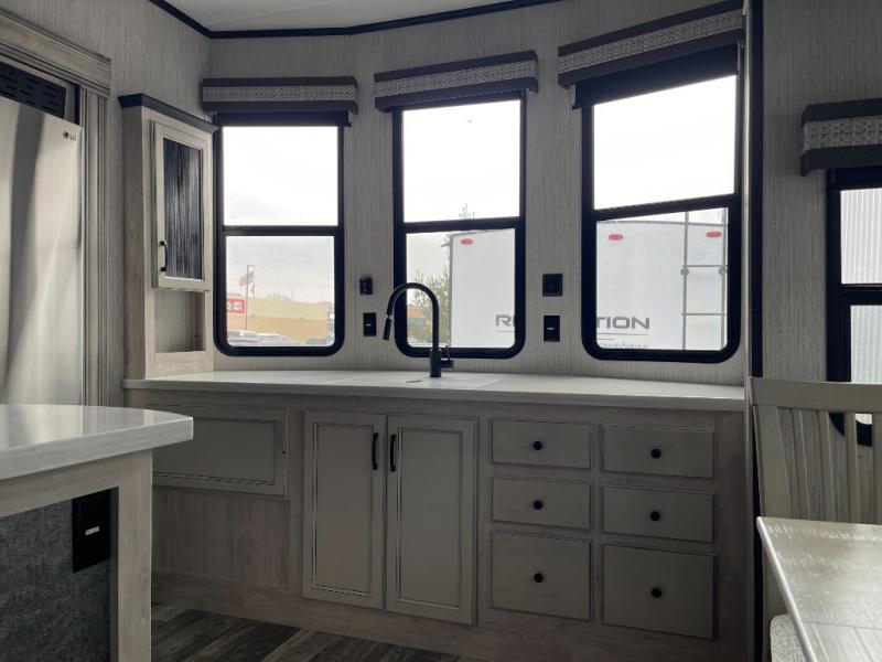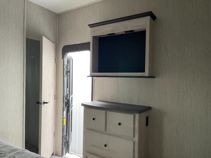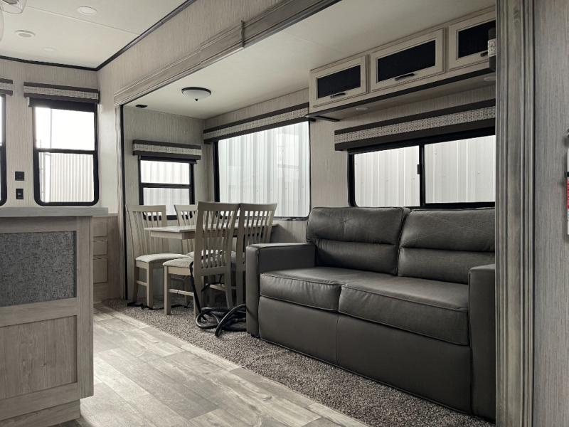No matter where your destination is, you will truly love this unit. The front kitchen features ample counter space to prep meals, and the kitchen island includes pendant lights for a more luxurious look. Your crew can relax on the theater seating, the hide-a-bed sofa, or the free-standing dinette while dinner is being made, and you will stay cool with the breeze from the ceiling fan. The fireplace and entertainment center will make it feel more like home, along with the carpet within the slide out. Cleaning up each day will be easy in the full bath that includes a walk-in shower and convenient storage for your necessities. You will be excited to head to bed each night since this model includes a spacious rear bedroom with a large wardrobe, a dresser, plus a slide out king bed. There is even a space to add an optional washer and dryer if you choose!