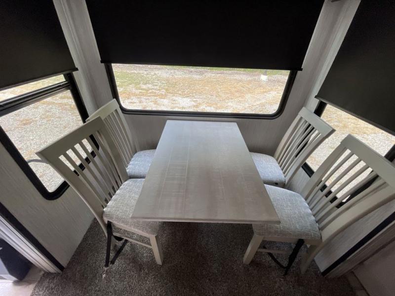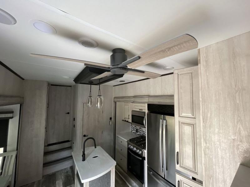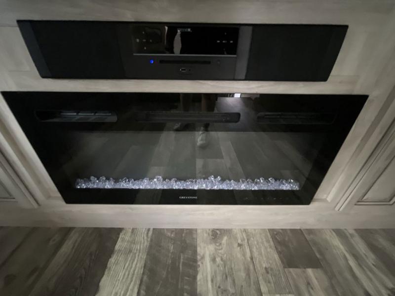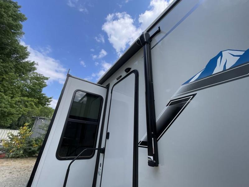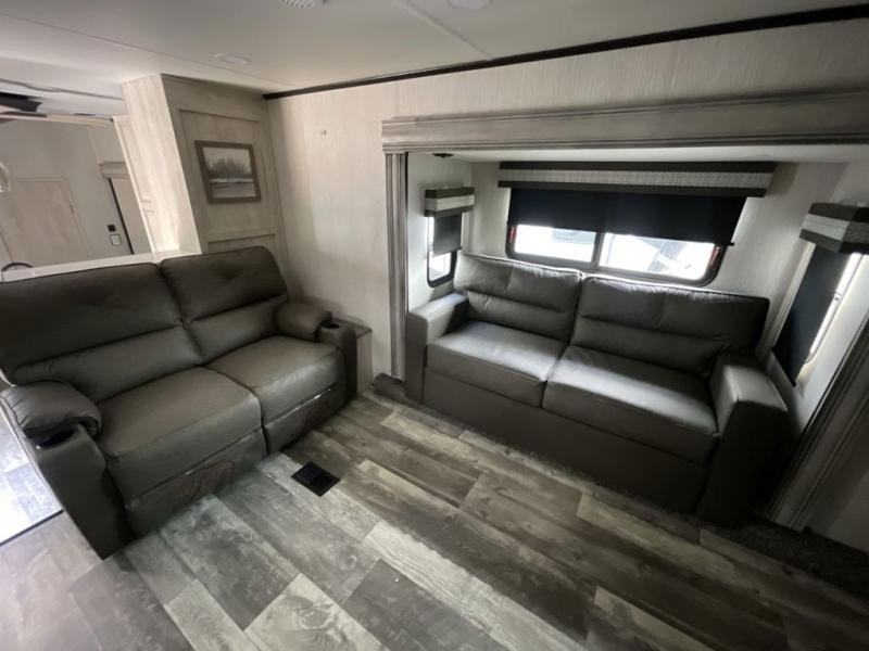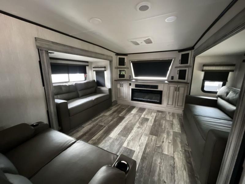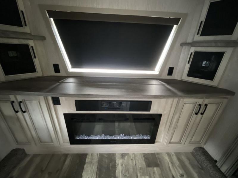 The best adventures will be had in this Sierra Luxury fifth wheel! The rear master suite is excellent because it has its own full bathroom with a dual-sink vanity, and the other half bathroom is located just off the kitchen so that everyone else can use it to freshen up. Above the kitchen is a ceiling fan which will be handy to use when you start working up a sweat while preparing dinner. The free-standing table with chairs is located here too so that you don't have to travel far to enjoy that freshly prepared meal. Head up to the front after dinner to lounge on the theater seating or one of the two tri-fold hide-a-bed sofas. You'll also be able to switch on the fireplace for a more cozy effect.