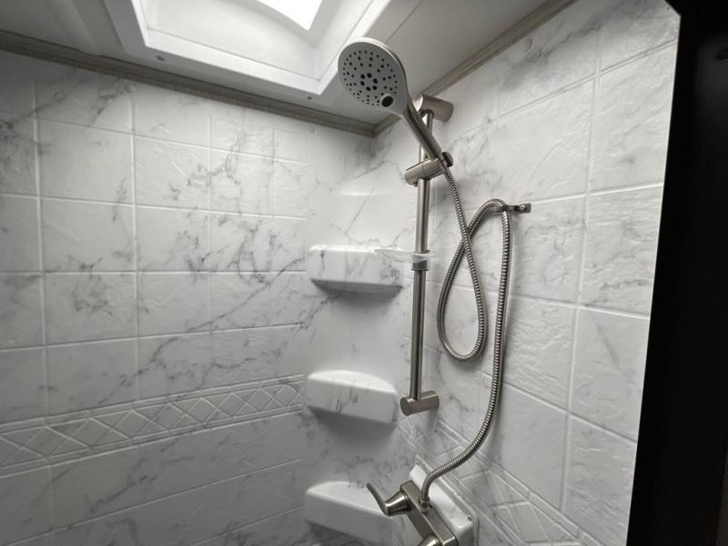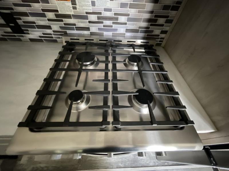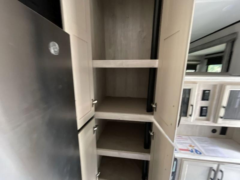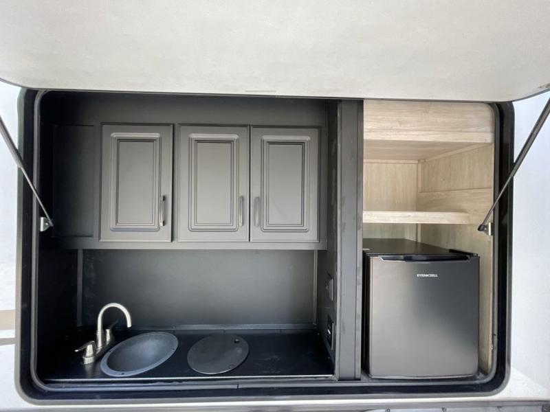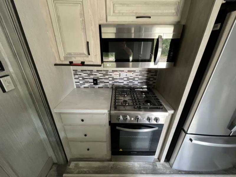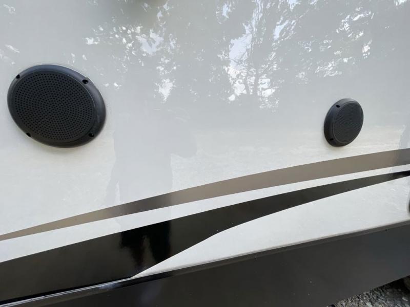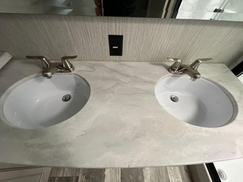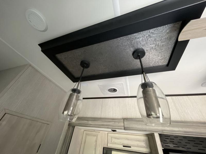 The best adventures will be had in this Sierra Luxury fifth wheel! The rear master suite is excellent because it has its own full bathroom with a dual-sink vanity, and the other half bathroom is located just off the kitchen so that everyone else can use it to freshen up. Above the kitchen is a ceiling fan which will be handy to use when you start working up a sweat while preparing dinner. The free-standing table with chairs is located here too so that you don't have to travel far to enjoy that freshly prepared meal. Head up to the front after dinner to lounge on the theater seating or one of the two tri-fold hide-a-bed sofas. You'll also be able to switch on the fireplace for a more cozy effect.