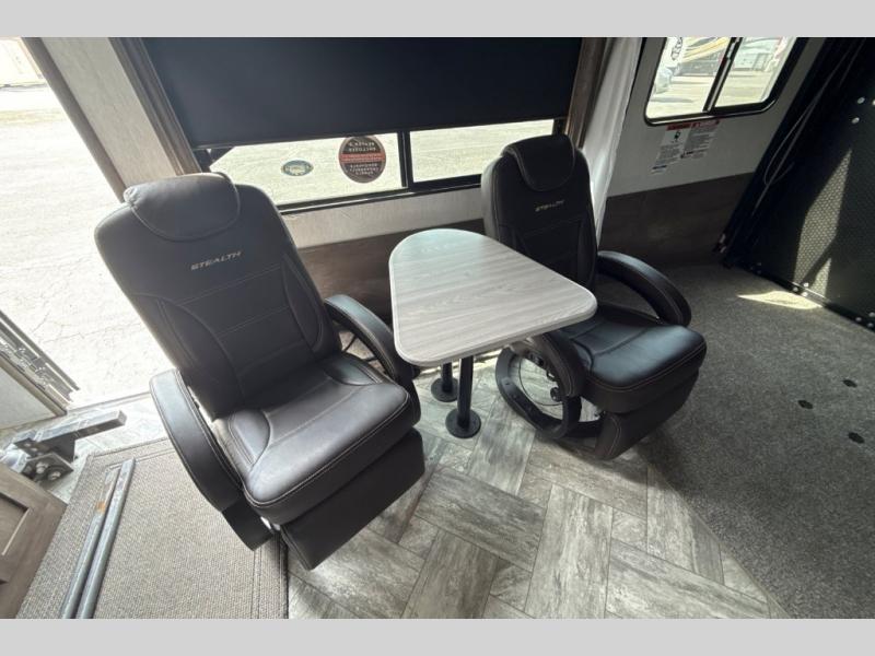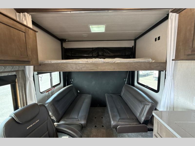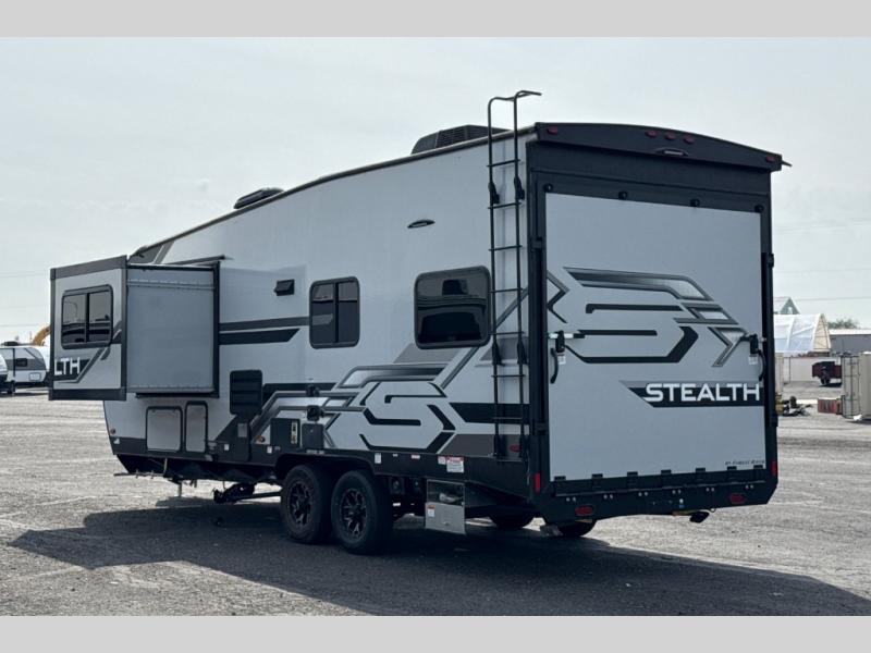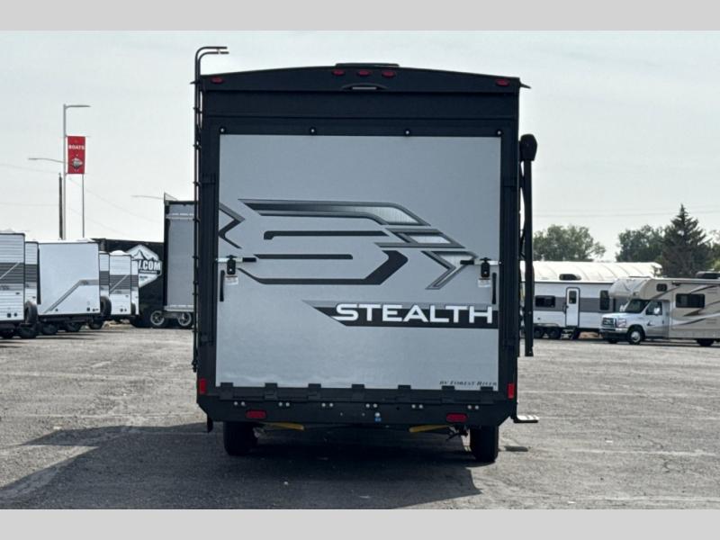 Each one of these Forest River Stealth toy haulers are built with a solid foundation and a 102" wide body construction! The 35 gallon fuel tank will keep your toys filled and ready to hit the trails, plus the black 1,200 lb. tie downs mounted to steel will keep them safe as you travel. These units are filled with luxury from the stainless steel appearance appliances to the pillow top mattress and USB charging ports throughout. The heated and enclosed underbelly and the one-piece seamless PVC roof will protect your unit through all weather conditions. There is also an outside shower with hot and cold water to keep the dirt outside where it belongs. Come find your favorite model today!