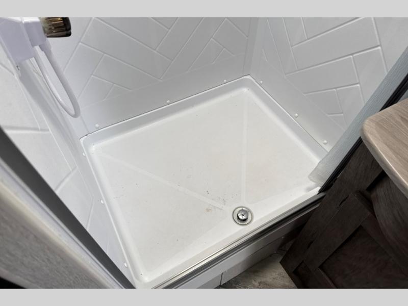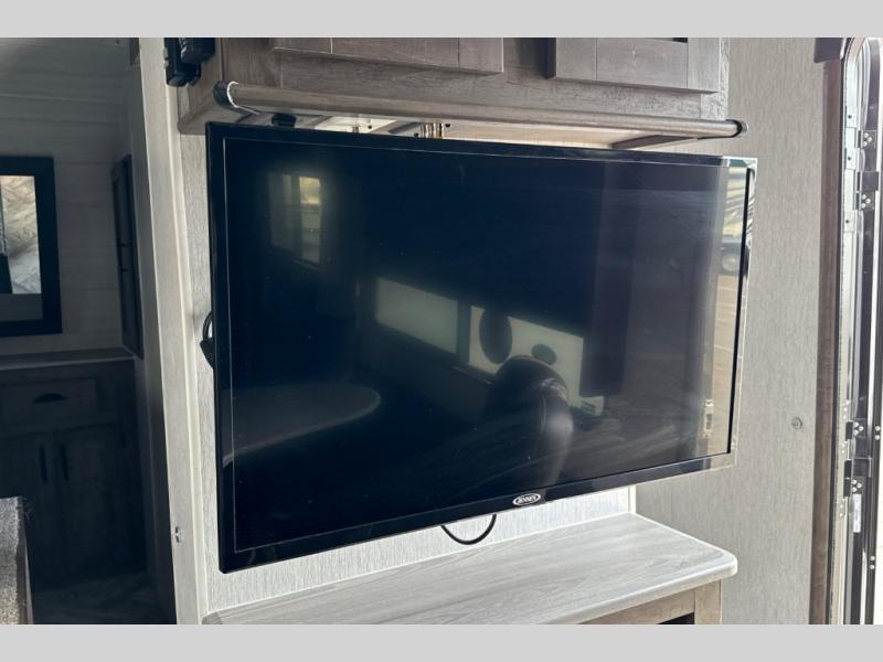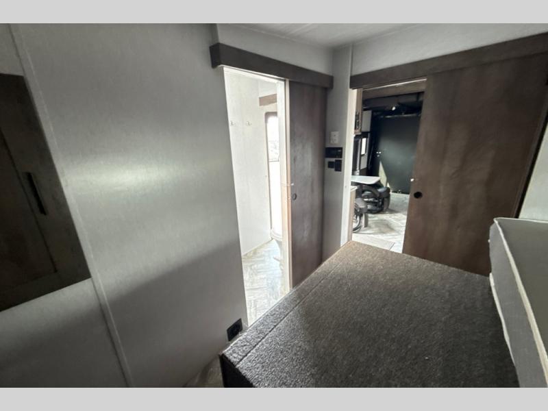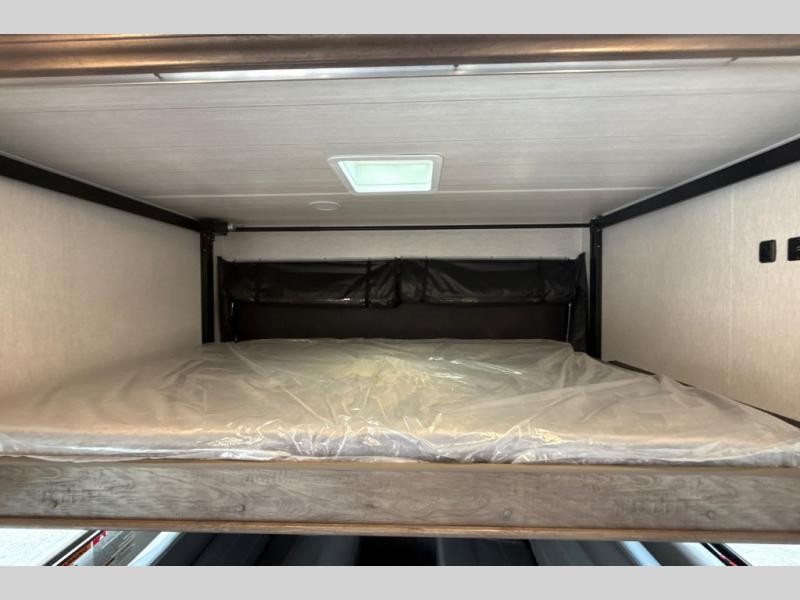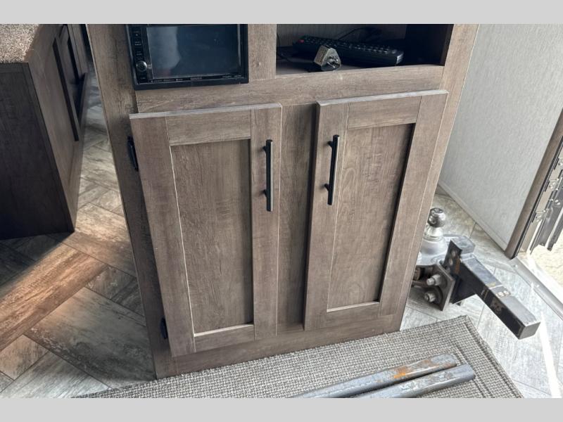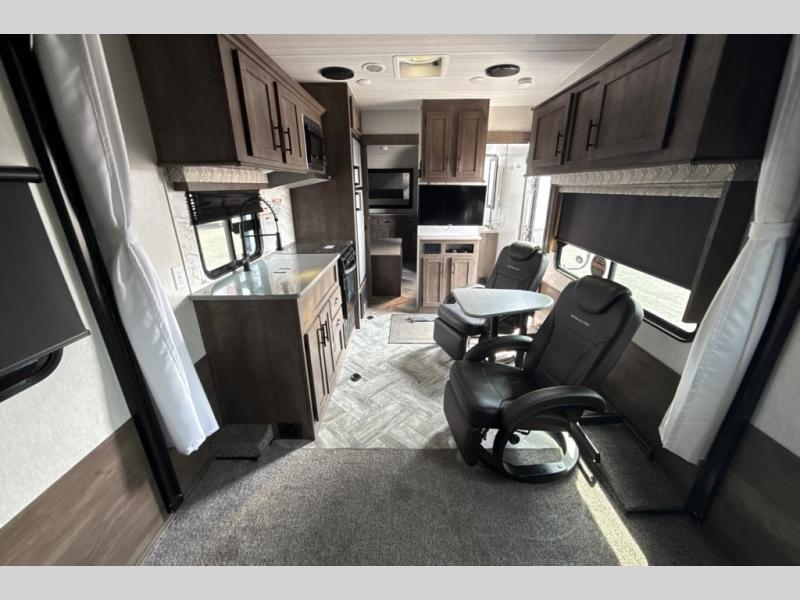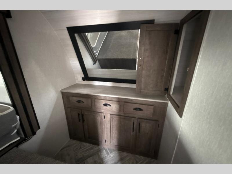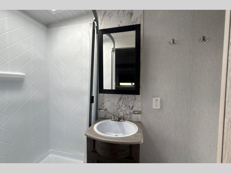 This toy hauler has plenty of storage space between the exterior storage areas, the bedroom wardrobe, the dresser vanity with mirror, and the overhead cabinets all throughout. The dual entry bathroom has a tub/shower for you to wash the mud out of your hair and the outside shower allows you to rinse the mud off your feet before entering. If you want more comforts, you can choose to add the optional lounge chairs with a table to have a place to relax after enjoying a meal at the electric pass-through dinette. The fiberglass exterior will protect your unit for years of fun!