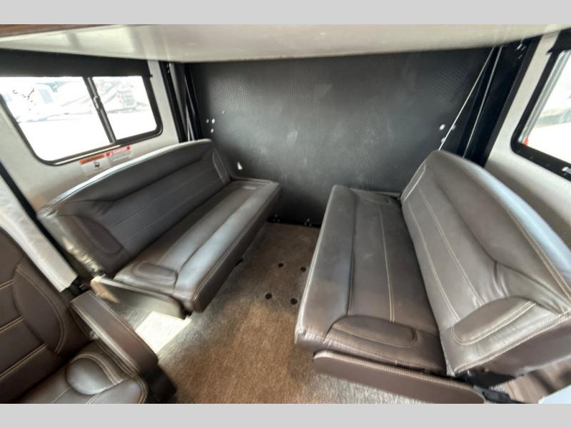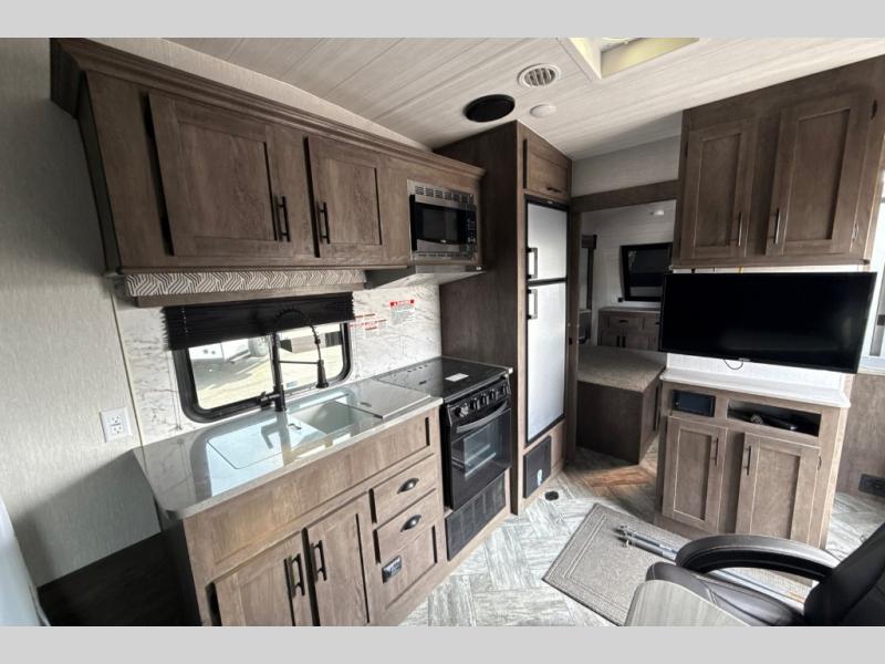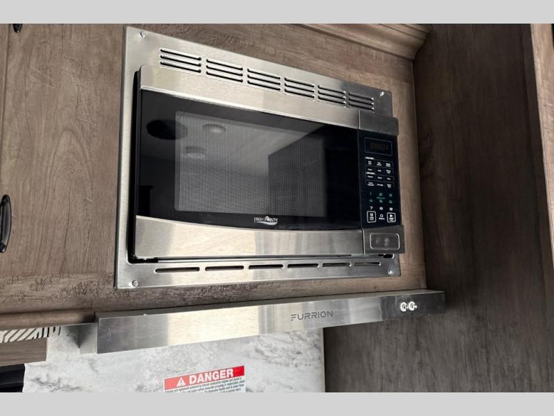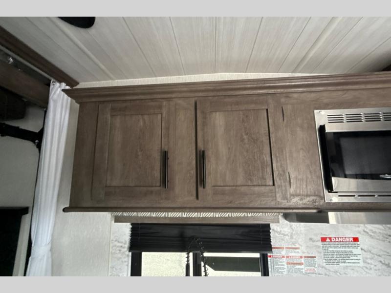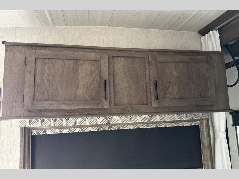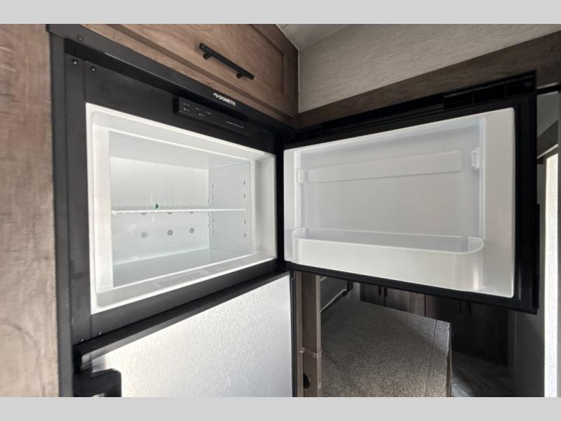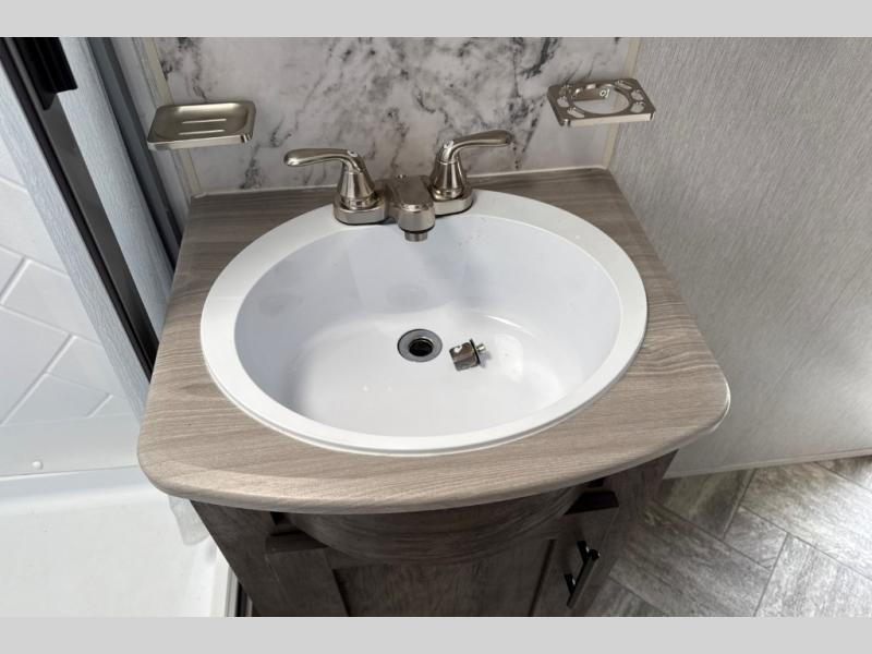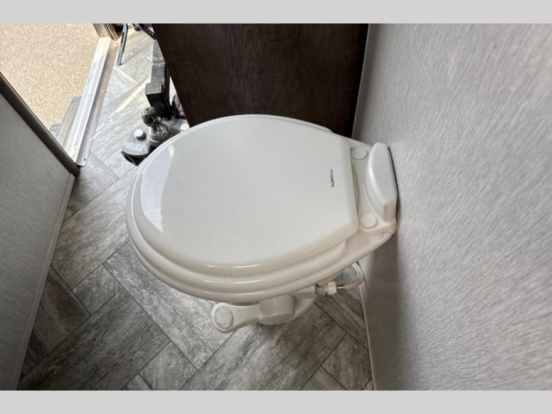 This toy hauler has plenty of storage space between the exterior storage areas, the bedroom wardrobe, the dresser vanity with mirror, and the overhead cabinets all throughout. The dual entry bathroom has a tub/shower for you to wash the mud out of your hair and the outside shower allows you to rinse the mud off your feet before entering. If you want more comforts, you can choose to add the optional lounge chairs with a table to have a place to relax after enjoying a meal at the electric pass-through dinette. The fiberglass exterior will protect your unit for years of fun!
