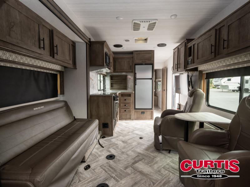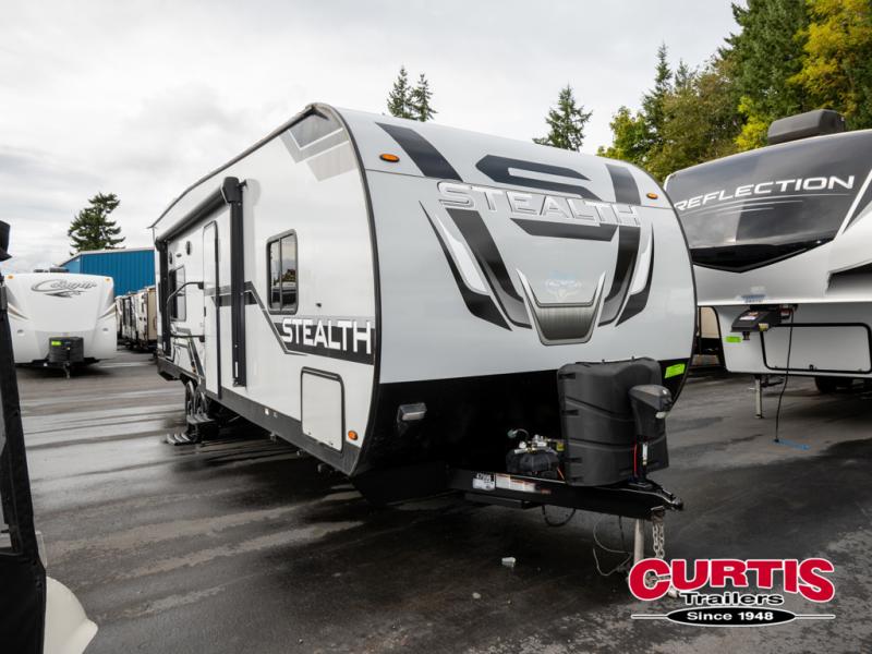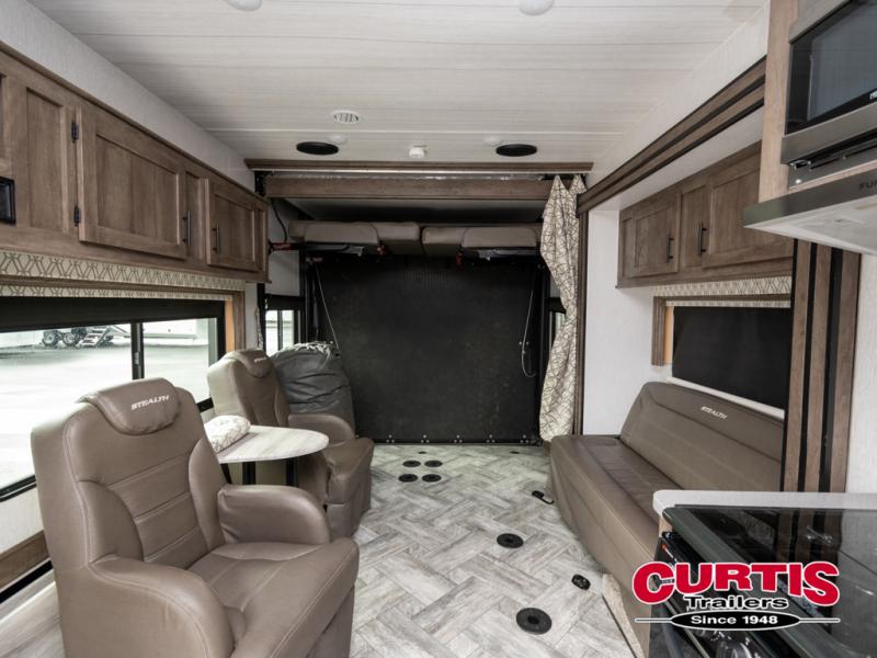 Each one of these Forest River Stealth toy haulers are built with a solid foundation and a 102" wide body construction! The 35 gallon fuel tank will keep your toys filled and ready to hit the trails, plus the black 1,200 lb. tie downs mounted to steel will keep them safe as you travel. These units are filled with luxury from the stainless steel appearance appliances to the pillow top mattress and USB charging ports throughout. The heated and enclosed underbelly and the one-piece seamless PVC roof will protect your unit through all weather conditions. There is also an outside shower with hot and cold water to keep the dirt outside where it belongs. Come find your favorite model today!