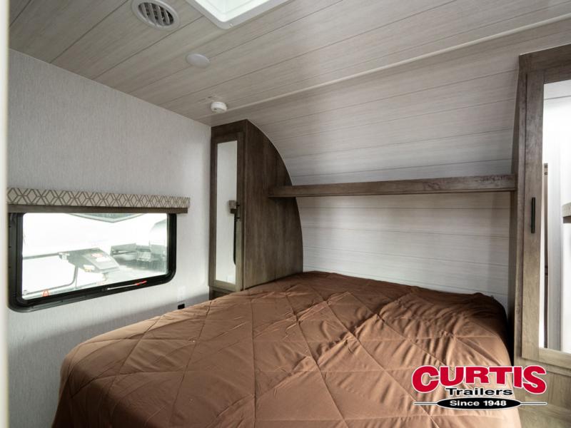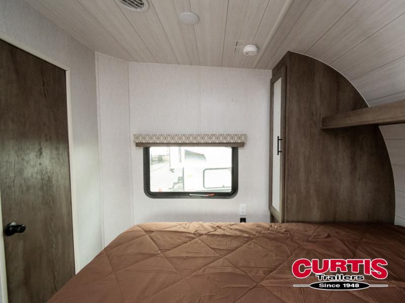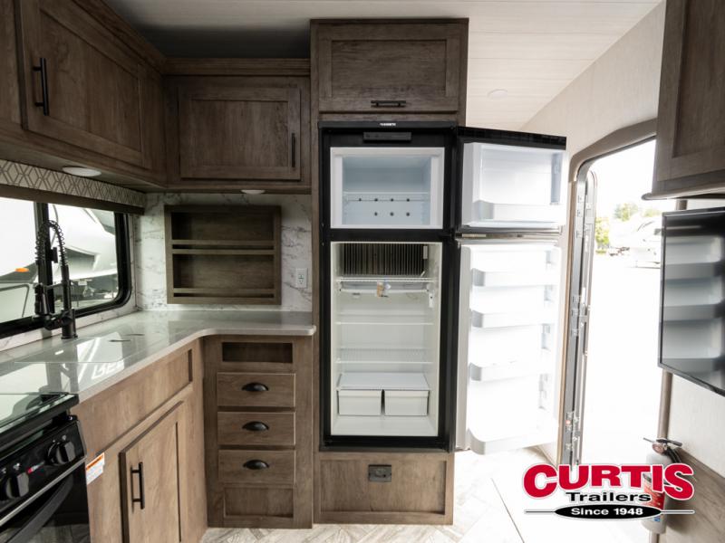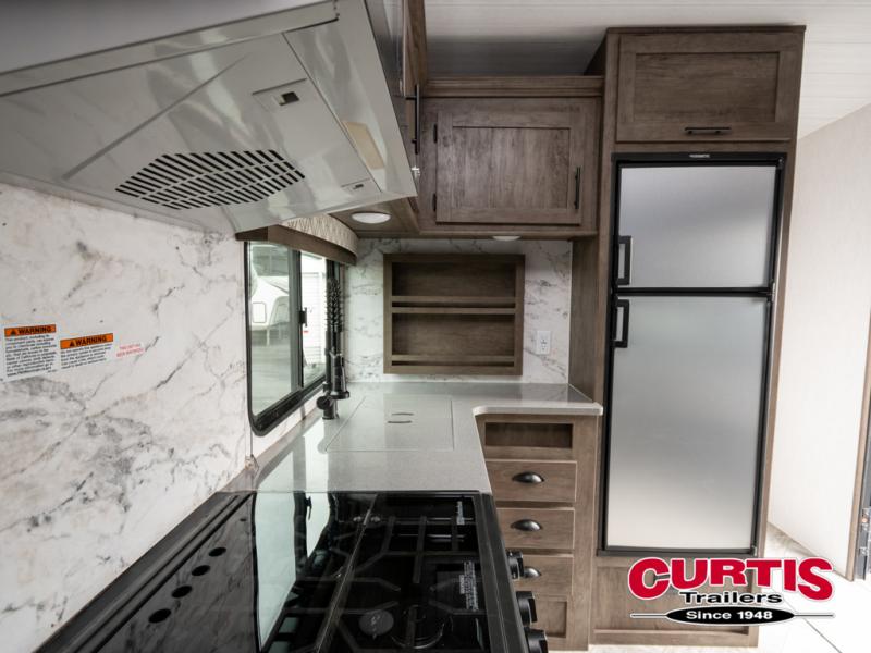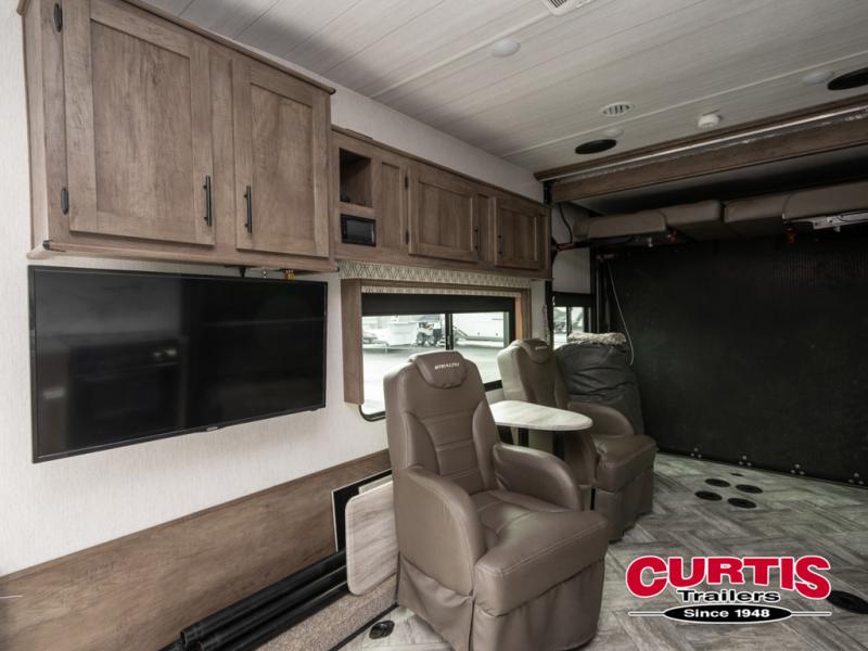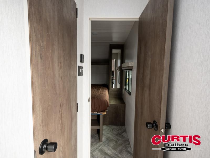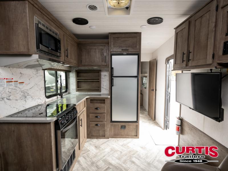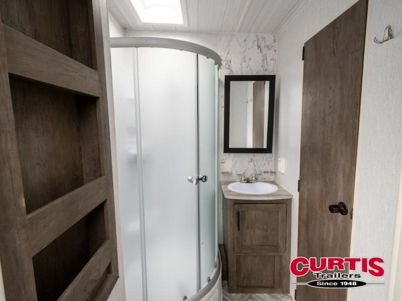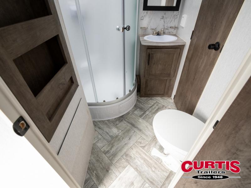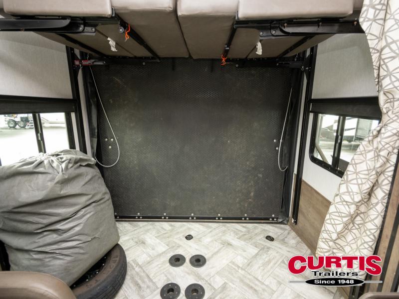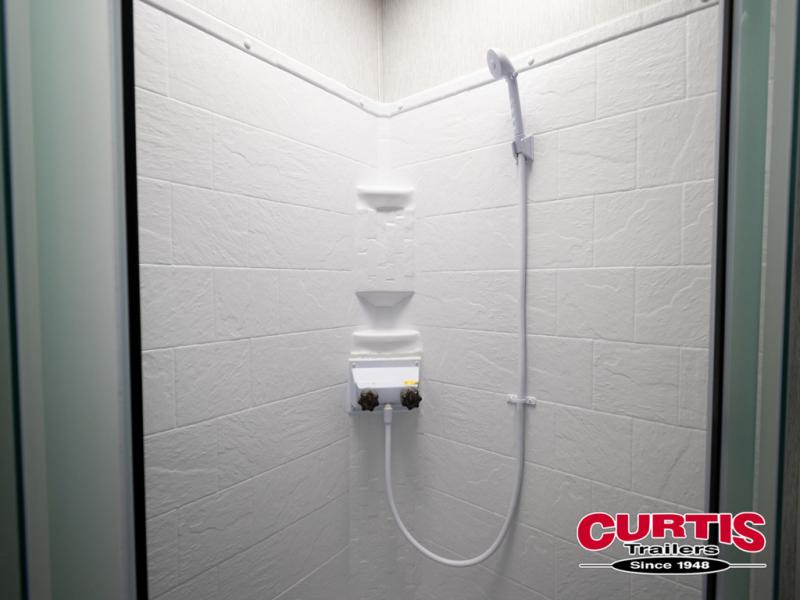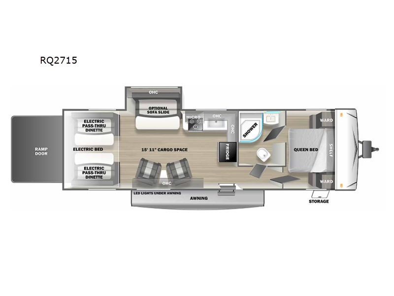 Don't pass up your chance to camp with your favorite off-road toys in this toy hauler! You will feel right at home sleeping on the queen bed in the front private bedroom, and the entrance into the dual entry bathroom will come in very handy at night. The electric pass-through dinette is not only great for enjoying a meal or playing a game, but also for transforming into an extra sleeping space in addition to the electric bed above it!