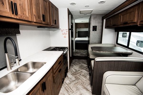 This Sunseeker LE Class C gas motorhome will allow you to travel to other states with your favorite people beside you! You can take a moment to enjoy a fresh cup of coffee in the morning while sitting at the booth dinette or on the sofa, or you can spend a little extra time creating a hearty breakfast in the kitchen on the recessed three-burner range. The 10.7-cubic foot refrigerator will store your cheese and milk, and the convection microwave will heat up leftovers with ease. The separated bathroom leads into the rear bedroom where you will find an RV queen bed with wardrobes on either side, and you can also head outside to enjoy the 15' 6" electric awning with LED lights before bed.