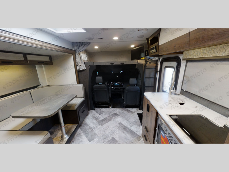 Everything you need is found in this cozy motorhome for five to six people. The swivel captain's seats can become a part of the living area once you park, and your guests can gather around the U-shaped dinette within the full-wall slide. Your meals can be prepared each day on the recessed two burner range, or in the 1.3 cu. ft. stainless steel convection microwave. The flip-up galley counter will provide additional counter space, and your perishables can be stored in the 10.7 cu. ft. 12V refrigerator. The semi-private bedroom features a queen bed, a 12V TV, plus a closet above the built-in dresser. You can also choose to add an optional 12V exterior TV if you enjoy watching the big game outdoors!