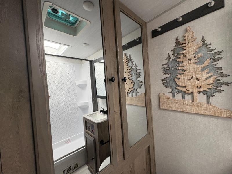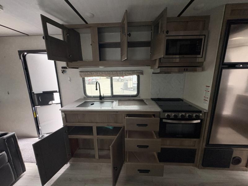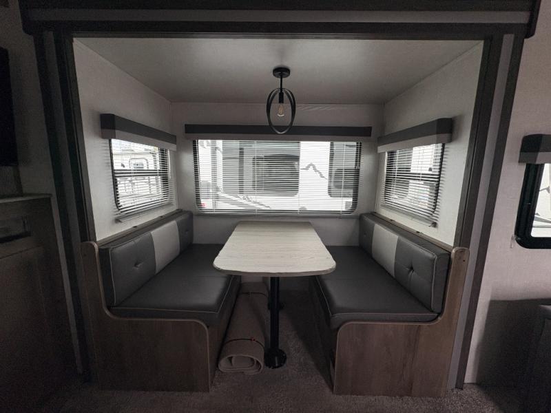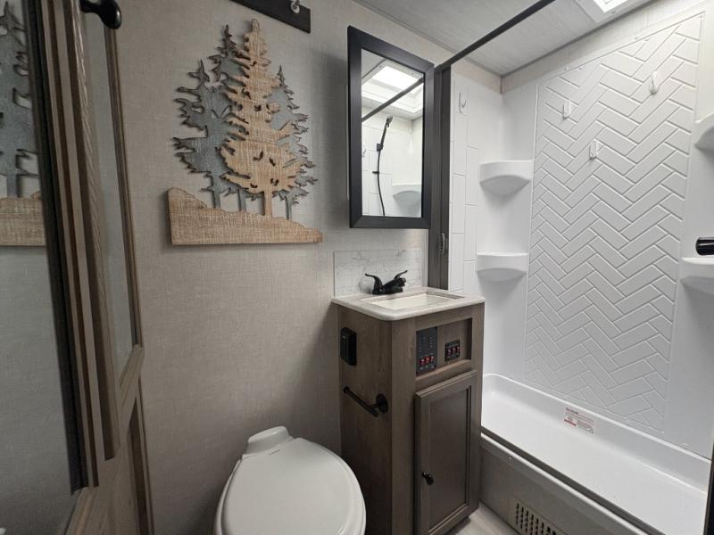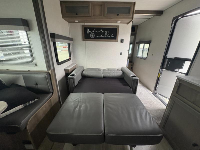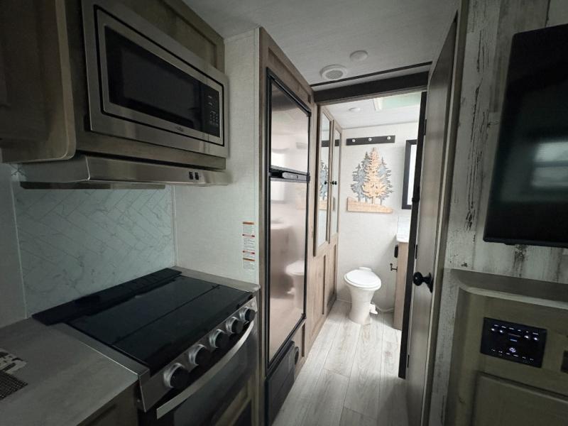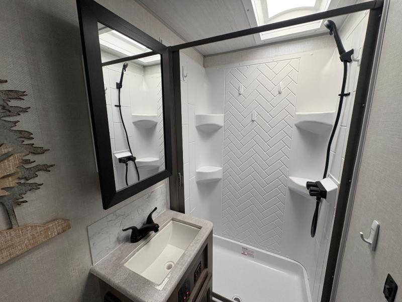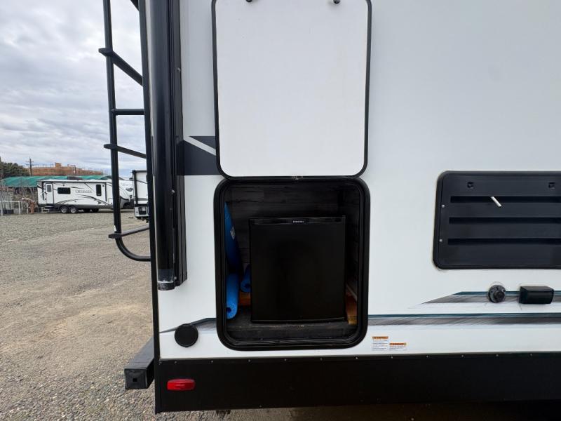 Whether you're camping with friends or family, you'll love the space and comfort found in this travel trailer. The outside kitchen is packed with features, such as a gas griddle, sink, refrigerator, and a shelf, plus there is a 21' one touch electric awning for shade. Head inside to relax on the tri-fold sofa, or play a game at the booth dinette. You may even want to add the optional TV if you don't like to miss out on your shows. This model includes a full rear bath with a linen closet for clean towels and a shower skylight for added light and standing space.