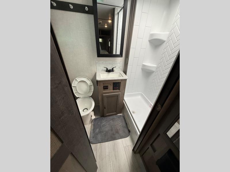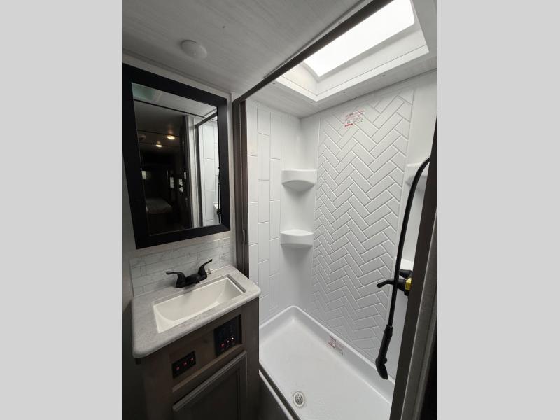 With any Surveyor Legend travel trailer by Forest River you will enjoy quality craftsmanship, convenient amenities, and at-home comforts. The Azdel composite panels provide a longer-lasting trailer, and the power tongue jack will get you back on the road in no-time. Each model includes the Surveyor Legend Package that comes standard with pleated night shades, an automotive style tinted front windshield, a multi-zone Bluetooth stereo, and more. You'll enjoy the one-touch electric awning with LED lights outdoors, plus rooftop solar prep and rear camera prep to make parking easier than ever. The inside will have you feeling right at home with Surf(x) seamless countertops, Congoleum designer carefree linoleum, residential faucets in the bath and kitchen, plus many more essentials you won't want to camp without.