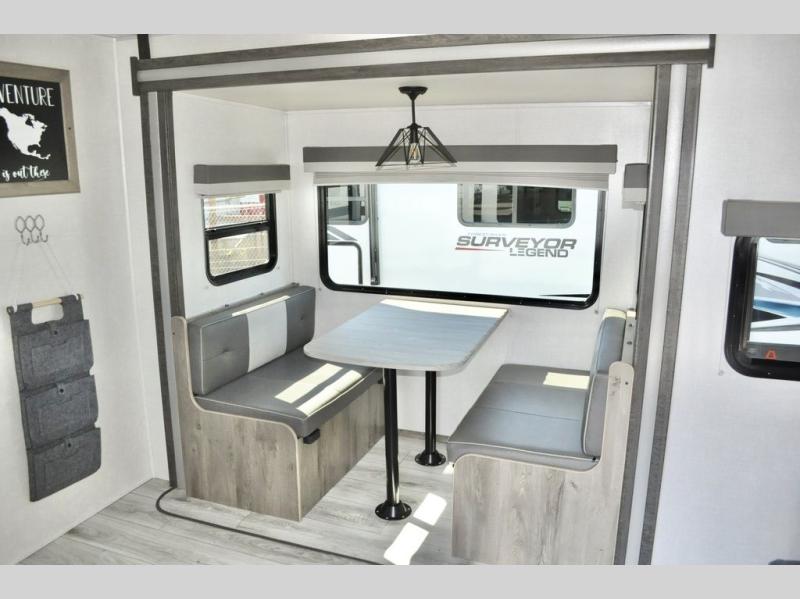 With any Surveyor Legend travel trailer by Forest River you will enjoy quality craftsmanship, convenient amenities, and at-home comforts. The Azdel composite panels provide a longer-lasting trailer, and the Lippert axles leaf spring suspension will make towing easier than ever. You will enjoy many interior comforts, such as modern frame edge cabinets, designer Shaw lino flooring, an Indura-Kleen Evergreen mattress, and EZ-access dinette storage to bring along board games, flashlights, and throw blankets. The magnetic baggage door catches allow you to easily pack up your gear, and the friction hinge entry door(s) will make coming and going smooth as ever. Each model includes a 30K BTU ducted furnace, or a 20K BTU furnace in the Sub-4's, a 15K high performance A/C, plus a fully enclosed and heated underbelly to keep you comfortable through spring, summer, fall, or winter!