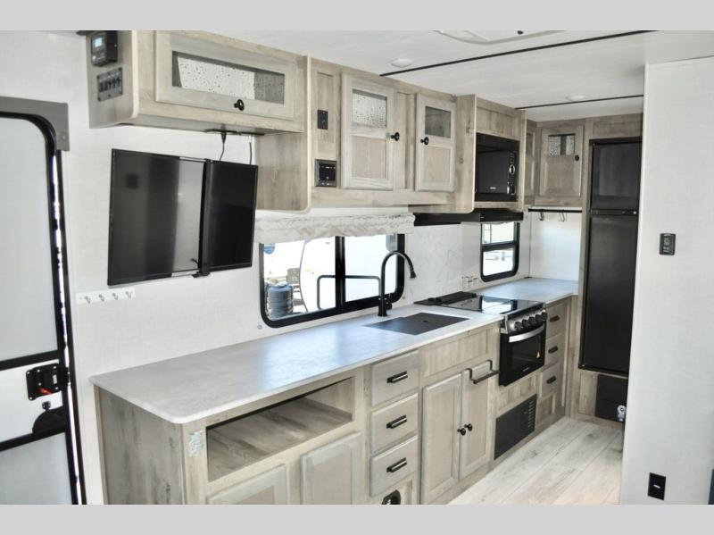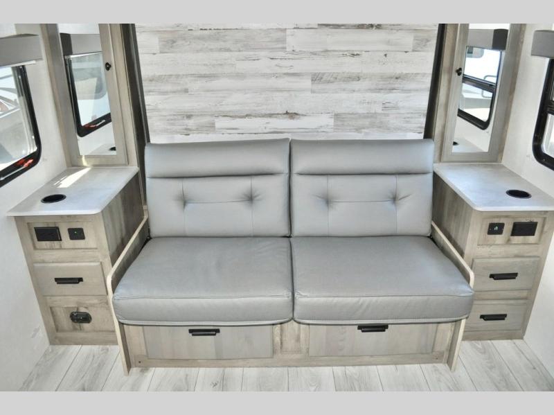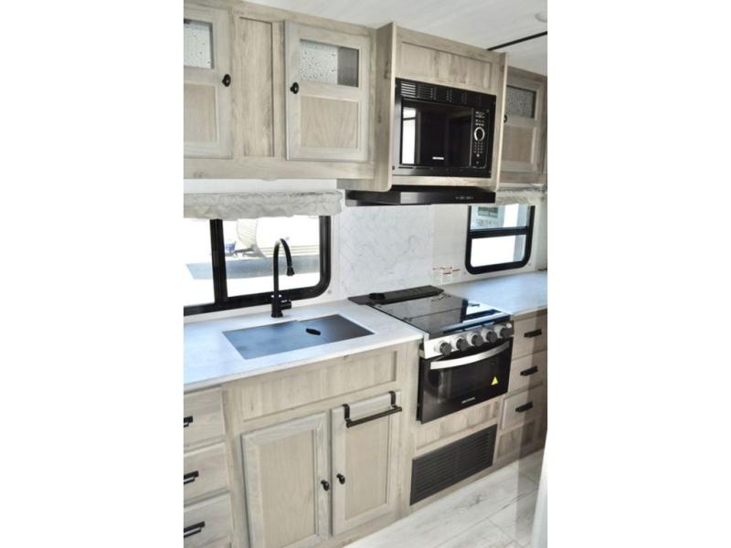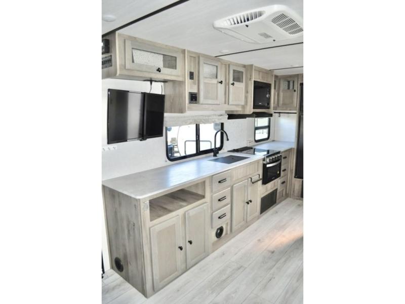 Head to your local state park for fun weekends in this cute couple's trailer. You can convert the sofa to a queen-size Murphy bed each night, and if you have guests they can sleep on the booth dinette. The chef of your group will have their choice to cook indoors on the three burner cooktop, or outdoors on the gas griddle. There is also an outdoor sink, refrigerator, and shelf to store spices. Each day you can clean up in the full bath that includes a shower skylight, a 12V power exhaust fan, and a linen closet for clean towels. This model even includes decorative wall art to make you feel right at home!