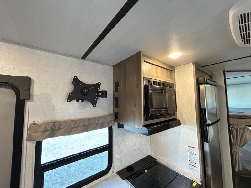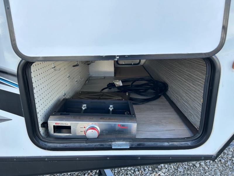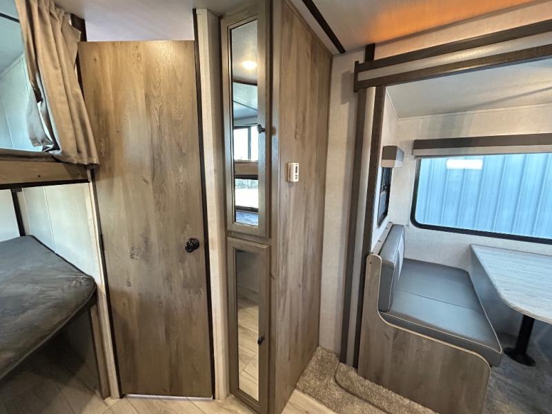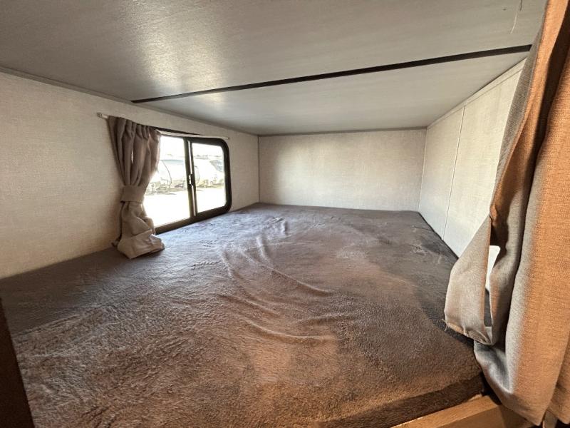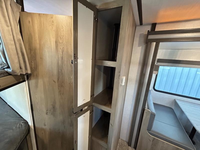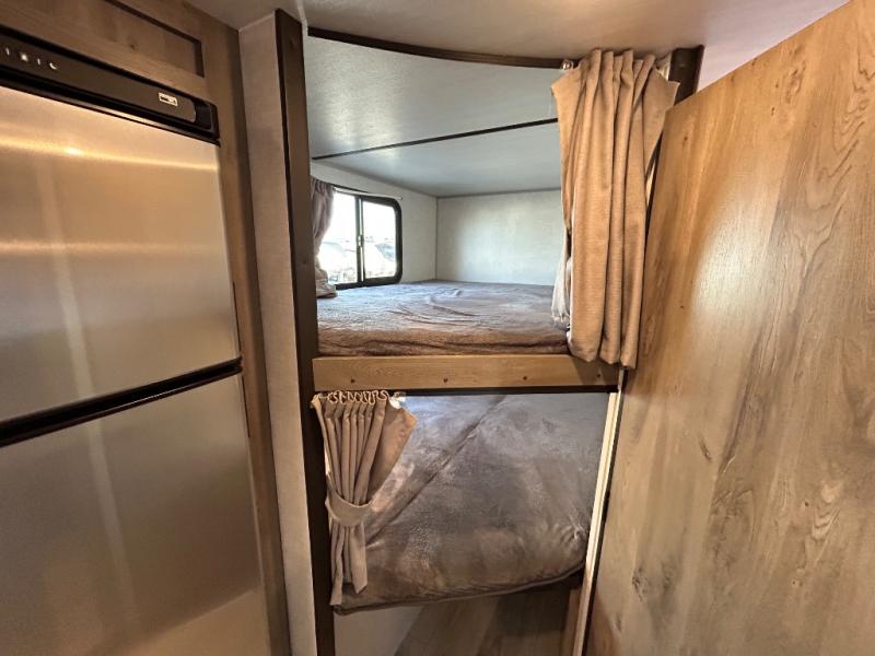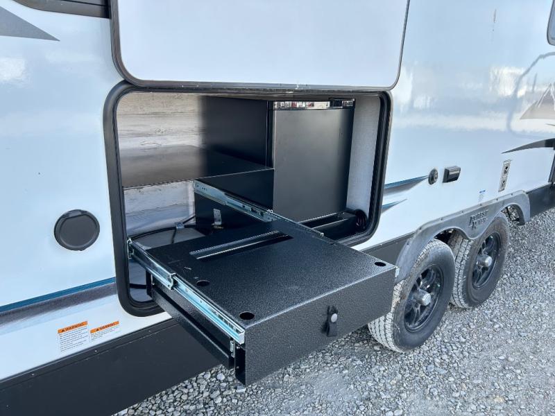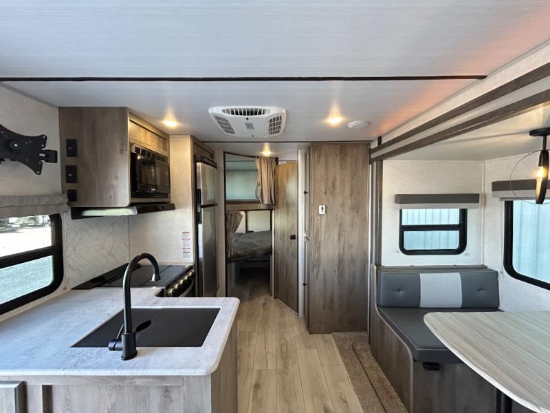 Adventure starts with this travel trailer in tow! The under-bunk storage is big enough to bring along a kayak, and there is a rear storage door to make unpacking easier than ever. The chef of your group can start lunch on the outside kitchen, while the 18' one touch electric awning is being set up and the chairs are being taken out of the pass-through storage. Up front you'll appreciate a privacy curtain around the queen-size Murphy bed, and there are dual wardrobes to keep your clothes neat and clean. This model also includes a full bath to stay clean each day, plus a slide out dinette for added space!