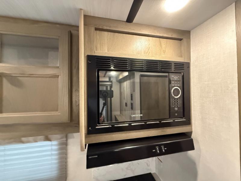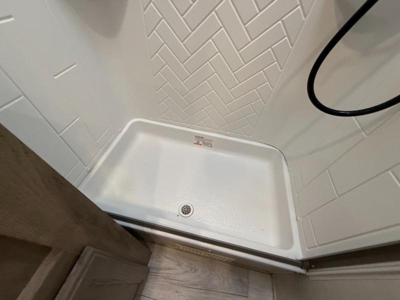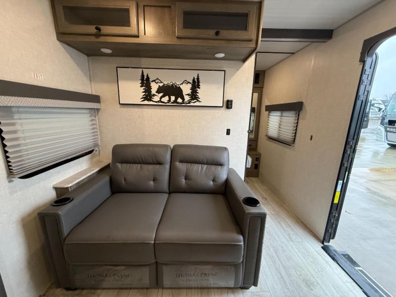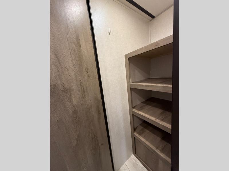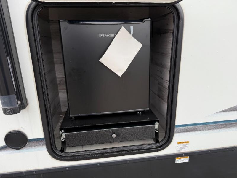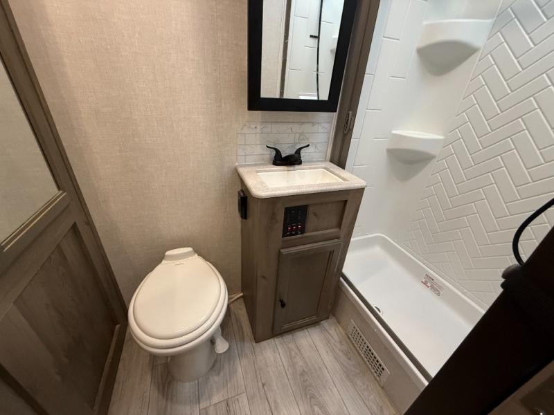 Whether you're camping with friends or family, you'll love the space and comfort found in this travel trailer. The outside kitchen is packed with features, such as a gas griddle, sink, refrigerator, and a shelf, plus there is a 21' one touch electric awning for shade. Head inside to relax on the tri-fold sofa, or play a game at the booth dinette. You may even want to add the optional TV if you don't like to miss out on your shows. This model includes a full rear bath with a linen closet for clean towels and a shower skylight for added light and standing space.