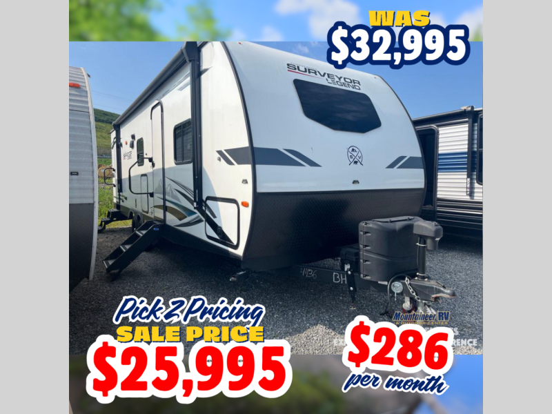 With any Surveyor Legend travel trailer by Forest River you will enjoy quality craftsmanship, convenient amenities, and at-home comforts. The Azdel composite panels provide a longer-lasting trailer, and the Lippert axles leaf spring suspension will make towing easier than ever. You will enjoy many interior comforts, such as modern frame edge cabinets, designer Shaw lino flooring, an Indura-Kleen Evergreen mattress, and EZ-access dinette storage to bring along board games, flashlights, and throw blankets. The magnetic baggage door catches allow you to easily pack up your gear, and the friction hinge entry door(s) will make coming and going smooth as ever. Each model includes a 30K BTU ducted furnace, or a 20K BTU furnace in the Sub-4's, a 15K high performance A/C, plus a fully enclosed and heated underbelly to keep you comfortable through spring, summer, fall, or winter!