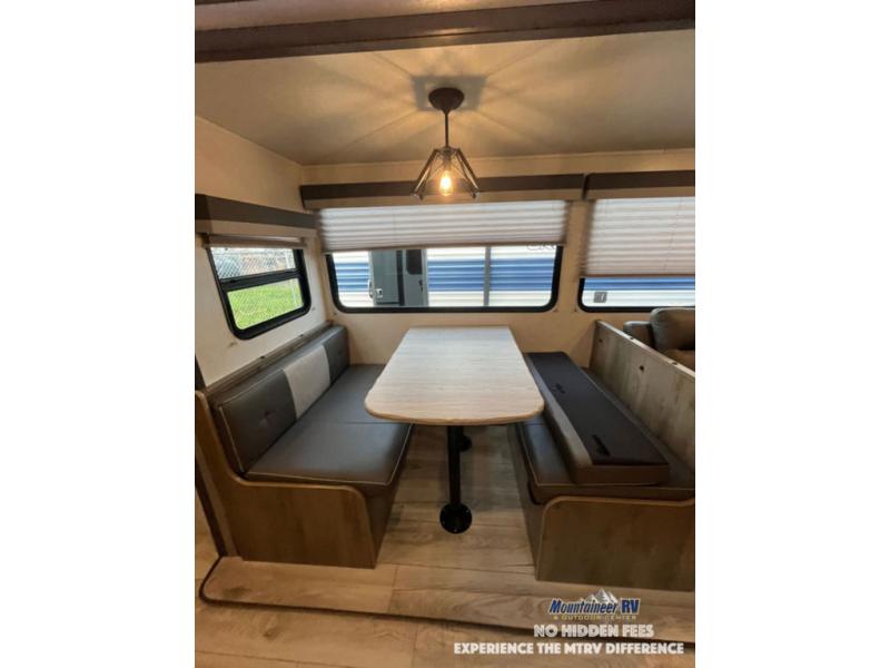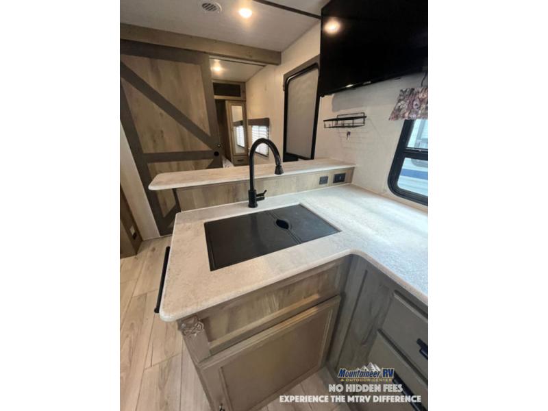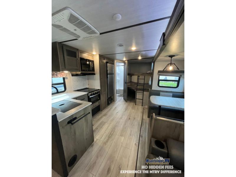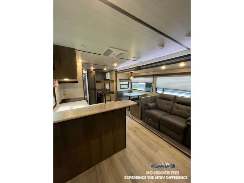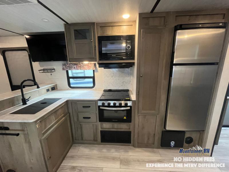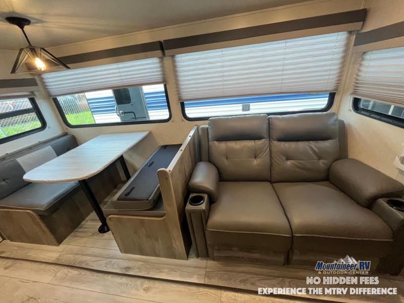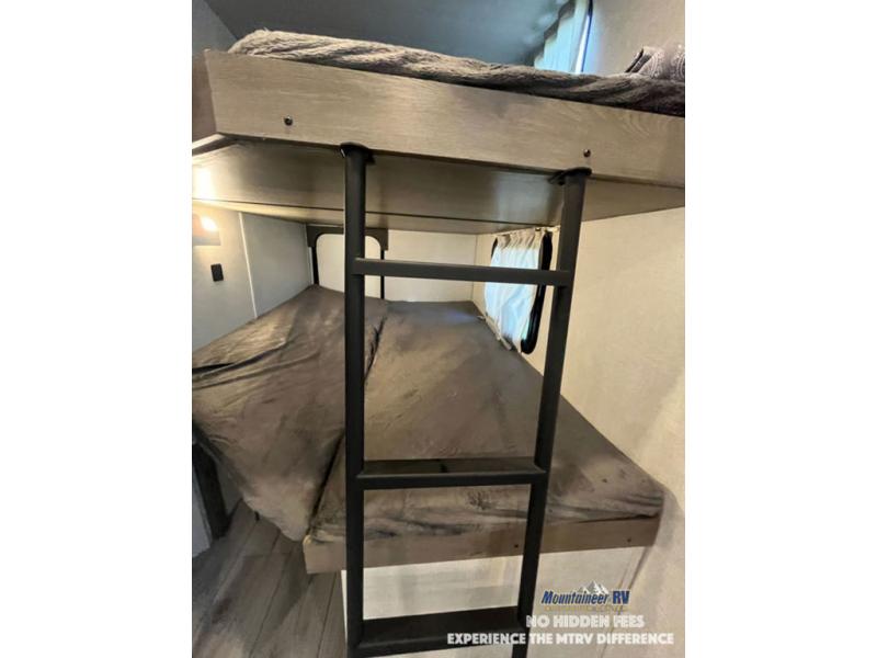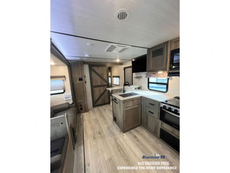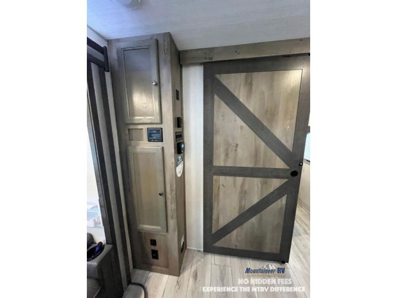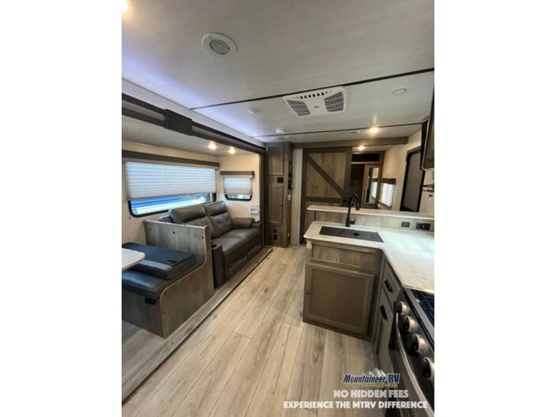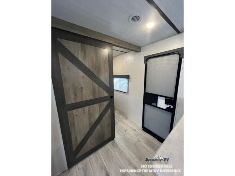 This dual entry travel trailer is the ultimate getaway for your weekend trips to the lake. You can easily bring along the mountain bikes with the under-bunk storage, and the rear storage door will make it easy to get them out when you're ready to ride. Within the large slide out you'll find a booth dinette and tri-fold sofa for seating and sleeping space, plus there is a breakfast bar with stools the little ones are sure to love. Check out the beautiful barn doors that lead to the front bedroom where you'll find a queen-size bed and dual wardrobes. Don't let this travel trailer slip away!
